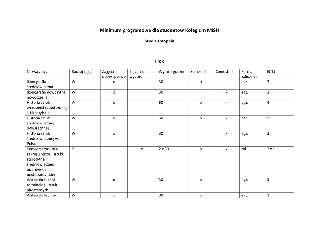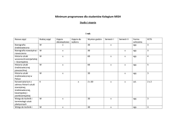 Minimum programowe dla studentów Kolegium MISH Studia I stopnia I rok Nazwa zajęć Rodzaj zajęć Ikonografia średniowieczna Ikonografia nowożytna i nowoczesna Historia sztuki wczesnochrześcijańskiej i bizantyjskiej Historia sztuki średniowiecznej powszechnej Historia sztuki średniowiecznej w Polsce Konwersatorium z zakresu historii sztuki starożytnej, średniowiecznej, bizantyjskiej i postbizantyjskiej Wstęp do technik i terminologii sztuk plastycznych Wstęp do technik i W Zajęcia Zajęcia do obowiązkowe wyboru x Wymiar godzin 30 Semestr I Semestr II Forma zaliczenia egz. ECTS x egz. 3 x 3 W x 30 W x 60 x x egz. 4 W x 60 x x egz. 5 W x 30 x egz. 3 x zal. 2x2 K x 2 x 30 x W x 30 x egz. 3 W x 30 x egz. 3 terminologii rzemiosła artystycznego i designu Wstęp do technik i terminologii architektury Wstęp do nowoczesnych technik i mediów W x 30 W x 30 x x egz. 3 egz. 3 II rok Nazwa zajęć Rodzaj zajęć Historia sztuki nowożytnej powszechnej Historia sztuki nowożytnej polskiej Konwersatorium z historii sztuki nowożytnej Dzieje myśli o sztuce Warsztat metodologiczny historyka sztuki Proseminarium licencjackie W W Zajęcia obowiązkowe x x K W ĆW S Zajęcia do wyboru x x x x Wymiar godzin Semestr I Semestr II 60 x x Forma zaliczenia egz. ECTS 60 x x egz. 5 2 x 30 x x zal. 2x2 60 30 x x x egz. zal. 6 3 1 x 60 x x zal. 1x5 5 III rok Nazwa zajęć Rodzaj zajęć Historia sztuki nowoczesnej powszechnej Historia sztuki nowoczesnej polskiej Historia sztuki współczesnej powszechnej Historia sztuki współczesnej polskiej Konwersatorium z zakresu historii sztuki nowoczesnej lub współczesnej Seminarium licencjackie Praktyka inwentaryzacyjna/muzealna W Zajęcia Zajęcia do obowiązkowe wyboru x Wymiar godzin Semestr I 60 x x Forma zaliczenia egz. x x egz. 5 x egz. 3 egz. 3 W x 60 W x 30 W x 30 x Semestr II ECTS 5 K x 2 x 30 x x zal. 2x2 S P x x 60 2 tygodnie x x x x zal. zal. 12 4