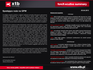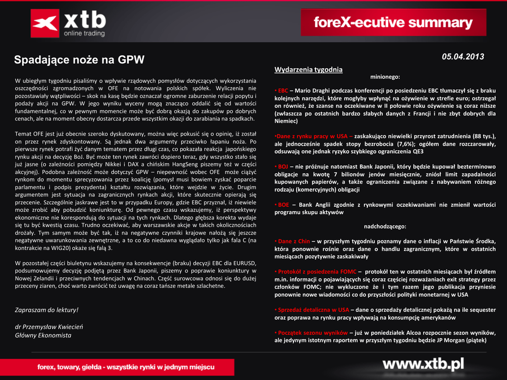05.04.2013 Spadające noże na GPW Wydarzenia tygodnia W ubiegłym tygodniu pisaliśmy o wpływie rządowych pomysłów dotyczących wykorzystania oszczędności zgromadzonych w OFE na notowania polskich spółek. Wyliczenia nie pozostawiały wątpliwości – skok na kasę będzie oznaczał ogromne zaburzenie relacji popytu i podaży akcji na GPW. W jego wyniku wyceny mogą znacząco oddalić się od wartości fundamentalnej, co w pewnym momencie może być dobrą okazją do zakupów po dobrych cenach, ale na moment obecny dostarcza przede wszystkim okazji do zarabiania na spadkach. Temat OFE jest już obecnie szeroko dyskutowany, można więc pokusić się o opinię, iż został on przez rynek zdyskontowany. Są jednak dwa argumenty przeciwko łapaniu noża. Po pierwsze rynek potrafi żyć danym tematem przez długi czas, co pokazała reakcja japońskiego rynku akcji na decyzję BoJ. Być może ten rynek zawróci dopiero teraz, gdy wszystko stało się już jasne (o zależności pomiędzy Nikkei i DAX a chińskim HangSeng piszemy też w części akcyjnej). Podobna zależność może dotyczyć GPW – niepewność wobec OFE może ciążyć rynkom do momentu sprecyzowania przez koalicję (pomysł musi bowiem zyskać poparcie parlamentu i podpis prezydenta) kształtu rozwiązania, które wejdzie w życie. Drugim argumentem jest sytuacja na zagranicznych rynkach akcji, które skutecznie opierają się przecenie. Szczególnie jaskrawe jest to w przypadku Europy, gdzie EBC przyznał, iż niewiele może zrobić aby pobudzić koniunkturę. Od pewnego czasu wskazujemy, iż perspektywy ekonomiczne nie korespondują do sytuacji na tych rynkach. Dlatego głębsza korekta wydaje się tu być kwestią czasu. Trudno oczekiwać, aby warszawskie akcje w takich okolicznościach drożały. Tym samym może być tak, iż na negatywne czynniki krajowe nałożą się jeszcze negatywne uwarunkowania zewnętrzne, a to co do niedawna wyglądało tylko jak fala C (na kontrakcie na WIG20) okaże się falą 3. W pozostałej części biuletynu wskazujemy na konsekwencje (braku) decyzji EBC dla EURUSD, podsumowujemy decyzję podjętą przez Bank Japonii, piszemy o poprawie koniunktury w Nowej Zelandii i przeciwnych tendencjach w Chinach. Część surowcowa odnosi się do dużej przeceny ziaren, choć warto zwrócić też uwagę na coraz tańsze metale szlachetne. Zapraszam do lektury! dr Przemysław Kwiecień Główny Ekonomista minionego: • EBC – Mario Draghi podczas konferencji po posiedzeniu EBC tłumaczył się z braku kolejnych narzędzi, które mogłyby wpłynąć na ożywienie w strefie euro; ostrzegał on również, że szanse na oczekiwane w II połowie roku ożywienie są coraz niższe (zwłaszcza po ostatnich bardzo słabych danych z Francji i nie zbyt dobrych dla Niemiec) •Dane z rynku pracy w USA – zaskakująco niewielki przyrost zatrudnienia (88 tys.), ale jednocześnie spadek stopy bezrobocia (7,6%); ogółem dane rozczarowały, odsuwają one jednak ryzyko szybkiego ograniczenia QE3 • BOJ – nie próżnuje natomiast Bank Japonii, który będzie kupował bezterminowo obligacje na kwotę 7 bilionów jenów miesięcznie, zniósł limit zapadalności kupowanych papierów, a także ograniczenia związane z nabywaniem różnego rodzaju (komercyjnych) obligacji • BOE – Bank Anglii zgodnie z rynkowymi oczekiwaniami nie zmienił wartości programu skupu aktywów nadchodzącego: • Dane z Chin – w przyszłym tygodniu poznamy dane o inflacji w Państwie Środka, która ponownie rośnie oraz dane o handlu zagranicznym, które w ostatnich miesiącach pozytywnie zaskakiwały • Protokół z posiedzenia FOMC – protokół ten w ostatnich miesiącach był źródłem m.in. informacji o pojawiających się coraz częściej rozważaniach exit strategy przez członków FOMC; nie wykluczone że i tym razem jego publikacja przyniesie ponownie nowe wiadomości co do przyszłości polityki monetarnej w USA • Sprzedaż detaliczna w USA – dane o sprzedaży detalicznej pokażą na ile sequester oraz poprawa na rynku pracy wpływają na konsumpcję amerykanów • Początek sezonu wyników – już w poniedziałek Alcoa rozpocznie sezon wyników, ale jedynym istotnym raportem w przyszłym tygodniu będzie JP Morgan (piątek) EURUSD Pierwsze minuty konferencji prezesa EBC przyniosły zauważalną przecenę euro. Draghi, który do tej pory utrzymywał optymistyczną wizję, zakładającą, iż poprawa sytuacji na rynkach finansowych przełoży się na ożywienie w strefie euro, odnotował wyraźne pogorszenie koniunktury. Na tym zdecydowanie tak prezesa, jak i rynków sie zakończyło. EBC chciałby pomóc, ale nie widzi narzędzi, które mógłby efektywnie wykorzystać. Po publikacji danych ze strefy euro za marzec stało się jasnym, iż nie możemy mówić o ożywieniu gospodarczym. Co więcej, nie tylko sytuacja na południu pozostaje zła, ale wyraźne spowolnienie dotyka także Francji, o czym miałem okazję pisać na łamach tej kolumny przed dwoma tygodniami. W tej sytuacji trudno było oczekiwać, iż prezes będzie utrzymywał swój optymistyczny ton. Faktycznie odnotował on, iż nawet w krajach, gdzie nie uwarunkowania rynkowe są sprzyjające – mając na myśli właśnie Francję, koniunktura pogarsza się. Kolejnym naturalnym krokiem wydawałoby się podjęcie kolejnych działań przez bank centralny. Z wypowiedzi prezesa można było wyczytać chęć i potrzebę podjęcia takich działań. Na tym jednak koniec. Większość czasu poświęconego omówieniu narzędzi polityki monetarnej Draghi wykorzystał na tłumaczenie, dlaczego stosowane dotychczas metody, nie przyniosłyby pożądanych rezultatów, gdyby zastosowano je w większych dawkach. Draghi mówił tu o niższych stopach procentowych, LTRO i mechanizmie refinansowania pożyczek dla małych i średnich firm. Trudno nie zgodzić się z prezesem w tej argumentacji. Rynkowa stopa jest obecnie bliska zeru i kolejnym krokiem musiałob
