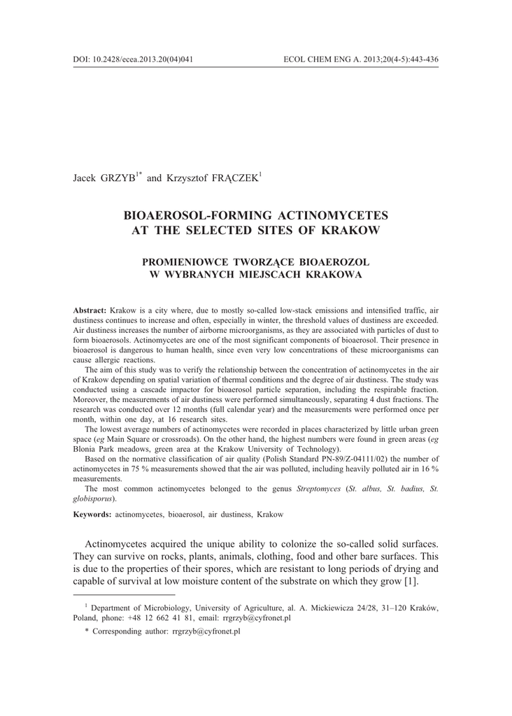 DOI: 10.2428/ecea.2013.20(04)041 ECOL CHEM ENG A. 2013;20(4-5):443-436 Jacek GRZYB1* and Krzysztof FR¥CZEK1 BIOAEROSOL-FORMING ACTINOMYCETES AT THE SELECTED SITES OF KRAKOW PROMIENIOWCE TWORZ¥CE BIOAEROZOL W WYBRANYCH MIEJSCACH KRAKOWA Abstract: Krakow is a city where, due to mostly so-called low-stack emissions and intensified traffic, air dustiness continues to increase and often, especially in winter, the threshold values of dustiness are exceeded. Air dustiness increases the number of airborne microorganisms, as they are associated with particles of dust to form bioaerosols. Actinomycetes are one of the most significant components of bioaerosol. Their presence in bioaerosol is dangerous to human health, since even very low concentrations of these microorganisms can cause allergic reactions. The aim of this study was to verify the relationship between the concentration of actinomycetes in the air of Krakow depending on spatial variation of thermal conditions and the degree of air dustiness. The study was conducted using a cascade impactor for bioaerosol particle separation, including the respirable fraction. Moreover, the measurements of air dustiness were performed simultaneously, separating 4 dust fractions. The research was conducted over 12 months (full calendar year) and the measurements were performed once per month, within one day, at 16 research sites. The lowest average numbers of actinomycetes were recorded in places characterized by little urban green space (eg Main Square or crossroads). On the other hand, the highest numbers were found in green areas (eg Blonia Park meadows, green area at the Krakow University of Technology). Based on the normative classification of air quality (Polish Standard PN-89/Z-04111/02) the number of actinomycetes in 75 % measurements showed that the air was polluted, including heavily polluted air in 16 % measurements. The most common actinomycetes belonged to the genus Streptomyces (St. albus, St. badius, St. globisporus). Keywords: actinomycetes, bioaerosol, air dustiness, Krakow Actinomycetes acquired the unique ability to colonize the so-called solid surfaces. They can survive on rocks, plants, animals, clothing, food and other bare surfaces. This is due to the properties of their spores, which are resistant to long periods of drying and capable of survival at low moisture content of the substrate on which they grow [1]. 1 Department of Microbiology, University of Agriculture, al. A. Mickiewicza 24/28, 31–120 Kraków, Poland, phone: +48 12 662 41 81, email: [email protected] * Corresponding author: [email protected] 444 Jacek Grzyb and Krzysztof Fr¹czek Actinomycetes are one of the important components of bioaerosol. Actinomycetes, mostly in the form of spores, have been identified in the air for a few decades. Until now, the mechanism of their release into the atmosphere has not been fully understood. It is suggested that they can be released into the air as a result of mechanical damage to surface on which they grow, eg during agrotechnical operations or strong wind they can be raised from soil surface, in which they develop extensively. Due to their smaller size, it is more difficult for actinomycete spores to transform into bioaerosol phase than for fungal spores [1, 2]. The share of actinomycete spores significantly increases in the bioaerosol fraction below 3.3 mm [3]. The airborne spores of at least several actinomycete species (eg Streptomyces albus) have proven their allergic effects. Research has shown that actinomycete spores stimulate macrophages in the lungs, resulting in inflammation and tissue damage [4, 5]. Dusts have also a large share in atmospheric pollution. They originate in the processes of combustion of solid fuels (municipal and household sector), liquid fuels (car engines), in industrial processes and in natural phenomena (eg volcanic eruptions). Dust particles with a diameter below 10 micrometers are considered as one of the most toxic components of air; therefore in the European Union dust PM 10 is currently the primary indicator of air quality [6]. Krakow is a city, where due to mostly so-called low-stack emissions and intensified traffic, air dustiness continues to increase and often, especially in winter, the threshold values of dustiness are exceeded. Air dustiness stimulates the increase in the number of airborne microorganisms, since they associate with dust particles to form bioaerosol [7]. The aim of this study was to verify the relationship between the concentration of airborne actinomycetes in Krakow, spatial variability of thermal conditions and the air dustiness level. Material and methods The study was conducted over 12 months (full calendar year) during the period from March 2010 to February 2011 in order to detect both the changes in temperature and in the quantitative and qualitative composition of microflora between the seasons of the year – once per month, during one day, at 16 research sites. At the same time, dustiness and microclimatic parameters (temperature, atmospheric pressure, wind energy, relative humidity) were measured at the designated sites to correlate all measured values. The research sites were selected based on the deviations from the mean annual temperature in Krakow, including: – 7 sites characterized with temperatures below the average temperature in Krakow, – 7 sites, where the temperature is above the average, – 2 sites, which the results from the above-mentioned sites were related to: the first one, with the temperature equal to the average recorded in Krakow and the second one: control site outside Krakow (Table 1). Bioaerosol-Forming Actinomycetes at the Selected Sites of Krakow 445 Table 1 Comparison of research sites Control site (outside Krakow) (C) C Control site Libertow – 400 m from the “Zakopianka” road – above the basin, where Krakow is located The research sites with temperatures below the average temperature in Krakow (B1–B7) B1 B2 B3 B4 B5