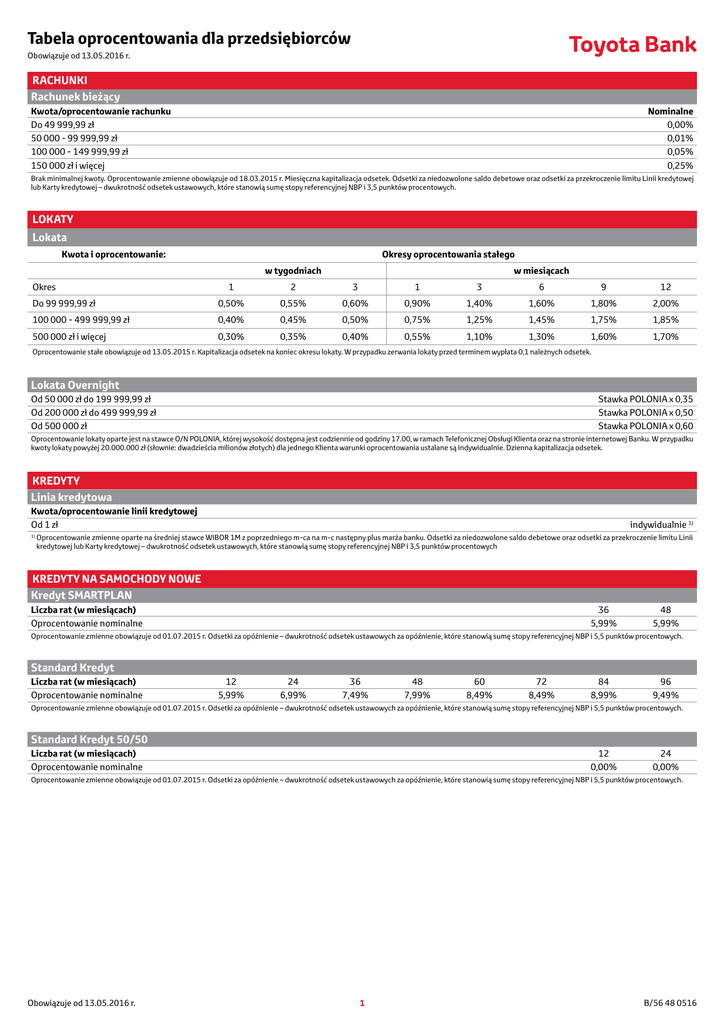 Tabela oprocentowania dla przedsiębiorców Obowiązuje od 13.05.2016 r. RACHUNKI Rachunek bieżący Kwota/oprocentowanie rachunku Do 49 999,99 zł 50 000 - 99 999,99 zł 100 000 - 149 999,99 zł 150 000 zł i więcej Nominalne 0,00% 0,01% 0,05% 0,25% Brak minimalnej kwoty. Oprocentowanie zmienne obowiązuje od 18.03.2015 r. Miesięczna kapitalizacja odsetek. Odsetki za niedozwolone saldo debetowe oraz odsetki za przekroczenie limitu Linii kredytowej lub Karty kredytowej – dwukrotność odsetek ustawowych, które stanowią sumę stopy referencyjnej NBP i 3,5 punktów procentowych. LOKATY Lokata Kwota i oprocentowanie: Okresy oprocentowania stałego w tygodniach Okres 1 2 w miesiącach 3 1 3 6 9 12 Do 99 999,99 zł 0,50% 0,55% 0,60% 0,90% 1,40% 1,60% 1,80% 2,00% 100 000 - 499 999,99 zł 0,40% 0,45% 0,50% 0,75% 1,25% 1,45% 1,75% 1,85% 500 000 zł i więcej 0,30% 0,35% 0,40% 0,55% 1,10% 1,30% 1,60% 1,70% Oprocentowanie stałe obowiązuje od 13.05.2015 r. Kapitalizacja odsetek na koniec okresu lokaty. W przypadku zerwania lokaty przed terminem wypłata 0,1 należnych odsetek. Lokata Overnight Od 50 000 zł do 199 999,99 zł Od 200 000 zł do 499 999,99 zł Od 500 000 zł Stawka POLONIA x 0,35 Stawka POLONIA x 0,50 Stawka POLONIA x 0,60 Oprocentowanie lokaty oparte jest na stawce O/N POLONIA, której wysokość dostępna jest codziennie od godziny 17.00, w ramach Telefonicznej Obsługi Klienta oraz na stronie internetowej Banku. W przypadku kwoty lokaty powyżej 20.000.000 zł (słownie: dwadzieścia milionów złotych) dla jednego Klienta warunki oprocentowania ustalane są indywidualnie. Dzienna kapitalizacja odsetek. KREDYTY Linia kredytowa Kwota/oprocentowanie linii kredytowej Od 1 zł 1) indywidualnie 1) procentowanie zmienne oparte na średniej stawce WIBOR 1M z poprzedniego m-ca na m-c następny plus marża banku. Odsetki za niedozwolone saldo debetowe oraz odsetki za przekroczenie limitu Linii O kredytowej lub Karty kredytowej – dwukrotność odsetek ustawowych, które stanowią sumę stopy referencyjnej NBP i 3,5 punktów procentowych KREDYTY NA SAMOCHODY NOWE Kredyt SMARTPLAN Liczba rat (w miesiącach) Oprocentowanie nominalne 36 5,99% 48 5,99% Oprocentowanie zmienne obowiązuje od 01.07.2015 r. Odsetki za opóźnienie – dwukrotność odsetek ustawowych za opóźnienie, które stanowią sumę stopy referencyjnej NBP i 5,5 punktów procentowych. Standard Kredyt Liczba rat (w miesiącach) Oprocentowanie nominalne 12 5,99% 24 6,99% 36 7,49% 48 7,99% 60 8,49% 72 8,49% 84 8,99% 96 9,49% Oprocentowanie zmienne obowiązuje od 01.07.2015 r. Odsetki za opóźnienie – dwukrotność odsetek ustawowych za opóźnienie, które stanowią sumę stopy referencyjnej NBP i 5,5 punktów procentowych. Standard Kredyt 50/50 Liczba rat (w miesiącach) Oprocentowanie nominalne 12 0,00% 24 0,00% Oprocentowanie zmienne obowiązuje od 01.07.2015 r. Odsetki za opóźnienie – dwukrotność odsetek ustawowych za opóźnienie, które stanowią sumę stopy referencyjnej NBP i 5,5 punktów procentowych. Obowiązuje od 13.05.2016 r. 1 B/56 48 0516 Tabela oprocentowania dla przedsiębiorców Obowiązuje od 13.05.2016 r. KREDYTY NA SAMOCHODY UŻYWANE Kredyt SMARTPLAN Liczba rat (w miesiącach) Oprocentowanie nominalne 36 6,99% 48 6,99% Oprocentowanie zmienne obowiązuje od 01.07.2015 r. Odsetki za opóźnienie – dwukrotność odsetek ustawowych za opóźnienie, które stanowią sumę stopy referencyjnej NBP i 5,5 punktów procentowych. Standard Kredyt Liczba rat (w miesiącach) Oprocentowanie nominalne 12 6,99% 24 7,99% 36 8,49% 48 8,99% 60 8,99% 72 9,49% 84 9,99% 96 9,99% Oprocentowanie zmienne obowiązuje od 01.07.2015 r. Odsetki za opóźnienie – dwukrotność odsetek ustawowych za opóźnienie, które stanowią sumę stopy referencyjnej NBP i 5,5 punktów procentowych. Standard Kredyt 50/50 Liczba rat (w miesiącach) Oprocentowanie nominalne 12 0,00% 24 0,00% Oprocentowanie zmienne obowiązuje od 01.07.2015 r. Odsetki za opóźnienie – dwukrotność odsetek ustawowych za opóźnienie, które stanowią sumę stopy referencyjnej NBP i 5,5 punktów procentowych. Standard Pożyczka bez AC Liczba rat (w miesiącach) Oprocentowanie nominalne 12 6,99% 24 7,99% 36 8,99% 48 9,99% 60 9,99% Oprocentowanie zmienne obowiązuje od 01.07.2015 r. Odsetki za opóźnienie – dwukrotność odsetek ustawowych za opóźnienie, które stanowią sumę stopy referencyjnej NBP i 5,5 punktów procentowych. Obowiązuje od 13.05.2016 r. 2 B/56 48 0516