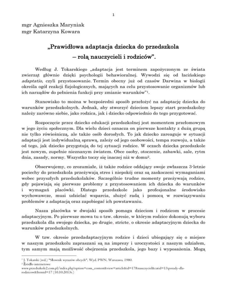 1 mgr Agnieszka Maryniak mgr Katarzyna Kowara „Prawidłowa adaptacja dziecka do przedszkola – rolą nauczycieli i rodziców”. Według J. Tokarskiego „adaptacja jest terminem zapożyczonym ze świata zwierząt głównie dzięki psychologii behawioralnej. Wywodzi się od łacińskiego adaptatio, czyli przystosowanie. Termin obecny już od czasów Darwina w biologii określa ogół reakcji fizjologicznych, mających na celu przystosowanie organizmów lub ich narządów do pełnienia funkcji przy zmianie warunków”1. Stanowisko to można w bezpośredni sposób przełożyć na adaptację dziecka do warunków przedszkolnych. Jednak, aby stworzyć dzieciom lepszy start przedszkolny należy zarówno siebie, jako rodzica, jak i dziecko odpowiednio do tego przygotować. Rozpoczęcie przez dziecko edukacji przedszkolnej jest momentem przełomowym w jego życiu społecznym. Dla wielu dzieci oznacza on pierwsze kontakty z dużą grupą nie tylko rówieśniczą, ale także osób dorosłych. To jak dziecko zareaguje w sytuacji adaptacji jest indywidualną sprawą, zależy od jego osobowości, tempa rozwoju, a także od tego, jak dziecko przygotują do tej sytuacji rodzice. W oczach dziecka przedszkole jest nowym, zupełnie nieznanym światem. Obce osoby, otoczenie, zabawki, sale, rytm dnia, zasady, normy. Wszystko toczy się inaczej niż w domu2. Obserwujemy, co zrozumiałe, iż także rodzice oddający swoje zwłaszcza 3-letnie pociechy do przedszkola przeżywają stres i niepokój oraz są zaskoczeni wymaganiami wobec przyszłych przedszkolaków. Szczególnie trudne momenty przeżywają rodzice, gdy pojawiają się pierwsze problemy z przystosowaniem ich dziecka do warunków i wymagań placówki. Dlatego przedszkole jako profesjonalne środowisko wychowawcze, musi udzielać wsparcia, służyć radą i pomocą w rozwiązywaniu problemów z adaptacją oraz zapobiegać ich powstawaniu. Nasza placówka w dwojaki sposób pomaga dzieciom i rodzicom w procesie adaptacyjnym. Po pierwsze mowa tu o tzw. okresie, w którym rodzice dokonują wyboru przedszkola dla swojego dziecka, po drugie, stricte, o okresie adaptacyjnym dziecka do warunków przedszkolnych. W tzw. okresie przedadaptacyjnym rodzice i dzieci ubiegający się o miejsce w naszym przedszkolu zapraszani są na imprezy i uroczystości z naszym udziałem, tym samym mają możliwość obejrzenia przedszkola, jego bazy i wyposażenia. Mogą J. Tokarski (red.) "Słownik wyrazów obcych", Wyd. PWN, Warszawa, 1980. Źródło internetowe www.przedszkole2.com.pl/index.php?option=com_content&view=article&id=178:nauczyciel&catid=13:porady-dlarodzicow&Itemid=17 (10.10.2013r.) 1 2 2 zapoznać się nauczycielami, programem nauczania i wymogami przedszkola, a także mieć możliwość rozmowy z dyrektorem o ofercie i celach pracy placówki. Jest to ważne, chociażby z uwagi na bezpieczeństwo i zdrowie dzieci, np. alergicznych, wymagających stałego nadzoru nad specjalistycznymi dietami. Pomocne w tym względzie są także inne kanały informacyjne, tj. strona internetowa przedszkola, gazetki i ogłoszenia dla rodziców o tematyce adaptacji dziecka do przedszkola. Z drugiej strony nauczycielki corocznie opracowują szczegółowy plan działań adaptacyjnych związany nie tylko z przebiegiem zajęć, ale także ze wsparciem rodziców. Adaptacja dziecka 3,4-letniego rozpoczyna się z chwilą przekroczenia przez nie i rodziców progu przedszkola w czerwcu na pierwszych zajęciach z nauczycielami i personelem pomocniczym. Z reguły zajęcia te rozpoczynają się od wyjaśnienia ich specyfiki, omówienia przebiegu i oczekiwań nauczycieli. Zajęcia adaptacyjne mają charakter stopniowania trudności. Pierwszy dzień polega na zabawach dowolnych z rówieśnikami w sali i ogrodzie, oswajaniu się z nową sytuacja, otoczeniem, meblami, zabawkami, zapoznaniem się z nauczycielkami. Drugi dzień to zabawy kierowane przez nauczycieli, z udziałem i przy pomocy rodziców, podejmowanie pierwszych prób wspólnych zabaw z piosenką, wierszem, zabawy inscenizowane ruchem, zabawy plastyczne, zabawy z wykorzystaniem chusty animacyjnej, wyjście do ogrodu przedszkolnego. Trzeci dzień, to zazwyczaj próba rozstania rodziców z dziećmi, kiedy dzieci pozostają w grupie z nauczycielkami, starającymi się przeprowadzić pierwsze krótkie zajęcia dydaktyczne z wykorzystaniem ciekawych środków dydaktycznych. Poziom i przebieg tych zajęć uwzględnia wiek, możliwości i zainteresowania dzieci. Długość zajęć wyznacza zaciekawienie dzieci. Po zajęciach omawia się z rodzicami postępy dzieci, ich zaangażowanie oraz wyznacza się kierunki do dalszej pracy, tak by jak najlepiej przygotować dzieci do kolejnego etapu adaptacyjnego w sierpniu i w rezultacie uczęszczania od września do przedszkola. Zajęcia w sierpniu mają podobny przebieg, z tym, że są nieco bardziej rozbudowane. Istotnym elementem adaptacji jest również rozmowa nauczyciela z rodzicem. Po każdych zajęciach adaptacyjnych nauczyciele powinni być dostępni dla rodziców, wyjaśniać ich obawy, służyć radą, pomocą, dawać wskazówki do dalszej pracy, usamodzielniania dzieci czy rozwijania ich zainteresowań. Adaptacja do przedszkola dotyczy także dzieci 4 i 5 - letnich. Generalnie nie skupia się ona tak bardzo na zaspokajaniu czynności samoobsługowych i higienicznych, ale częściej polega na włączeniu dziecka w daną grupę rówieśniczą, w już panujące relacje koleżeńskie. Ważnym aspektem ze strony nauczycieli, jest włączanie dziecka w zajęcia dydaktyczne, ośmielanie na tle grupy, stopniowe włączanie w zabawy rówieśnicze i ruchowe, zachęcanie dziecka do zawierania pierwszych przyjaźni. Do pobudzenia zainteresowania dziecka przedszkolem oraz wyzwolenia motywacji i chęci współdziałania należy szukać talentów, mocnych stron 3 i zainteresowań. W razie konieczności należy udzielić dziecku specjalistycznej opieki i pomocy ze strony logopedy i psychologa. Nie wol