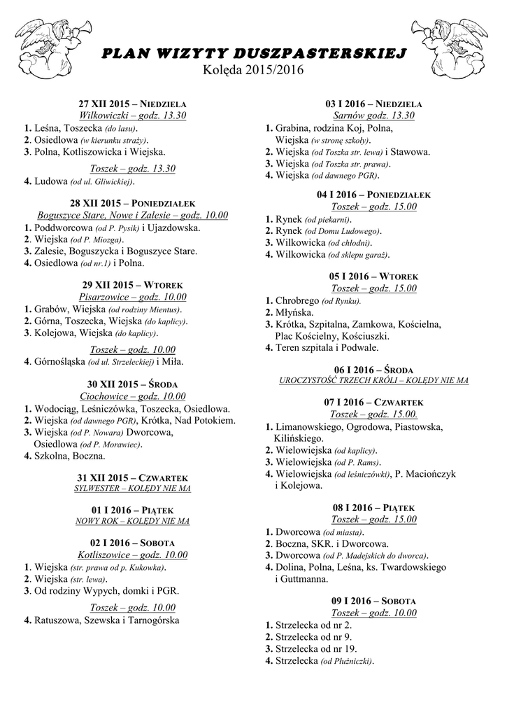 Kolęda 2015/2016 27 XII 2015 – NIEDZIELA Wilkowiczki – godz. 13.30 1. Leśna, Toszecka (do lasu). 2. Osiedlowa (w kierunku straży). 3. Polna, Kotliszowicka i Wiejska. Toszek – godz. 13.30 4. Ludowa (od ul. Gliwickiej). 28 XII 2015 – PONIEDZIAŁEK Boguszyce Stare, Nowe i Zalesie – godz. 10.00 1. Poddworcowa (od P. Pysik) i Ujazdowska. 2. Wiejska (od P. Miozga). 3. Zalesie, Boguszycka i Boguszyce Stare. 4. Osiedlowa (od nr.1) i Polna. 29 XII 2015 – WTOREK Pisarzowice – godz. 10.00 1. Grabów, Wiejska (od rodziny Mientus). 2. Górna, Toszecka, Wiejska (do kaplicy). 3. Kolejowa, Wiejska (do kaplicy). Toszek – godz. 10.00 4. Górnośląska (od ul. Strzeleckiej) i Miła. 30 XII 2015 – ŚRODA Ciochowice – godz. 10.00 1. Wodociąg, Leśniczówka, Toszecka, Osiedlowa. 2. Wiejska (od dawnego PGR), Krótka, Nad Potokiem. 3. Wiejska (od P. Nowara) Dworcowa, Osiedlowa (od P. Morawiec). 4. Szkolna, Boczna. 31 XII 2015 – CZWARTEK SYLWESTER – KOLĘDY NIE MA 01 I 2016 – PIĄTEK NOWY ROK – KOLĘDY NIE MA 02 I 2016 – SOBOTA Kotliszowice – godz. 10.00 1. Wiejska (str. prawa od p. Kukowka). 2. Wiejska (str. lewa). 3. Od rodziny Wypych, domki i PGR. Toszek – godz. 10.00 4. Ratuszowa, Szewska i Tarnogórska 03 I 2016 – NIEDZIELA Sarnów godz. 13.30 1. Grabina, rodzina Koj, Polna, Wiejska (w stronę szkoły). 2. Wiejska (od Toszka str. lewa) i Stawowa. 3. Wiejska (od Toszka str. prawa). 4. Wiejska (od dawnego PGR). 04 I 2016 – PONIEDZIAŁEK Toszek – godz. 15.00 1. Rynek (od piekarni). 2. Rynek (od Domu Ludowego). 3. Wilkowicka (od chłodni). 4. Wilkowicka (od sklepu garaż). 05 I 2016 – WTOREK Toszek – godz. 15.00 1. Chrobrego (od Rynku). 2. Młyńska. 3. Krótka, Szpitalna, Zamkowa, Kościelna, Plac Kościelny, Kościuszki. 4. Teren szpitala i Podwale. 06 I 2016 – ŚRODA UROCZYSTOŚĆ TRZECH KRÓLI – KOLĘDY NIE MA 07 I 2016 – CZWARTEK Toszek – godz. 15.00. 1. Limanowskiego, Ogrodowa, Piastowska, Kilińskiego. 2. Wielowiejska (od kaplicy). 3. Wielowiejska (od P. Rams). 4. Wielowiejska (od leśniczówki), P. Maciończyk i Kolejowa. 08 I 2016 – PIĄTEK Toszek – godz. 15.00 1. Dworcowa (od miasta). 2. Boczna, SKR. i Dworcowa. 3. Dworcowa (od P. Madejskich do dworca). 4. Dolina, Polna, Leśna, ks. Twardowskiego i Guttmanna. 09 I 2016 – SOBOTA Toszek – godz. 10.00 1. Strzelecka od nr 2. 2. Strzelecka od nr 9. 3. Strzelecka od nr 19. 4. Strzelecka (od Płużniczki). 10 I 2016 – NIEDZIELA Toszek – godz. 13.30 1. Gliwicka (od Pyskowic). 2. Gliwicka od nr.1. 3. Gliwicka (od dawnego Reda). 4. Wolności (od P. Bieniek) i Powstańców. 14 I 2016 – CZWARTEK Toszek – godz. 15.00 1. K. Miarki (od Gliwickiej). 2. K. Miarki (od boiska). 3. Wąska (od Gliwickiej), Reymonta, G. Morcinka nr. 1–6. 4. Wąska (od Pisarzowic), Dzierżonia. 11 I 2016 – PONIEDZIAŁEK Toszek – godz. 15.00 1. St. Młyn, Harcerska, Sarnowska. 2. M. Konopnickiej (od basenu). 3. M. Konopnickiej (od P. Malinowskich). 4. M. Konopnickiej (od Sarnowskiej). 15 I 2016 – PIĄTEK Toszek – godz. 15.00 1. G. Morcinka nr. 33, 35, 37. 2. G. Morcinka nr. 39, 41. 3. G. Morcinka nr. 43, 45. 4. G. Morcinka nr. 47, 49, 51. 12 I 2016 – WTOREK Toszek – godz. 15.00 1. Oracze (od P. Haltof i Wycisk). 2. Oracze (od P. Kwaśniok). 3. Oracze (od P. Konopka). 16 I 2016 – SOBOTA Toszek – godz. 10.00 1. G. Morcinka nr. 9, 11, 13. 2. G. Morcinka nr. 15, 17, 19. 3. G. Morcinka nr. 21, 23, 25. 4. G. Morcinka nr. 27, 29, 31. 13 I 2016 – ŚRODA Toszek – godz. 15.00 1. Krasińskiego (od P. Thiel) i Eichendorfa (od P. Morawiec). 2. Poprzeczna (od P. Kurek). 3. Głowackiego. 4. Mickiewicza, Słowackiego, Skłodowskiej. 17 I 2016 – NIEDZIELA Kolęda na życzenie – godz. 13.30 Prosimy o wcześniejsze zgłoszenie w kancelarii. W NIEDZIELĘ (17 I 2016) POKŁOSIE KOLĘDOWE.