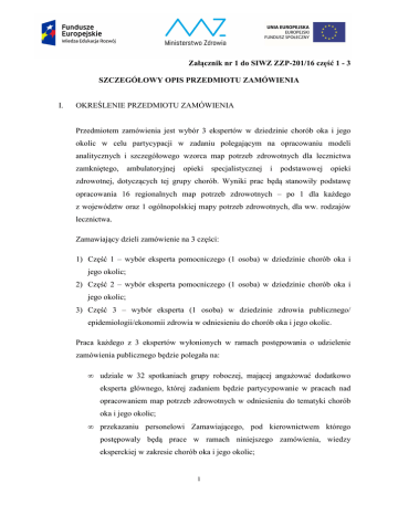 Załącznik nr 1 do SIWZ ZZP-201/16 część 1 - 3 SZCZEGÓŁOWY OPIS PRZEDMIOTU ZAMÓWIENIA I. OKREŚLENIE PRZEDMIOTU ZAMÓWIENIA Przedmiotem zamówienia jest wybór 3 ekspertów w dziedzinie chorób oka i jego okolic w celu partycypacji w zadaniu polegającym na opracowaniu modeli analitycznych i szczegółowego wzorca map potrzeb zdrowotnych dla lecznictwa zamkniętego, ambulatoryjnej opieki specjalistycznej i podstawowej opieki zdrowotnej, dotyczących tej grupy chorób. Wyniki prac będą stanowiły podstawę opracowania 16 regionalnych map potrzeb zdrowotnych – po 1 dla każdego z województw oraz 1 ogólnopolskiej mapy potrzeb zdrowotnych, dla ww. rodzajów lecznictwa. Zamawiający dzieli zamówienie na 3 części: 1) Część 1 – wybór eksperta pomocniczego (1 osoba) w dziedzinie chorób oka i jego okolic; 2) Część 2 – wybór eksperta pomocniczego (1 osoba) w dziedzinie chorób oka i jego okolic; 3) Część 3 – wybór eksperta (1 osoba) w dziedzinie zdrowia publicznego/ epidemiologii/ekonomii zdrowia w odniesieniu do chorób oka i jego okolic. Praca każdego z 3 ekspertów wyłonionych w ramach postępowania o udzielenie zamówienia publicznego będzie polegała na: • udziale w 32 spotkaniach grupy roboczej, mającej angażować dodatkowo eksperta głównego, której zadaniem będzie partycypowanie w pracach nad opracowaniem map potrzeb zdrowotnych w odniesieniu do tematyki chorób oka i jego okolic; • przekazaniu personelowi Zamawiającego, pod kierownictwem którego postępowały będą prace w ramach niniejszego zamówienia, wiedzy eksperckiej w zakresie chorób oka i jego okolic; 1 • przekazaniu w sposób przystępny i zwięzły wiedzy na temat postepowań medycznych typowych dla tej grupy chorób; • dzieleniu się wiedzą ekspercką z pozostałymi ekspertami zaangażowanymi w proces opracowywania mapy potrzeb zdrowotnych; • aktywnym udziale w opracowaniu wzorca mapy potrzeb zdrowotnych, zgodnie z podziałem pracy ustalonym w trybie roboczym przez Zamawiającego, stosownie do kompetencji eksperta; • terminowej realizacji prac i przygotowywaniu stosownych materiałów, celem osiągnięcia stanu produktywnej i efektywnej współpracy; • weryfikacji merytorycznej opracowanego wzorca mapy potrzeb zdrowotnych, w opracowywaniu której ekspert ten brał udział. II. Informacja o projekcie Zamówienie realizowane jest w ramach projektu pn. „Mapy potrzeb zdrowotnych – Baza Analiz Systemowych i Wdrożeniowych”, współfinansowanego przez Unię Europejską ze środków Europejskiego Funduszu Społecznego w ramach Programu Operacyjnego Wiedza Edukacja Rozwój. Celem nadrzędnym projektu jest stworzenie systemu mapowania potrzeb zdrowotnych w zakresie 30 grup chorób oraz opracowania bazy analiz systemowych i wdrożeniowych w tym zakresie. System mapowania potrzeb zdrowotnych pozwoli na lepsze zarządzanie środkami publicznymi w ochronie zdrowia, umożliwi wsparcie ich dystrybucji zgodnie z aktualnymi i prognozowanymi potrzebami zdrowotnymi pacjentów. System ten będzie również wspierał podejmowanie decyzji zarządczych i kreowanie polityk w oparciu o fakty. III. ZAKRES CZASOWY I TERYTORIALNY REALIZACJI PRZEDMIOTU ZAMÓWIENIA Każdy z ekspertów weźmie udział w nie więcej niż 32 spotkaniach grup roboczych, w podziale na lata 2016 r. i 2017 r. Spotkania będą się odbywać zgodnie z ustalonym przez Zamawiającego harmonogramem. Wstępny harmonogram, zawierający daty spotkań, zostanie Wykonawcy przekazany razem z projektem umowy do podpisu. Projekt współfinansowany ze środków Unii Europejskiej w ramach Europejskiego Funduszu Społecznego. 2 Zamawiający ma prawo zmiany dni spotkań i harmonogramu, o czym poinformuje Wykonawcę najpóźniej na 2 dni wcześniej. Zamawiający ma prawo zmienić datę spotkania również w terminie późniejszym, po dokonaniu stosowanych uzgodnień z Wykonawcami. Maksymalny czas jednego spotkania to 8 godzin zegarowych. IV. Zakres przedmiotu zamówienia 1) Każdy z ekspertów pomocniczych w ramach pracy w grupie roboczej ds. ds. chorób oka i jego okolic: a) będzie uczestniczył w przygotowaniu i zaprezentowaniu materiału analitycznego na temat 3 głównych (np. najbardziej istotnych, najczęstszych, najbardziej obciążających dla systemu ochrony zdrowia) problemów zdrowotnych dotyczących tematyki chorób oka i jego okolic, b) będzie uczestniczył w przygotowaniu i przedstawieniu uproszczonych schematów postepowań klinicznych dotyczących tej tematyki, wraz ze wskazaniem odpowiednich standardów krajowych i/lub zagranicznych towarzystw medycznych w tym przedmiocie, c) będzie uczestniczył w dokonaniu wskazania kodów ICD-10 reprezentujących jednostki chorobowe w ramach chorób oka i jego okolic, d) będzie uczestniczył w dokonaniu wyodrębnienia w ramach ww. jednostek chorób zbliżonych pod względem postępowania medycznego, e) będzie uczestniczył w zdefiniowaniu i przedstawieniu wskaźników ilościowych pozwalających opisać jakość leczenia w chorób oka i jego okolic, f) na potrzeby stworzenia modelu będzie uczestniczył w procesie zdiagnozowania i przedstawienia trendów zmian w obszarze tej tematyki, włącznie z przedstawieniem fachowej literatury naukowej – polskiej i/lub zagranicznej, g) będzie uczestniczył w przygotowaniu i przedstawieniu interpretacji danych dostępnych w bazach danych NFZ, dotyczących leczenia chorób oka i jego okolic, h) będzie uczestniczył w pozyskaniu i przedstawieniu danych dotyczących leczenia w zakresie tej grupy chorób, pochodzących z innych źródeł, niż bazy NFZ. 2) Ekspert do spraw epidemiologii/zdrowia publicznego/ekonomii zdrowia zaprezentuje innym członkom biorącym udział w spotkaniu materiał na temat 3 głównych (np. najbardziej istotnych, najczęstszych, najbardziej Projekt współfinansowany ze środków Unii Europejskiej w ramach Europejskiego Funduszu Społecznego. 3 obciążających dla systemu ochrony zdrowia) problemów zdrowotn