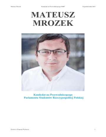 Mateusz Mrozek Kandydat na Przewodniczącego PSRP 24 października 2014 MATEUSZ MROZEK Kandydat na Przewodniczącego Parlamentu Studentów Rzeczypospolitej Polskiej Życiorys i Program Wyborczy 1 Mateusz Mrozek Kandydat na Przewodniczącego PSRP 24 października 2014 Życiorys Jestem pasjonatem i studentem historii na Uniwersytecie Warszawskim, a przede wszystkim aktywnym społecznikiem. Swoje zaangażowanie od kilku lat realizuje poprzez pomoc studentom. Wcześniej w ramach działań podejmowanych przez Samorząd Studentów Uniwersytetu Warszawskiego, a od blisko dwóch lat w Parlamencie Studentów Rzeczypospolitej Polskiej. W przeciągu ostatnich czterech lat pełniłem wiele funkcji i zrealizowałem dużą liczbę zadań i projektów. Byłem przewodniczącym Komisji Dydaktycznej ZSS UW, jak i Komisji Socjalnej ZSS UW. Pełniłem także funkcję Marszałka Parlamentu Studentów UW. W tamtym czasie nabyłem wiele umiejętności i wiedzy związanych ze środowiskiem studenckim. To właśnie wówczas najpełniej realizowała się moja misja współpracy ze studentami. Od początku 2013 roku jestem Przewodniczącym Komisji ds. „Dyskusje – w różnych miejscach, z różnymi ludźmi, Dydaktyki i Jakości Kształcenia Parlamentu Studentów RP. na temat różnorodnych Najważniejszymi zadaniami w problemów – to dla mnie ostatnim okresie mojej pracy był największa samorządowa nadzór i koordynacja wdrażania wartość!” przepisów znowelizowanej ustawy Prawo o szkolnictwie wyższym oraz praca nad systemami zapewniania jakości kształcenia oraz pomocy materialnej. Jako Przewodniczący Komisji ds. Dydaktyki i Jakości Kształcenia Parlamentu Studentów Rzeczypospolitej Polskiej prowadzę działalność związaną z organizacją szkoleń, pomocą w tworzeniu ogólnouczelnianych i ogólnopolskich regulacji, jak i reprezentowanie polskich studentów. Życiorys i Program Wyborczy 2 Mateusz Mrozek Kandydat na Przewodniczącego PSRP 24 października 2014 Na moje doświadczenie składa się także działalność społeczna poza środowiskiem akademickim. Moim hobby jest dobra książka. Pasjonuje mnie również sport i muzyka. Lubię spędzać czas ze znajomymi, bo każdy poznany bliżej człowiek ubogaca naszą osobowość. Dyskusje – w różnych miejscach, z różnymi ludźmi, na temat różnorodnych „Swoje zaangażowanie od problemów – to dla mnie największa kilku lat realizuje poprzez samorządowa wartość! Przez ostatnie dwa lata przebyłem ponad 20 tysięcy km, aby pomoc studentom.” szkolić, dyskutować i pomagać w rozwiązywaniu newralgicznych kwestii, aby być blisko Was i Waszych problemów. Dzięki temu poznałem specyfikę polskich uczelni poprzez organizowanie forum wymiany dobrych praktyk. Program Wyborczy Zapraszam do zapoznania się z programem wyborczym, który został wypracowany na podstawie wielu rozmów z Wami – bardzo dziękuję wszystkim za czas, poświęcony na te dyskusje. To zbiór pomysłów na funkcjonowanie PSRP, ale traktuje to jako punkt wyjściowy do działań, które będziemy podejmowali wspólnie w zależności od Waszych potrzeb. Kontynuacja Efekt prac obecnej kadencji PSRP jest dobrym punktem wyjścia do dalszego rozwoju oraz podjęcia kolejnych działań. Pracując w Parlamencie Studentów RP od początku 2013 roku miałem okazję współuczestniczyć w Życiorys i Program Wyborczy 3 Mateusz Mrozek Kandydat na Przewodniczącego PSRP 24 października 2014 tworzeniu stabilnej podstawy organizacji, dzięki czemu jestem pewien jej wartości. Pracując na rzecz polskich studentów na poziomie ogólnopolskim nauczyłem się bardzo wiele – zarówno od strony funkcjonowania samej organizacji, jak i form wsparcia i pomocy dla samorządów i studentów. Posiadam niezbędną wiedzę na temat funkcjonowania Parlamentu Studentów RP, a także doświadczenie we współtworzeniu i kierowania jego działaniami. Jestem przekonany, że warto ten kierunek prac utrzymywać. Dodatkowo jednak należy wytyczyć nowe cele, które wspólnie jesteśmy w stanie osiągnąć. W trakcie obecnej kadencji skupiono się na porządkowaniu spraw organizacyjnych, przez co sam styl pracy organizacji nie należał do idealnych. Uważam, że warto skupić się bardziej nad aspektami takimi jak duch organizacji i poczucie współodpowiedzialności za działania Parlamentu. Pozwoli to na realne wsparcie samorządów studenckich oraz samych studentów. PSRP blisko samorządów Parlament Studentów RP powinien stać się skarbnicą wiedzy samorządów. Dlatego też bardzo ważne jest kontynuowanie takich projektów jak „Rozwiń Swój Samorząd”, „Kultura Jakości Kształcenia”, „Portal Praw Studenta”, Wikipedia PSRP, Platforma e-learningowa czy Krajowa Konferencja w Kościelisku. Warto zastanowić się jednak nad usprawnieniem tych projektów tak, aby były bardziej pożyteczne dla wszystkich. Chciałbym, aby PSRP było bardziej otwarte na potrzeby samorządów, a przy tym realnie wspierało i usprawniało ich działanie. Niestety, samorządność w Polsce przeżywa cięższe chwile i rolą Parlamentu jest inicjacja starań na rzecz zmiany tych tendencji. Tylko poprzez otwartą postawę PSRP jesteśmy w stanie tego dokonać. Potrzebna jest również maksymalnie szeroka reprezentacja różnych typów uczelni we władzach statutowych organizacji, gdyż tylko dzięki temu jesteśmy w Życiorys i Program Wyborczy 4 Mateusz Mrozek Kandydat na Przewodniczącego PSRP 24 października 2014 stanie wypracowywać kompleksowe rozwiązania. Obiecuję, że pod moim przewodnictwem żadna informacja zwrotna, ani żadna dyskusja nie zostanie pominięta – tak, żeby każdy poczuwał się do tego, że PSRP to również jego organizacja. Pomysły: - ewaluacja funkcjonowania samorządowców, działań PSRP skierowanych do - wdrożenie nowych projektów w dziedzinie wsparcia dla samorządów, - otwarcie na większy udział poszczególnych samorządów w kreowaniu ogólnopolskiego ruchu s