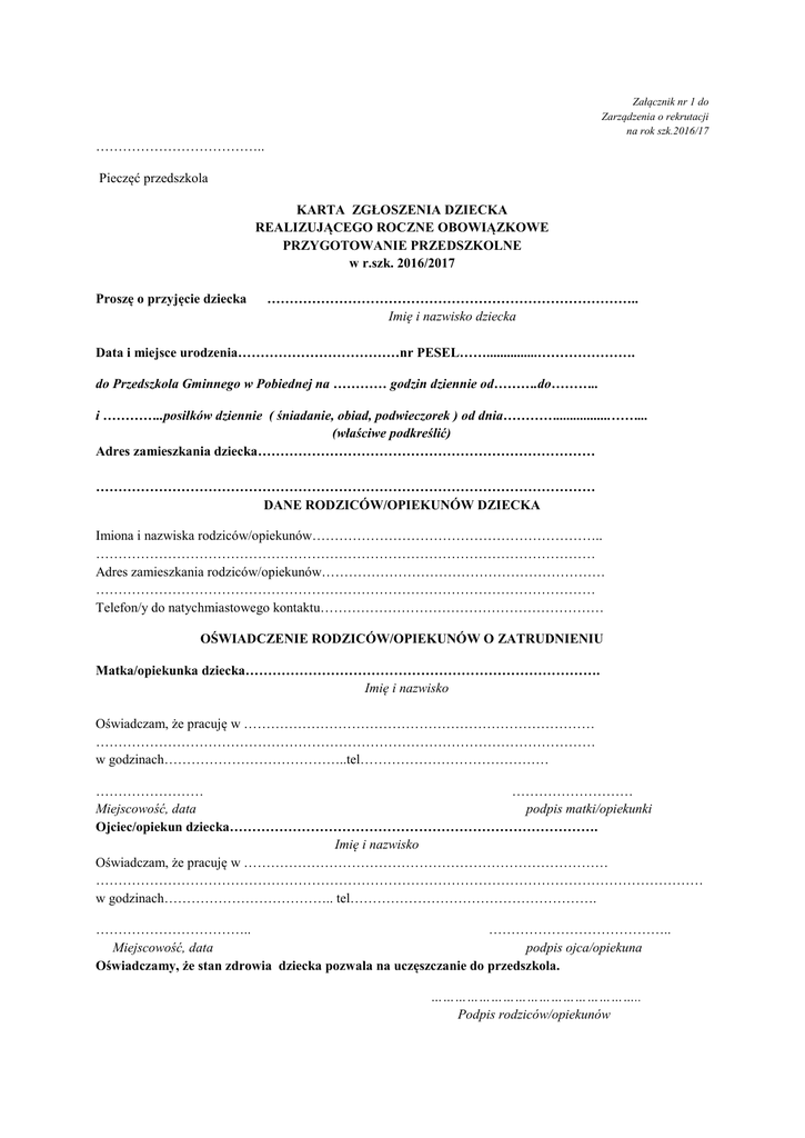 Załącznik nr 1 do Zarządzenia o rekrutacji na rok szk.2016/17 ……………………………….. Pieczęć przedszkola KARTA ZGŁOSZENIA DZIECKA REALIZUJĄCEGO ROCZNE OBOWIĄZKOWE PRZYGOTOWANIE PRZEDSZKOLNE w r.szk. 2016/2017 Proszę o przyjęcie dziecka ……………………………………………………………………….. Imię i nazwisko dziecka Data i miejsce urodzenia………………………………nr PESEL……...............…………………. do Przedszkola Gminnego w Pobiednej na ………… godzin dziennie od……….do……….. i …………..posiłków dziennie ( śniadanie, obiad, podwieczorek ) od dnia…………................……... (właściwe podkreślić) Adres zamieszkania dziecka………………………………………………………………… ………………………………………………………………………………………………… DANE RODZICÓW/OPIEKUNÓW DZIECKA Imiona i nazwiska rodziców/opiekunów……………………………………………………….. ………………………………………………………………………………………………… Adres zamieszkania rodziców/opiekunów……………………………………………………… ………………………………………………………………………………………………… Telefon/y do natychmiastowego kontaktu……………………………………………………… OŚWIADCZENIE RODZICÓW/OPIEKUNÓW O ZATRUDNIENIU Matka/opiekunka dziecka……………………………………………………………………. Imię i nazwisko Oświadczam, że pracuję w …………………………………………………………………… ………………………………………………………………………………………………… w godzinach…………………………………..tel…………………………………… …………………… ……………………… Miejscowość, data podpis matki/opiekunki Ojciec/opiekun dziecka………………………………………………………………………. Imię i nazwisko Oświadczam, że pracuję w ……………………………………………………………………… ……………………………………………………………………………………………………………………… w godzinach……………………………….. tel………………………………………………. …………………………….. ………………………………….. Miejscowość, data podpis ojca/opiekuna Oświadczamy, że stan zdrowia dziecka pozwala na uczęszczanie do przedszkola. …………………………………………….. Podpis rodziców/opiekunów 1. Potrawy, których dziecko nie może spożywać ……………………………………….. ………………………………………………………………………………………… 2. Wskazania i przeciwwskazania poradni specjalistycznych opiekujących się dzieckiem, wydane w wyniku przeprowadzonych badań ……………………..…………………… …………………………………………………………………………………………... …………………………………………………………………………………………... 3. Dodatkowe informacje o dziecku i rodzinie mogące wpłynąć na funkcjonowanie dziecka w przedszkolu ( stan zdrowia, ewentualne potrzeby socjalne) ………………….. ……………………………………………………………………………………………………………………… …………………………………………………………………………………………………. I. OŚWIADCZAM(Y) / ZOBOWIĄZUJEMY SIĘ Wyrażam(y) zgodę / nie wyrażam(y) zgody)* na zawiadomienie pogotowia w przypadku braku kontaktu z rodzicami. 2. Wyrażam(y) zgodę / nie wyrażam(y) zgody)* na publikowanie imienia i nazwiska oraz fotografii przedszkolnych naszego dziecka na stronie internetowej predskola. 3. Wyrażam(y) zgodę / nie wyrażam(y) zgody)* na kontrolowanie czystości głowy naszego dziecka 4. Wyrażam(y) zgodę / nie wyrażam(y) zgody)* na udział naszego dziecka w spacerach i wycieczkach na terenie wsi Pobiedna. 5. Oświadczam(y), że wyrażam(y) wolę/ nie wyrażam(y) woli* na bezpłatny udział mojego/naszego dziecka w zajęciach religii – organizowanych poza czasem przeznaczonym na bezpłatne nauczanie, wychowanie i opiekę. * niepotrzebne skreślić 6. Zobowiązujemy się do regularnego ponoszenia kosztów żywienia oraz kosztów za korzystanie z ponadprogramowych świadczeń przedszkola. Oświadczam(y), że ponosimy odpowiedzialność za bezpieczeństwo dziecka do momentu przyprowadzenia go do przedszkola i oddania pod opiekę pracownika oraz chwilą odbioru dziecka z przedszkola. 1. ………………………….. ………………………………….. podpis matki/opiekunki podpis ojca/opiekuna Oświadczenie o odbieraniu dziecka z przedszkola Oświadczam(y), że w przypadku przyjęcia dziecka do przedszkola dołączymy pisemne upoważnienie dla osób, które nami będą mogły odbierać dziecko z przedszkola. ……………………………….. podpis matki/opiekunki Rodzic dziecka przyjętego do przedszkola o świadczeniu usług przez przedszkole. …………………………… podpis ojca/opiekuna zobowiązany jest do podpisania umowy cywilno-prawnej Informacje dotyczące ochrony danych osobowych Wyrażamy zgodę na zbieranie, przetwarzanie i wykorzystywanie przez dyrektora przedszkola- w celach związanych z przyjęciem i pobytem w przedszkolu naszego dziecka-danych osobowych naszych i dziecka oraz upoważnionych do odbioru dziecka osób( zgodnie z Ustawą z 29 sierpnia 1997r. o ochronie danych osobowych). …………………………………. podpis matki/o