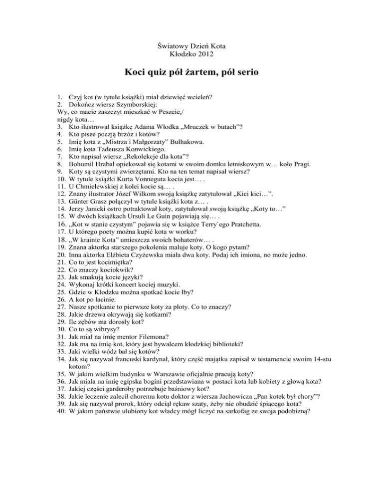 Światowy Dzień Kota Kłodzko 2012 Koci quiz pół żartem, pół serio 1. Czyj kot (w tytule książki) miał dziewięć wcieleń? 2. Dokończ wiersz Szymborskiej: Wy, co macie zaszczyt mieszkać w Peszcie,/ nigdy kota… 3. Kto ilustrował książkę Adama Włodka „Mruczek w butach”? 4. Kto pisze poezją brzóz i kotów? 5. Imię kota z „Mistrza i Małgorzaty” Bułhakowa. 6. Imię kota Tadeusza Konwickiego. 7. Kto napisał wiersz „Rekolekcje dla kota”? 8. Bohumil Hrabal opiekował się kotami w swoim domku letniskowym w… koło Pragi. 9. Koty są czystymi zwierzętami. Kto na ten temat napisał wiersz? 10. W tytule książki Kurta Vonneguta kocia jest… . 11. U Chmielewskiej z kolei kocie są… . 12. Znany ilustrator Józef Wilkom swoją książkę zatytułował „Kici kici…”. 13. Günter Grasz połączył w tytule książki kota z… . 14. Jerzy Janicki ostro potraktował koty, zatytułował swoją książkę „Koty to…” 15. W dwóch książkach Ursuli Le Guin pojawiają się… . 16. „Kot w stanie czystym” pojawia się w książce Terry`ego Pratchetta. 17. U którego poety można kupić kota w worku? 18. „W krainie Kota” umieszcza swoich bohaterów… . 19. Znana aktorka starszego pokolenia maluje koty. O kogo pytam? 20. Inna aktorka Elżbieta Czyżewska miała dwa koty. Podaj ich imiona, no może jedno. 21. Co to jest kocimiętka? 22. Co znaczy kociokwik? 23. Jak smakują kocie języki? 24. Wykonaj krótki koncert kociej muzyki. 25. Gdzie w Kłodzku można spotkać kocie łby? 26. A kot po łacinie. 27. Nasze spotkanie to pierwsze koty za płoty. Co to znaczy? 28. Jakie drzewa okrywają się kotkami? 29. Ile zębów ma dorosły kot? 30. Co to są wibrysy? 31. Jak miał na imię mentor Filemona? 32. Jak ma na imię kot, który jest bywalcem kłodzkiej biblioteki? 33. Jaki wielki wódz bał się kotów? 34. Jak się nazywał francuski kardynał, który część majątku zapisał w testamencie swoim 14-stu kotom? 35. W jakim wielkim budynku w Warszawie oficjalnie pracują koty? 36. Jak miała na imię egipska bogini przedstawiana w postaci kota lub kobiety z głową kota? 37. Jakiej części garderoby potrzebuje baśniowy kot? 38. Jakie leczenie zalecił choremu kotu doktor z wiersza Jachowicza „Pan kotek był chory”? 39. Jak się nazywał prorok, który odciął rękaw szaty, żeby nie obudzić śpiącego kota? 40. W jakim państwie ulubiony kot władcy mógł liczyć na sarkofag ze swoja podobizną?