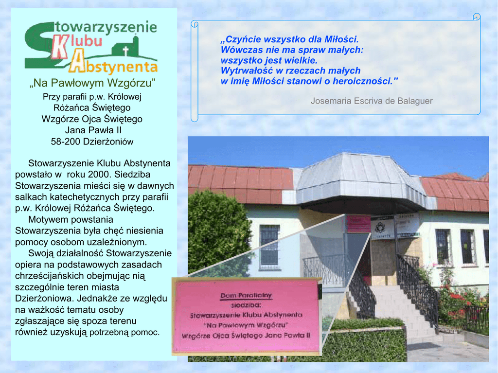 „Na Pawłowym Wzgórzu” Przy parafii p.w. Królowej Różańca Świętego Wzgórze Ojca Świętego Jana Pawła II 58-200 Dzierżoniów Stowarzyszenie Klubu Abstynenta powstało w roku 2000. Siedziba Stowarzyszenia mieści się w dawnych salkach katechetycznych przy parafii p.w. Królowej Różańca Świętego. Motywem powstania Stowarzyszenia była chęć niesienia pomocy osobom uzależnionym. Swoją działalność Stowarzyszenie opiera na podstawowych zasadach chrześcijańskich obejmując nią szczególnie teren miasta Dzierżoniowa. Jednakże ze względu na ważkość tematu osoby zgłaszające się spoza terenu również uzyskują potrzebną pomoc. „Czyńcie wszystko dla Miłości. Wówczas nie ma spraw małych: wszystko jest wielkie. Wytrwałość w rzeczach małych w imię Miłości stanowi o heroiczności.” Josemaria Escriva de Balaguer Głównym i podstawowym celem Stowarzyszenia jest niesienie pomocy osobom uzależnionym i członkom ich rodzin, które odbywa się poprzez: spotkania osób uzależnionych w grupach wsparcia AA (Anonimowi Alkoholicy), spotkania osób z rodzin borykających się z problemem uzależnienia w grupach Al-Anon, prowadzenie Świetlicy Środowiskowej dla dzieci i młodzieży, udzielanie porad prawnych, udzielanie porad psychologicznych, udzielanie porad dotyczących problemów narkomanii, udzielanie porad dotyczących wszelkich uzależnień i przemocy w rodzinie, porady i pomoc resocjalizacyjna, Działalność Stowarzyszenia, w tym spotkania w poszczególnych grupach i udzielanie porad, przebiega w stałym cotygodniowym cyklu. Informacje o wyżej wymienionych formach pomocy zamieszczone są w gablotach informacyjnych przy parafiach miasta Dzierżoniowa, jak również w parafialnej gazetce – U Królowej Różańca Świętego. Wszelkie porady udzielane są bezpłatnie. Tygodniowy rozkład zajęć na rok szkolny 2007/2008: Poniedziałek – godz. 16:30 - 18:30 Porady prawnika – w każdy pierwszy poniedziałek miesiąca – porady prawne od 17:00. Porady psychologa – w każdy drugi poniedziałek miesiąca – porady psychologa od 17:00. Porady terapeutyczne dotyczące rozwiązywania problemów narkomanii – w każdy trzeci poniedziałek miesiąca. Porady terapeutyczne dotyczące wszelkich uzależnień i przemocy w rodzinie – w każdy czwarty poniedziałek miesiąca. Wtorek – godz. 16:30 – 19:30 – mityng AL-Anon od 17:00 Zajęcia tematyczne wspólnoty AL-Anon (dla rodzin borykających się z problemami uzależnień) Środa – godz. 16:30 – 20:00 – mityng AA od 17:00 Spotkania wspólnoty AA. Czwartek – godz. 17:00 – 20:30 Zajęcia klubowe – bilard stołowy, tenis, szachy, warcaby, piłkarzyki, filmy itp. (kawa, herbata). Sobota – godz. 16:00 – 20:00 Zajęcia klubowe – bilard stołowy, tenis, szachy, warcaby, piłkarzyki, filmy itp. (kawa, herbata). Prace remontowe w siedzibie Stowarzyszenia – rok 2000. Członkowie Zarządu Stowarzyszenia: Sławomir Smugarzewski Andrzej Kamiński Józef Karpierz Anatol Rudnicki Pomieszczenia zostały przedzielone przesuwną ścianką. Do dyspozycji młodzieży jest stół bilardowy, piłkarzyki oraz stół do gry w ping-ponga. Część pomieszczenia może funkcjonować jako niezależna sala telewizyjna lub sala do gry w ping-ponga. Sala telewizyjna Do dyspozycji jest własna kuchnia wyposażona w odpowiednie naczynia. Stoły, miejsca do pracy i nauki oraz przestronny korytarz. Pierwszy bezalkoholowy Bal Sylwestrowy w siedzibie Stowarzyszenia – rok 2001. W stałą działalność Stowarzyszenia wpisane są również: zabawy dla młodzieży szczególnie tzw. zabawa andrzejkowa i ostatkowa, zabawa dla dzieci z rodzin znajdujących się w trudnej sytuacji materialnej połączona z wizytą św. Mikołaja i wręczeniem paczek. W zabawie tej mogą brać udział wszystkie dzieci, z tym że paczki przygotowane są tylko dla wyżej wymienionej grupy dzieci, Okres Świąt Bożego Narodzenia. Młodzież i dzieci przedstawiają Jasełka dla osób samotnych i starszych. Wpis w księdze parafialnej dokonany przez księdza arcybiskupa Henryka kardynała Gulbinowicza z dnia 07.04.2002: „Gratuluję wspólnocie rzym-kat. par. Królowej Różańca św., że wśród wielu organizacji katolickich istnieją też A.A. Życzę by służba na tym polu przynosiła piękne owoce. Modlę się i z całego serca błogosławię.” Stowarzyszenie współpracuje: z Urzędem Miasta poprzez Miejską Komisję Zwalczania Problemów Alkoholowych, z parafiami p.w. Królowej Różańca św. i p.w. Chrystusa Króla, z zespołami charytatywnymi przy wyżej wymienionych parafiach, ze Stowarzyszeniem Klub Abstynenta „Kalenica”, z Poradnią Zdrowia Psychicznego i Leczenia Uzależnień w Dzierżoniowie,