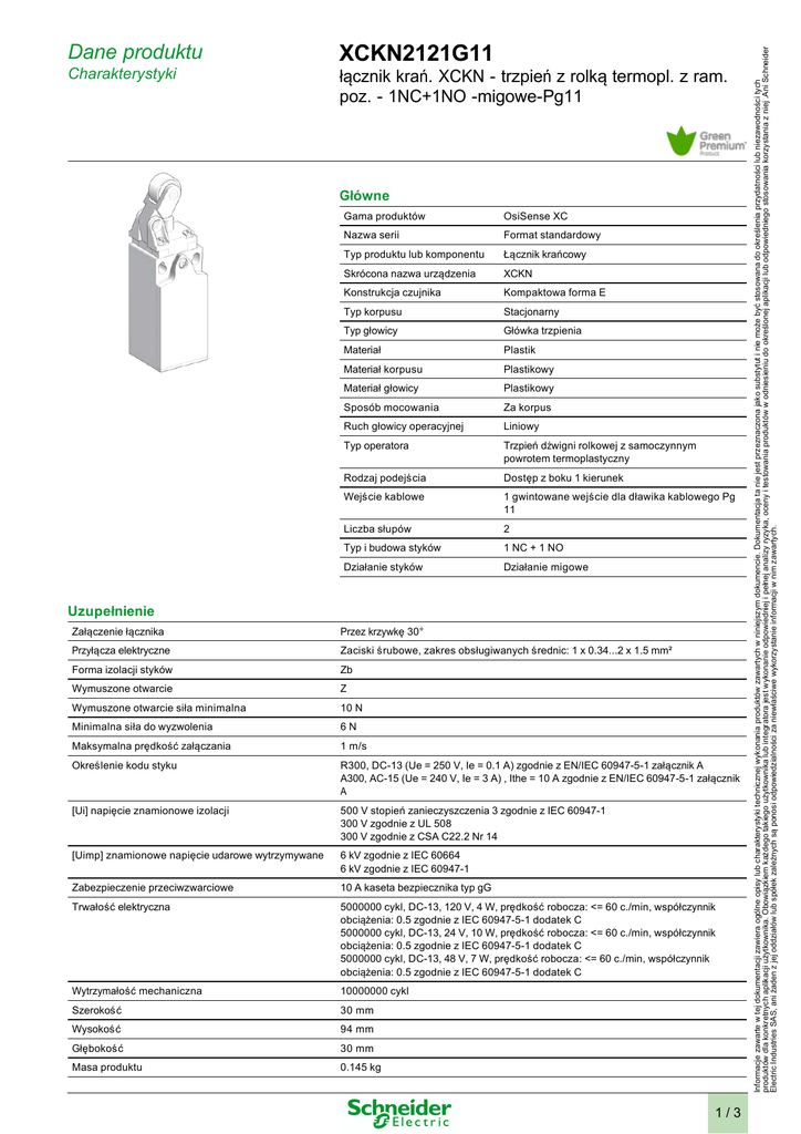 XCKN2121G11 Charakterystyki łącznik krań. XCKN - trzpień z rolką termopl. z ram. poz. - 1NC+1NO -migowe-Pg11 Główne Gama produktów OsiSense XC Nazwa serii Format standardowy Typ produktu lub komponentu Łącznik krańcowy Skrócona nazwa urządzenia XCKN Konstrukcja czujnika Kompaktowa forma E Typ korpusu Stacjonarny Typ głowicy Główka trzpienia Materiał Plastik Materiał korpusu Plastikowy Materiał głowicy Plastikowy Sposób mocowania Za korpus Ruch głowicy operacyjnej Liniowy Typ operatora Trzpień dźwigni rolkowej z samoczynnym powrotem termoplastyczny Rodzaj podejścia Dostęp z boku 1 kierunek Wejście kablowe 1 gwintowane wejście dla dławika kablowego Pg 11 Liczba słupów 2 Typ i budowa styków 1 NC + 1 NO Działanie styków Działanie migowe Uzupełnienie Załączenie łącznika Przez krzywkę 30° Przyłącza elektryczne Zaciski śrubowe, zakres obsługiwanych średnic: 1 x 0.34...2 x 1.5 mm² Forma izolacji styków Zb Wymuszone otwarcie Z Wymuszone otwarcie siła minimalna 10 N Minimalna siła do wyzwolenia 6N Maksymalna prędkość załączania 1 m/s Określenie kodu styku R300, DC-13 (Ue = 250 V, Ie = 0.1 A) zgodnie z EN/IEC 60947-5-1 załącznik A A300, AC-15 (Ue = 240 V, Ie = 3 A) , Ithe = 10 A zgodnie z EN/IEC 60947-5-1 załącznik A [Ui] napięcie znamionowe izolacji 500 V stopień zanieczyszczenia 3 zgodnie z IEC 60947-1 300 V zgodnie z UL 508 300 V zgodnie z CSA C22.2 Nr 14 [Uimp] znamionowe napięcie udarowe wytrzymywane 6 kV zgodnie z IEC 60664 6 kV zgodnie z IEC 60947-1 Zabezpieczenie przeciwzwarciowe 10 A kaseta bezpiecznika typ gG Trwałość elektryczna 5000000 cykl, DC-13, 120 V, 4 W, prędkość robocza: <= 60 c./min, współczynnik obciążenia: 0.5 zgodnie z IEC 60947-5-1 dodatek C 5000000 cykl, DC-13, 24 V, 10 W, prędkość robocza: <= 60 c./min, współczynnik obciążenia: 0.5 zgodnie z IEC 60947-5-1 dodatek C 5000000 cykl, DC-13, 48 V, 7 W, prędkość robocza: <= 60 c./min, współczynnik obciążenia: 0.5 zgodnie z IEC 60947-5-1 dodatek C Wytrzymałość mechaniczna 10000000 cykl Szerokość 30 mm Wysokość 94 mm Głębokość 30 mm Masa produktu 0.145 kg 1/3 Informacje zawarte w tej dokumentacji zawiera ogólne opisy lub charakterystyki technicznej wykonania produktów zawartych w niniejszym dokumencie. Dokumentacja ta nie jest przeznaczona jako substytut i nie może być stosowana do określenia przydatności lub niezawodności tych produktów dla konkretnych aplikacji użytkownika. Obowiązkiem każdego takiego użytkownika lub integratora jest wykonanie odpowiedniej i pełnej analizy ryzyka, oceny i testowania produktów w odniesieniu do określonej aplikacji lub odpowiedniego stosowania korzystania z niej .Ani Schneider Electric Industries SAS, ani żaden z jej oddziałów lub spółek zależnych są ponosi odpowiedzialności za niewłaściwe wykorzystanie informacji w nim zawartych. Dane produktu Opis zacisków ISO n°1 (13-14)NO (21-22)NC Środowisko odporność na wstrząsy 50 gn (czas trwania = 11 ms) zgodnie z IEC 60068-2-27 odporność na wibracje 25 gn (f = 10...500 Hz) zgodnie z IEC 60068-2-6 stopień ochrony IP IP65 zgodnie z IEC 60529 stopień ochrony IK IK04 zgodnie z EN 50102 kategoria przepięć Klasa 2 zgodnie z IEC 61140 Klasa 2 zgodnie z NF C 20-030 temperatura otoczenia dla pracy urządzenia -25...70 °C temepratura otoczenia dla przechowywania -40...70 °C działanie ochronne TC certyfikaty produktu CCC CSA UL normy EN 60204-1 EN 60947-5-1 IEC 60204-1 IEC 60947-5-1 UL 508 CSA C22.2 Nr 14 Oferta zrównoważonego rozwoju Status oferty zrównoważonego rozwoju Produkt ekologiczny Green Premium RoHS (kod daty: RRTT) Compliant - since 1003 - Schneider Electric declaration of conformity REACh Referencja nie zawiera SVHC powyżej wartości progowej Profil ekologiczny produktu Dostępny Instrukcje dotyczące zakończenia okresu eksploatacji produktu Bez potrzeby specjalnych działań recyklingowych Contractual warranty Okres 18 miesięcy Dimensions (1) 1 tapped entry for Pg 11 cable gland (2) Ø: 2 elongated holes Ø 4.3 x 6.3 on 22 mm centres, 2 holes Ø 4.3 on 20 mm centres. Mounting with Cable Entry Position of Cable Gland 2/3 (1) Recommended (2) To be avoided Wiring Diagram 2-pole NC + NO Snap Action Characteristics of Actuation Switch Actuation by 30° Cam Functionnal Diagram (P) Positive opening point (A) Cam displacement (1) NC contact with positive opening operation (2) Closed (3) Open (4) Tripping (5) Resetting 3/3