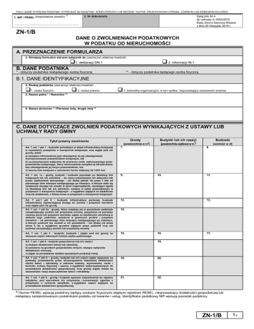 POLA JASNE WYPEŁNIA PODATNIK. WYPEŁNIAĆ NA MASZYNIE, KOMPUTEROWO LUB RĘCZNIE, DUŻYMI, DRUKOWANYMI LITERAMI, CZARNYM LUB NIEBIESKIM KOLOREM. 1. NIP / PESEL (niepotrzebne skreślić) 1) Załącznik Nr 4 do uchwały nr IX/64/2015 Rady Gminy Siennica Różana z dnia 26 listopada 2015 r. 2. Nr dokumentu ………………………………………………… ZN-1/B DANE O ZWOLNIENIACH PODATKOWYCH W PODATKU OD NIERUCHOMOŚCI A. PRZEZNACZENIE FORMULARZA 3. Niniejszy formularz stanowi załącznik do (zaznaczyć właściwy kwadrat): 1. deklaracji DN-1 B. DANE PODATNIKA * - dotyczy podatnika niebędącego osobą fizyczną 2. informacji IN-1 ** - dotyczy podatnika będącego osobą fizyczną B.1. DANE IDENTYFIKACYJNE 4. Rodzaj podatnika (zaznaczyć właściwy kwadrat): 1. osoba fizyczna 2. osoba prawna 3. jednostka organizacyjna, w tym spółka, nieposiadająca osobowości prawnej 5. Nazwa pełna * / Nazwisko ** 6. Nazwa skrócona * / Pierwsze imię, drugie imię ** C. DANE DOTYCZĄCE ZWOLNIEŃ PODATKOWYCH WYNIKAJĄCYCH Z USTAWY LUB UCHWAŁY RADY GMINY Grunty Tytuł prawny zwolnienia (powierzchnia w m2) Art. 7 ust. 1 pkt 1 - budowle wchodzące w skład infrastruktury kolejowej w rozumieniu przepisów o transporcie kolejowym oraz zajęte pod nie grunty, jeżeli: a) zarządca infrastruktury jest obowiązany do jej udostępniania licencjonowanym przewoźnikom kolejowym, lub b) są przeznaczone wyłącznie do przewozu osób, wykonywanego przez przewoźnika kolejowego, który równocześnie zarządza tą infrastrukturą bez udostępniania jej innym przewoźnikom, lub c) tworzą linie kolejowe o szerokości torów większej niż 1435 mm 7. Art. 7 ust. 1a - grunty, budynki i budowle pozostałe po likwidacji linii kolejowych lub ich odcinków – do czasu przeniesienia ich własności lub prawa użytkowania wieczystego - nie dłużej jednak niż przez 3 lata od pierwszego dnia miesiąca następującego po miesiącu, w którym stała się ostateczna decyzja lub weszło w życie rozporządzenie, wyrażające zgodę na likwidację linii lub ich odcinków, wydane w trybie przewidzianym w przepisach o transporcie kolejowym - z wyjątkiem zajętych na działalność inną niż działalność, o której mowa w przepisach o transporcie kolejowym 9. Art. 7 ust.1 pkt 2 - budowle infrastruktury portowej, budowle infrastruktury zapewniającej dostęp do portów i przystani morskich oraz zajęte pod nie grunty 12. Art. 7 ust. 1 pkt 2a - grunty, które znajdują się w posiadaniu podmiotu zarządzającego portem lub przystanią morską, pozyskane na potrzeby rozwoju portu lub przystani morskiej, zajęte na działalność określoną w statucie tego podmiotu, położone w granicach portów i przystani morskich - od pierwszego dnia miesiąca następującego po miesiącu, w którym podmiot ten wszedł w ich posiadanie - nie dłużej niż przez okres 5 lat, z wyjątkiem gruntów zajętych przez podmiot inny niż podmiot zarządzający portem lub przystanią morską 14. Art. 7 ust. 1 pkt 3 - budynki, budowle i zajęte pod nie grunty na obszarze części lotniczych lotnisk użytku publicznego 15. Art. 7 ust. 1 pkt 4 - budynki gospodarcze lub ich części: a) służące działalności leśnej lub rybackiej, b) położone na gruntach gospodarstw rolnych, służące wyłącznie działalności rolniczej, c) zajęte na prowadzenie działów specjalnych produkcji rolnej Budynki lub ich części Budowle (powierzchnia użytkowa w m ) (wartość w zł) 2 8. 10. 11. 13. 16. 17. 18. Art. 7 ust. 1 pkt 5 – grunty, budynki lub ich części zajęte wyłącznie na potrzeby prowadzenia przez stowarzyszenia statutowej działalności wśród dzieci i młodzieży w zakresie oświaty, wychowania, nauki i techniki, kultury fizycznej i sportu, z wyjątkiem wykorzystywanych do prowadzenia działalności gospodarczej, oraz grunty zajęte trwale na obozowiska i bazy wypoczynkowe dzieci i młodzieży 19. 20. Art. 7 ust. 1 pkt 6 - grunty i budynki wpisane indywidualnie do rejestru zabytków, pod warunkiem ich utrzymania i konserwacji, zgodnie z przepisami o ochronie zabytków, z wyjątkiem części zajętych na prowadzenie działalności gospodarczej 21. 22. 1) Numer PESEL wpisują podatnicy będący osobami fizycznymi objętymi rejestrem PESEL, nieprowadzący działalności gospodarczej lub niebędący zarejestrowanymi podatnikami podatku od towarów i usług. Identyfikator podatkowy NIP wpisują pozostali podatnicy. ZN-1/B 1/2 POLA JASNE WYPEŁNIA PODATNIK. WYPEŁNIAĆ NA MASZYNIE, KOMPUTEROWO LUB RĘCZNIE, DUŻYMI, DRUKOWANYMI LITERAMI, CZARNYM LUB NIEBIESKIM KOLOREM. Grunty Tytuł prawny zwolnienia Budynki lub ich części Budowle (powierzchnia użytkowa w m ) (wartość w zł) 2 (powierzchnia w m2) Art. 7 ust. 1 pkt 7 - grunty i budynki we władaniu muzeów rejestrowanych 23. 24. Art. 7 ust. 1 pkt 8 - grunty położone na obszarach objętych ochroną ścisłą, czynną lub krajobrazową, a także budynki i budowle trwale związane z gruntem - znajdujące się w parkach narodowych lub rezerwatach przyrody i służące bezpośrednio i wyłącznie osiąganiu celów z zakresu ochrony przyrody 25. 26. Art. 7 ust. 1 pkt 8a - będące własnością Skarbu Państwa: a) grunty pod wodami powierzchniowymi płynącymi jezior, b) grunty zajęte pod sztuczne zbiorniki wodne, z wyjątkiem gruntów przekazanych w posiadanie innym podmiotom niż wymienione w art. 217 ustawy z dnia 18 lipca 2001 r. – Prawo wodne 28. Art. 7 ust. 1 pkt 9 - budowle wałów ochronnych, grunty pod wałami ochronnymi i położone w międzywalach, z wyjątkiem zajętych na prowadzenie działalności gospodarczej przez inne podmioty niż spółki wodne, ich związki oraz związki wałowe 29. Art. 7 ust. 1 pkt 10 - grunty stanowiące nieużytki, użytki ekologiczne, grunty zadrzewione i zakrzewione, z wyjątkiem zajętych na prowadzenie działalności gospodarczej 31. Art. 7 ust. 1 pkt 11 - grunty stanowiące działki przyzagrodowe członków rolniczych spółdzielni produkcyjnyc