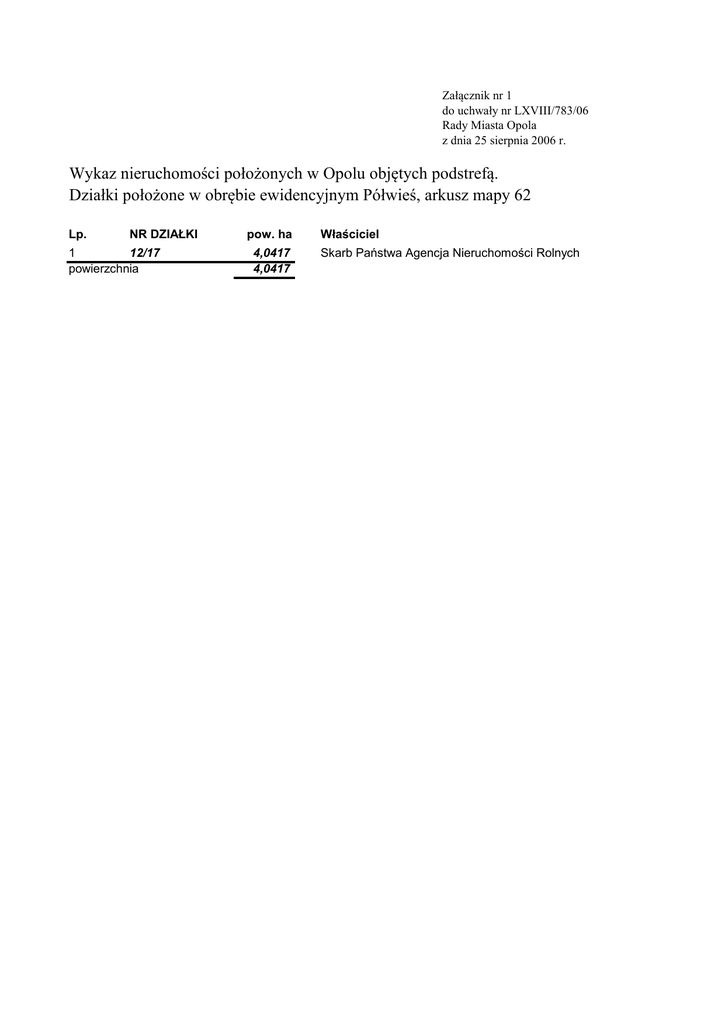 Załącznik nr 1 do uchwały nr LXVIII/783/06 Rady Miasta Opola z dnia 25 sierpnia 2006 r. Wykaz nieruchomości położonych w Opolu objętych podstrefą. Działki położone w obrębie ewidencyjnym Półwieś, arkusz mapy 62 Lp. NR DZIAŁKI 1 12/17 powierzchnia pow. ha 4,0417 4,0417 Właściciel Skarb Państwa Agencja Nieruchomości Rolnych