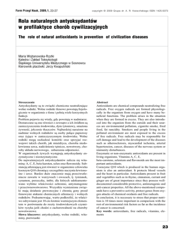 &ARM0RZEGL.AUK COPYRIGHT'RUPADR!2+WIECIÊSKIEGO)33. 2OLANATURALNYCHANTYOKSYDANTÌW WPROFILAKTYCECHORÌBCYWILIZACYJNYCH 4HEROLEOFNATURALANTIOXIDANTSINPREVENTIONOFCIVILIZATIONDISEASES -ARIA7OJTANOWSKA2ZYTKI +ATEDRAI:AKAD4OKSYKOLOGII gLSKIEGO5NIWERSYTETU-EDYCZNEGOW3OSNOWCU +IEROWNIKPLACÌWKI*ERZY+WAPULIÊSKI Streszczenie Antyoksydanty są to związki chemiczne neutralizujące wolne rodniki. Wolne rodniki tlenowe powstają fizjologicznie w organizmie z tlenu i pełnią wiele korzystnych funkcji. Problem pojawia się wtedy, gdy powstają w nadmiarze. Dostarczane są one również z zewnątrz a ich źródłem są zanieczyszczenia środowiska, dym tytoniowy, smażona żywność, jełczenie tłuszczów. Najbardziej narażone na nadmiar wolnych rodników są osoby palące papierosy oraz żyjące w zanieczyszczonym środowisku. Wolne rodniki mogą uszkadzać komórki oraz sprzyjać rozwojowi takich chorób, jak miażdżyca, choroba niedokrwienna serca, nadciśnienie tętnicze, nowotwory, choroby układu nerwowego, zaburzenia odporności. W organizmach żywych występują antyoksydanty enzymatyczne i nieenzymatyczne. Do najważniejszych antyoksydantów zalicza się witaminę: A, C, E, beta-karoten, selen oraz flawonoidy. Substancją utleniającą jest również w organizmie człowieka koenzym Q10 chroniący szczególnie naczynia krwionośne i serce. Bardzo duże znaczenie mają przeciwutleniacze zawarte w warzywach i owocach, tj. tymianek, cynamon, porzeczka, imbir, dla których udokumentowano wybitne właściwości ochronne, antymutagenne i przeciwnowotworowe. Wszystkie wymienione związki mają działanie prewencyjne i chronią geny przed tlenowymi atakami chemicznych utleniaczy i wolnych rodników. Podsumowując, warto podkreślić, że właściwe odżywianie jest 10-cio krotnie ważniejszym elementem w porównaniu do reszty środowiskowych czynników ryzyka jeśli chodzi o zachorowalność na choroby nowotworowe. Słowa kluczowe: antyoksydanty, wolne rodniki, witaminy, pierwiastki Abstract Antioxidants are chemical compounds neutralizing free radicals. Free oxygen radicals are formed physiologically in the organism from oxygen and have many beneficial functions. The problem arises in the situation when they are formed in excess. They are also introduced into the organism from the outside and their sources are environmental pollution, cigarette smoke, fried food, fat rancidity. Smokers and people living in the polluted environment are most exposed to the excess of free radicals. Free radicals may be responsible for cell damage and lead to the development of the diseases such as atherosclerosis, myocardial ischemia, arterial hypertension, cancer, diseases of the nervous system or immunity disturbances. Enzymatic or non-enzymatic antioxidants are present in living organisms. Vitamins A, C, E, beta-carotene, selenium and flavonoids are the most important antioxidants. Coenzyme Q10 which is produced in the human organism is also an antioxidant. It protects blood vessels and the heart in particular. Antioxidants present in fruit and vegetables such as in thyme, cinnamon, currant and ginger are of great importance since they possess welldocumented considerable protective, antimutagenic and anti-cancer properties. All the above-mentioned compounds have a preventive activity, protect genes from oxygen attacks of chemical oxidants and free radicals. In conclusion, it is necessary to stress that proper nutrition is 10 times more important in comparison with the rest of environmental risk factors as far as the incidence of cancer is concerned. Key words: antioxidants, free radicals, vitamins, elements &ARM0RZEGL.AUK W ostatnich latach coraz częściej obserwuje się duże zainteresowanie występowaniem antyoksydantów znajdujących się w wielu składnikach pokarmowych oraz ich fizjologiczną rolą. Bardzo ważnym aspektem zdrowotnym jest utrzymanie w organizmie równowagi pomiędzy substancjami utleniającymi a przeciwutleniaczami. W sytuacji zaburzenia tej równowagi na korzyść substancji utleniających, funkcje obronne organizmu są w dużym stopniu upośledzone. Zaburzenie takie określane jest mianem stresu oksydacyjnego. Tlen, którym oddychamy, ulega w organizmie czteroetapowej redukcji, w wyniku której powstaje cząsteczka wody. Produkty niecałkowitej redukcji cząsteczki tlenu nazwano reaktywnymi formami tlenu. Mogą być to neutralne cząsteczki lub jony oraz wolne rodniki tlenowe, które bardzo szybko mogą wchodzić w reakcje z białkami, lipidami, cukrami oraz kwasami nukleinowymi obecnymi w komórkach, prowadząc do powstania kolejnych produktów wolnorodnikowych. Jednym z najbardziej aktywnych wolnych rodników jest rodnik hydroksylowy. Powstające w nadmiarze reaktywne formy tlenu powodują utlenianie tłuszczów, białek, DNA, a co za tym idzie mogą przyczynić się do uszkodzenia tkanek. Toksyczne produkty reakcji utleniania wywierają działanie cytostatyczne na komórkę, doprowadzają do uszkodzenia błon komórkowych i aktywują mechanizmy apoptozy. Wysoce reaktywne formy tlenu to niestabilne cząstki chemiczne zwane inaczej wolnymi rodnikami, powstają podczas procesów przemiany materii w odpowiedzi na bodźce, takie jak np. promieniowanie UV, zanieczyszczenia powietrza lub dym tytoniowy. Stale powstające w naszym organizmie wolne rodniki ulegają procesom rozpadu, przy czym u ludzi zdrowych są one natychmiast niszczone. Inaczej proces ten przebiega w starzejącym się organizmie, w którym to wolne rodniki mogą być czynnikami potencjalnie uszkadzającymi komórki organizmu, prowadząc do destrukcji białek i degeneracji komórek. Do chorób, w których stres oksydacyjny odgrywa kluczową rolę, zalicza się między innymi: choroby układu krążenia, neurodegeneracyjne, choroby zapalne tj. reumatoidalne zapalenie stawów, cukrzyca, a także procesy starzenia się. Choroby te wynikają z różnych przyczyn, lecz u podłoża wszystkich leżą zaburzenia równowagi oksydacyjn