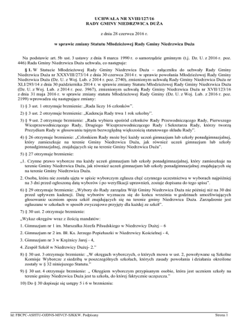 UCHWAŁA NR XVIII/127/16 RADY GMINY NIEDRZWICA DUŻA z dnia 28 czerwca 2016 r. w sprawie zmiany Statutu Młodzieżowej Rady Gminy Niedrzwica Duża Na podstawie art. 5b ust. 3 ustawy z dnia 8 marca 1990 r. o samorządzie gminnym (t.j. Dz. U. z 2016 r. poz. 446) Rada Gminy Niedrzwica Duża uchwala, co następuje: § 1. W Statucie Młodzieżowej Rady Gminy Niedrzwica Duża – załączniku do uchwały Rady Gminy Niedrzwica Duża nr XXXVIII/273/14 z dnia 30 czerwca 2014 r. w sprawie powołania Młodzieżowej Rady Gminy Niedrzwica Duża (Dz. U. z Woj. Lub. z 2014 r. poz. 2740), zmienionym uchwałą Rady Gminy Niedrzwica Duża nr XLI/293/14 z dnia 30 października 2014 r. w sprawie zmiany Statutu Młodzieżowej Rady Gminy Niedrzwica Duża (Dz. U. z Woj. Lub. z 2014 r. poz. 3967), zmienionym uchwałą Rady Gminy Niedrzwica Duża nr XVII/123/16 z dnia 31 maja 2016 r. w sprawie zmiany statutu Młodzieżowej Rady Gminy (Dz. U. z Woj. Lub. z 2016 r. poz. 2199) wprowadza się następujące zmiany: 1) § 3 ust. 1 otrzymuje brzmienie: „Rada liczy 16 członków”. 2) § 3 ust. 2 otrzymuje brzmienie: „Kadencja Rady trwa 1 rok szkolny”. 3) § 9 ust. 2 otrzymuje brzmienie: „Rada wybiera spośród członków Rady Przewodniczącego Rady, Pierwszego Wiceprzewodniczącego Rady, Drugiego Wiceprzewodniczącego Rady i Sekretarza Rady, którzy tworzą Prezydium Rady w głosowaniu tajnym bezwzględną większością statutowego składu Rady”. 4) § 26 otrzymuje brzmienie: „Członkiem Rady może być każdy uczeń gimnazjum lub szkoły ponadgimnazjalnej, który zamieszkuje na terenie Gminy Niedrzwica Duża, jak również uczeń gimnazjum lub szkoły ponadgimnazjalnej, znajdujących się na terenie Gminy Niedrzwica Duża”. 5) § 27 otrzymuje brzmienie: „1. Czynne prawo wyborcze ma każdy uczeń gimnazjum lub szkoły ponadgimnazjalnej, który zamieszkuje na terenie Gminy Niedrzwica Duża, jak również uczeń gimnazjum lub szkoły ponadgimnazjalnej znajdujących się na terenie Gminy Niedrzwica Duża. 2. Osoba, która nie została ujęta w spisie wyborczym zgłasza chęć czynnego uczestnictwa w wyborach najpóźniej na 3 dni przed ogłoszoną datą wyborów i po weryfikacji uprawnień, zostaje dopisana do tego spisu”. 6) § 29 otrzymuje brzmienie: „Wybory do Rady zarządza Wójt Gminy Niedrzwica Duża nie później niż na 30 dni przed upływem kadencji. Datę wyborów wyznacza się do końca września w godzinach umożliwiających głosowanie uczniom spoza szkół znajdujących się na terenie gminy Niedrzwica Duża. Zarządzenie jest ogłaszane w szkołach w sposób zwyczajowo przyjęty dla każdej ze szkół”. 7) § 30 ust. 2 otrzymuje brzmienie: „Wykaz okręgów wraz z ilością mandatów: 1. Gimnazjum nr 1 im. Marszałka Józefa Piłsudskiego w Niedrzwicy Dużej – 6 2. Gimnazjum nr 2 im. Bł. Ks. Jerzego Popiełuszki w Niedrzwicy Kościelnej - 4, 3. Gimnazjum nr 3 w Krężnicy Jarej - 4, 4. Zespół Szkół w Niedrzwicy Dużej- 2.” 8) § 30 ust. 3 otrzymuje brzmienie: „W okręgach wyborczych, o których mowa w ust. 2, powoływane są Szkolne Komisje Wyborcze z siedzibą w poszczególnych szkołach, których zasady powołania i działania określone zostały w § 32 niniejszego Statutu.” 9) § 30 ust. 4 otrzymuje brzmienie: „ Okręgiem wyborczym przypisanym osobie, która jest uczniem szkoły na terenie gminy Niedrzwica Duża jest ta szkoła, do której faktycznie uczęszcza.” 10) Do § 30 dopisuje się ustępy 5 i 6 w brzmieniu: Id: FBCPC-ASHTU-OJDNS-MIVCF-SJKKW. Podpisany Strona 1 „5. Okręgiem wyborczym przypisanym osobie, która uczęszcza do szkoły poza terenem gminy Niedrzwica Duża jest ta szkoła gimnazjalna, w rejonie której zamieszkuje. 6. Istnieje możliwość skorzystania z czynnego i biernego prawa wyborczego w innym okręgu wyborczym niż przypisany na pisemny wniosek osoby zainteresowanej, złożony do Gminnej Komisji Wyborczej najpóźniej 7 dni przed wyznaczoną datą wyborów.” 11) § 32 ust. 2 otrzymuje brzmienie: „Czynne i bierne prawo wyborcze przysługuje każdemu uczniowi gimnazjum lub szkoły ponadgimnazjalnej, który zamieszkuje na terenie Gminy Niedrzwica Duża, jak również każdemu uczniowi gimnazjum lub szkoły ponadgimnazjalnej, znajdujących się na terenie Gminy Niedrzwica Duża”. 12) § 32 ust. 7 dodaje się pkt. 9 w brzmieniu: „9. weryfikacja uprawnień osób, o których mowa w § 27 ust. 2.” 13) § 32 ust.17 uchyla się. 14) § 33 ust. 2 otrzymuje brzmienie: „Osoba , która nie jest uczniem gimnazjum lub szkoły ponadgimnazjalnej, znajdujących się na terenie Gminy Niedrzwica Duża dostarcza formularz zgłoszeniowy do Gminnej Komisji Wyborczej i wpisana zostaje na listę kandydatów w tym Okręgu Wyborczym, do którego przynależy, z zastrzeżeniem § 30 ust. 6. Przyjmowanie formularzy zamyka się na 7 dni przed ogłoszoną datą wyborów”. 15) § 33 ust. 4 otrzymuje brzmienie: „Zgłoszenie kandydata winno być poparte podpisami osób uprawnionych do głosowania w wyborach do Młodzieżowej Rady Gminy Niedrzwica Duża w liczbie co najmniej 10”. 16) § 34 ust.1 otrzymuje brzmienie: „Kampania wyborcza rozpoczyna się na 7 dni przed ogłoszoną datą wyborów i ulega zakończeniu w dniu poprzedzającym wybory”. 17) § 35 ust. 9 otrzymuje brzmienie: „Za wybranych uważa się kandydatów, którzy otrzymali największą liczbę głosów. W przypadku gdy dwóch lub większa liczba kandydatów otrzyma równą liczbę głosów, Szkolna Komisja Wyborcza zarządza powtórne głosowanie tylko na tych dwóch kandydatów. Głosowanie należy przeprowadzić w ciągu 7 dni po stwierdzeniu zaistniałej sytuacji”. 18) § 37 ust. 1 pkt. 4 otrzymuje brzmienie: „ Śmierci radnego”. 19) § 37 ust. 2 otrzymuje brzmienie: „W przypadku wygaśnięcia mandatu uzupełnia się skład Rady o osobę, która uzyskała kolejno największą liczbę głosów w wyborach w tym samym Okręgu Wyborczym. Uzupełnienia dokonuje Wójt w drodze z