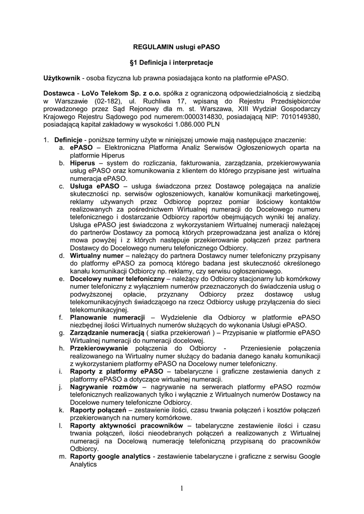 REGULAMIN usługi ePASO §1 Definicja i interpretacje Użytkownik - osoba fizyczna lub prawna posiadająca konto na platformie ePASO. Dostawca - LoVo Telekom Sp. z o.o. spółka z ograniczoną odpowiedzialnością z siedzibą w Warszawie (02-182), ul. Ruchliwa 17, wpisaną do Rejestru Przedsiębiorców prowadzonego przez Sąd Rejonowy dla m. st. Warszawa, XIII Wydział Gospodarczy Krajowego Rejestru Sądowego pod numerem:0000314830, posiadającą NIP: 7010149380, posiadającą kapitał zakładowy w wysokości 1.086.000 PLN 1. Definicje - poniższe terminy użyte w niniejszej umowie mają następujące znaczenie: a. ePASO – Elektroniczna Platforma Analiz Serwisów Ogłoszeniowych oparta na platformie Hiperus b. Hiperus – system do rozliczania, fakturowania, zarządzania, przekierowywania usług ePASO oraz komunikowania z klientem do którego przypisane jest wirtualna numeracja ePASO. c. Usługa ePASO – usługa świadczona przez Dostawcę polegająca na analizie skuteczności np. serwisów ogłoszeniowych, kanałów komunikacji marketingowej, reklamy używanych przez Odbiorcę poprzez pomiar ilościowy kontaktów realizowanych za pośrednictwem Wirtualnej numeracji do Docelowego numeru telefonicznego i dostarczanie Odbiorcy raportów obejmujących wyniki tej analizy. Usługa ePASO jest świadczona z wykorzystaniem Wirtualnej numeracji należącej do partnerów Dostawcy za pomocą których przeprowadzana jest analiza o której mowa powyżej i z których następuje przekierowanie połączeń przez partnera Dostawcy do Docelowego numeru telefonicznego Odbiorcy. d. Wirtualny numer – należący do partnera Dostawcy numer telefoniczny przypisany do platformy ePASO za pomocą którego badana jest skuteczność określonego kanału komunikacji Odbiorcy np. reklamy, czy serwisu ogłoszeniowego. e. Docelowy numer telefoniczny – należący do Odbiorcy stacjonarny lub komórkowy numer telefoniczny z wyłączniem numerów przeznaczonych do świadczenia usług o podwyższonej opłacie, przyznany Odbiorcy przez dostawcę usług telekomunikacyjnych świadczącego na rzecz Odbiorcy usługę przyłączenia do sieci telekomunikacyjnej. f. Planowanie numeracji – Wydzielenie dla Odbiorcy w platformie ePASO niezbędnej ilości Wirtualnych numerów służących do wykonania Usługi ePASO. g. Zarządzanie numeracją ( siatka przekierowań ) – Przypisanie w platformie ePASO Wirtualnej numeracji do numeracji docelowej. h. Przekierowywanie połączenia do Odbiorcy Przeniesienie połączenia realizowanego na Wirtualny numer służący do badania danego kanału komunikacji z wykorzystaniem platformy ePASO na Docelowy numer telefoniczny. i. Raporty z platformy ePASO – tabelaryczne i graficzne zestawienia danych z platformy ePASO a dotyczące wirtualnej numeracji. j. Nagrywanie rozmów – nagrywanie na serwerach platformy ePASO rozmów telefonicznych realizowanych tylko i wyłącznie z Wirtualnych numerów Dostawcy na Docelowe numery telefoniczne Odbiorcy. k. Raporty połączeń – zestawienie ilości, czasu trwania połączeń i kosztów połączeń przekierowanych na numery komórkowe. l. Raporty aktywności pracowników – tabelaryczne zestawienie ilości i czasu trwania połączeń, ilości nieodebranych połączeń a realizowanych z Wirtualnej numeracji na Docelową numerację telefoniczną przypisaną do pracowników Odbiorcy. m. Raporty google analytics - zestawienie tabelaryczne i graficzne z serwisu Google Analytics 1 n. Raporty google adwords - zestawienie tabelaryczne i graficzne z serwisu Google Analytics o. Tablet - przenośny komputer większy niż telefon komórkowy lub palmtop. p. Skuteczność w rozumieniu usługi ePASO – ilość kontaktów generowanych przez klientów do Odbiorcy z wykorzystaniem danego Wirtualnego numeru. q. Panel Klienta na stronie Lovo.pl – miejsce do logowania i administrowania usługami na platformie ePASO. r. Protokół odbioru – dokument stanowiący wykaz Wirtualnej numeracji przypisanej do danego kanału komunikacji oraz zawierający datę uruchomienia usługi, obowiązywania niniejszej umowy i rozpoczynający zobowiązania Odbiorcy na rzecz Dostawcy płatności za usługi ePASO . s. Cennik – dokument stanowiący tabelaryczne zestawienie cen za usługi platformy ePASO. t. Fraud – wszelkie działania mogące skutkować wykorzystaniem Usługi ePaso do celów niezgodnych z niniejszą Umową, w szczególności wykorzystaniu luk w platformie Hiperus ePASO w celu wzbogacenia się, przekierowania rozmów bez wiedzy Dostawcy na numery usług o podwyższonej opłacie, czy generowania sztucznego ruchu do Docelowego numeru telefonicznego. §2 Charakterystyka Usługi 1. LoVo Telecom Sp z o.o. jako Dostawca świadczy usługi w technologii VoIP 2. Dostawca zapewnia dostęp do numeracji PSTN ze wszystkich stref numeracyjnych w Polsce. Dostępność do numeracji infolinii 0801 jest możliwa po podpisaniu aneksu do umowy podstawowej. 3. Ze względu na charakterystykę usługi polegającą na przekierowywaniu połączeń ze ściśle określonego numeru wirtualnego ePASO na ściśle określony i wskazany w systemie numer docelowy Użytkownika usługa ePASO nie może być traktowana jako standardowa usługa telekomunikacyjna realizująca wszystkie zobowiązania wynikające z Prawa Telekomunikacyjnego. 4. ePASO jako usługa świadczona przez LoVo Telekom Sp. z o.o. nie jest publicznie dostępną usługą telefoniczną w myśl Prawa Telekomunikacyjnego ze względu na charakter usługi związany z przekierowywaniem połączeń z numeru wirtualnego na numer docelowy. Artykuły 66, 67, 70, 71, 71a, 71b, Prawa Telekomunikacyjnego tejże ustawy oraz innych stosujących się do publicznie dostępnych usług telefonicznych nie mają zastosowania. 5. Fraud – Dostawca nie zezwala, na działania mogące skutkować wykorzystaniem Usługi ePaso do celów niezgodnych z niniejszą Umową, w szczególności wykorzystaniu luk w platformie Hiperus ePASO w celu wzbogacenia się, przekie