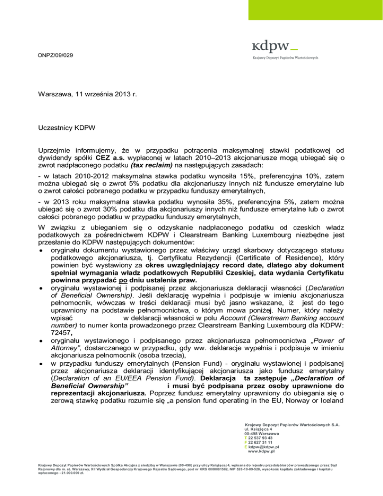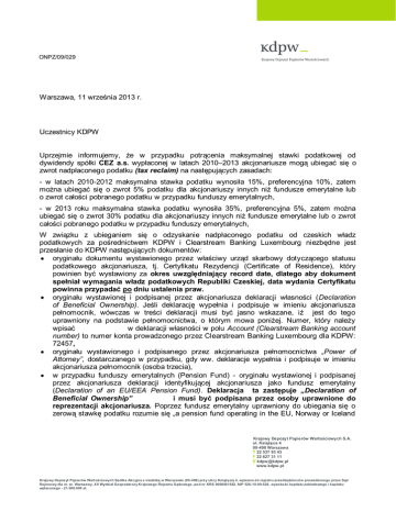 ONPZ/09/029 ONP/01/001 Warszawa, 11 września 2013 r. Uczestnicy KDPW Uprzejmie informujemy, że w przypadku potrącenia maksymalnej stawki podatkowej od dywidendy spółki CEZ a.s. wypłaconej w latach 2010–2013 akcjonariusze mogą ubiegać się o zwrot nadpłaconego podatku (tax reclaim) na następujących zasadach: - w latach 2010-2012 maksymalna stawka podatku wynosiła 15%, preferencyjna 10%, zatem można ubiegać się o zwrot 5% podatku dla akcjonariuszy innych niż fundusze emerytalne lub o zwrot całości pobranego podatku w przypadku funduszy emerytalnych, - w 2013 roku maksymalna stawka podatku wynosiła 35%, preferencyjna 5%, zatem można ubiegać się o zwrot 30% podatku dla akcjonariuszy innych niż fundusze emerytalne lub o zwrot całości pobranego podatku w przypadku funduszy emerytalnych, W związku z ubieganiem się o odzyskanie nadpłaconego podatku od czeskich władz podatkowych za pośrednictwem KDPW i Clearstream Banking Luxembourg niezbędne jest przesłanie do KDPW następujących dokumentów: oryginału dokumentu wystawionego przez właściwy urząd skarbowy dotyczącego statusu podatkowego akcjonariusza, tj. Certyfikatu Rezydencji (Certificate of Residence), który powinien być wystawiony za okres uwzględniający record date, dlatego aby dokument spełniał wymagania władz podatkowych Republiki Czeskiej, data wydania Certyfikatu powinna przypadać po dniu ustalenia praw. oryginału wystawionej i podpisanej przez akcjonariusza deklaracji własności (Declaration of Beneficial Ownership). Jeśli deklarację wypełnia i podpisuje w imieniu akcjonariusza pełnomocnik, wówczas w treści deklaracji musi być jasno wskazane, iż jest do tego uprawniony na podstawie pełnomocnictwa, o którym mowa poniżej. Numer, który należy wpisać w deklaracji własności w polu Account (Clearstream Banking account number) to numer konta prowadzonego przez Clearstream Banking Luxembourg dla KDPW: 72457, oryginału wystawionego i podpisanego przez akcjonariusza pełnomocnictwa „Power of Attorney”, dostarczanego w przypadku, gdy ww. deklaracje wypełnia i podpisuje w imieniu akcjonariusza pełnomocnik (osoba trzecia), w przypadku funduszy emerytalnych (Pension Fund) - oryginału wystawionej i podpisanej przez akcjonariusza deklaracji identyfikującej akcjonariusza jako fundusz emerytalny (Declaration of an EU/EEA Pension Fund). Deklaracja ta zastępuje „Declaration of Beneficial Ownership” i musi być podpisana przez osoby uprawnione do reprezentacji akcjonariusza. Poprzez fundusz emerytalny uprawniony do ubiegania się o zerową stawkę podatku rozumie się „a pension fund operating in the EU, Norway or Iceland Krajowy Depozyt Papierów Wartościowych S.A. ul. Książęca 4 00-498 Warszawa T 22 537 93 43 F 22 627 31 11 E [email protected] www.kdpw.pl Krajowy Depozyt Papierów Wartościowych Spółka Akcyjna z siedzibą w Warszawie (00-498) przy ulicy Książęcej 4, wpisana do rejestru przedsiębiorców prowadzonego przez Sąd Rejonowy dla m. st. Warszawy, XII Wydział Gospodarczy Krajowego Rejestru Sądowego, pod nr KRS 0000081582, NIP 526-10-09-528, wysokość kapitału zakładowego i kapitału wpłaconego - 21.000.000 zł. whose income is not attributable to a permanent establishment of the company in the Czech Republic”, oryginału dokumentu „CREDIT ADVICE” wypełnionego i podpisanego przez uczestnika KDPW dla każdego akcjonariusza z osobna, sporządzonego zgodnie z udostępnionym wzorem. listy akcjonariuszy sporządzonej przez uczestnika KDPW w formacie pliku xls zgodnie z udostępnionym wzorem, przesłanej za pośrednictwem poczty ESDI na skrzynkę 0001032PRD. Lista powinna zawierać: imię i nazwisko (lub nazwę osoby prawnej) akcjonariusza, pełen adres, wnioskowaną stawkę podatku, liczbę akcji, kwotę brutto dywidendy oraz kwotę netto dywidendy naliczoną dla akcjonariusza przy zastosowaniu wskazanej stawki podatkowej. Wzory wszystkich wymienionych powyżej dokumentów zostały zamieszczone na stronie internetowej www.kdpw.pl w zakładce Uczestnicy – Obsługa zagranicznych papierów wartościowych – Obsługa Dywidend – pozycja w tabeli CEZ w kolumnie „ONP”. Treść wzorów uległa zmianie od ubiegłego roku, dlatego niezbędne jest skorzystanie z aktualnie opublikowanych dokumentów. Zwracamy uwagę, iż wszystkie dokumenty przygotowywane przez akcjonariusza (z wyjątkiem Declaration of Beneficial Ownership akcjonariusza będącego osobą fizyczną) powinny być wystawione na papierze firmowym, zawierać datę wystawienia oraz powinny być opatrzone pieczęcią firmową i podpisami uprawnionych osób. Ponadto, konieczne jest aby we wszystkich dokumentach dotyczących danego akcjonariusza występowała dokładnie taka sama nazwa podmiotu ubiegającego się o preferencyjną stawkę podatku. Ewentualne rozbieżności w nazwie akcjonariusza mogą spowodować odrzucenie dokumentów. W przypadku opisanej powyżej procedury tax reclaim zastosowanie mają stawki opłat określone w punkcie 8.6.2. Tabeli Opłat. Koszt przekazania jednego dokumentu stanowi kwotę 200 zł, jednak minimalna stawka opłaty to 800 zł. Prosimy o dostarczanie ww. dokumentów do 30 września 2013 r. Z poważaniem, Krzysztof Ołdak Dyrektor Działu Operacyjnego