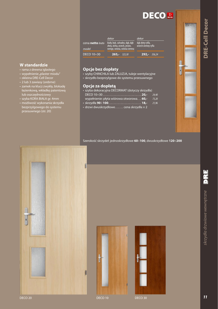 cena netto brutto model dekor dekor biały, buk, calvados, dąb, dąb dąb złoty ryfla, złoty, olcha, orzech, jesion, orzech ciemny ryfla wenge, wiśnia, wiśnia ciemna DECO 10÷30 W standardzie • rama z drewna iglastego • wypełnienie „plaster miodu” • okleina DRE-Cell Decor • 2 lub 3 zawiasy (srebrne) • zamek na klucz zwykły, blokadę łazienkową, wkładkę patentową lub oszczędnościowy • szyba KORA BIAŁA gr. 4mm • możliwość wykonania skrzydła bezprzylgowego do systemu przesuwnego (str. 20) 265,- 323,30 292,- 356,24 DRE-Cell Decor DECO Opcje bez dopłaty • szyby CHINCHILA lub ŻALUZJA, tuleje wentylacyjne • skrzydło bezprzylgowe do systemu przesuwnego Opcje za dopłatą • szyba dekoracyjna DECORMAT (dotyczy skrzydła) DECO 10÷30 . . . . . . . . . . . . . . . . . . . . . . . . . . . . 20,- 24,40 wypełnienie: płyta wiórowa otworowa . . . 60,- 73,20 • skrzydła 90 i 100 . . . . . . . . . . . . . . . . . . . . . . . . 18,- 21,96 • drzwi dwuskrzydłowe . . . . . . cena skrzydła × 2 skrzydła drzwiowe wewnętrzne Szerokość skrzydeł: jednoskrzydłowe 60÷100, dwuskrzydłowe 120÷200 DECO 20 DECO 10 DECO 30 11