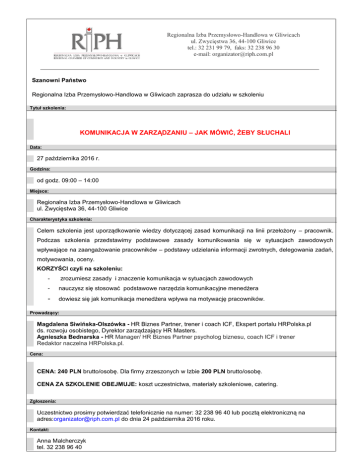 Regionalna Izba Przemysłowo-Handlowa w Gliwicach ul. Zwycięstwa 36, 44-100 Gliwice tel.: 32 231 99 79, faks: 32 238 96 30 e-mail: [email protected] Szanowni Państwo Regionalna Izba Przemysłowo-Handlowa w Gliwicach zaprasza do udziału w szkoleniu Tytuł szkolenia: KOMUNIKACJA W ZARZĄDZANIU – JAK MÓWIĆ, ŻEBY SŁUCHALI Data: 27 października 2016 r. Godzina: od godz. 09:00 – 14:00 Miejsce: Regionalna Izba Przemysłowo-Handlowa w Gliwicach ul. Zwycięstwa 36, 44-100 Gliwice Charakterystyka szkolenia: Celem szkolenia jest uporządkowanie wiedzy dotyczącej zasad komunikacji na linii przełożony – pracownik. Podczas szkolenia przedstawimy podstawowe zasady komunikowania się w sytuacjach zawodowych wpływające na zaangażowanie pracowników – podstawy udzielania informacji zwrotnych, delegowania zadań, motywowania, oceny. KORZYŚCI czyli na szkoleniu: - zrozumiesz zasady i znaczenie komunikacja w sytuacjach zawodowych - nauczysz się stosować podstawowe narzędzia komunikacyjne menedżera - dowiesz się jak komunikacja menedżera wpływa na motywację pracowników. Prowadzący: Magdalena Siwińska-Olszówka - HR Biznes Partner, trener i coach ICF, Ekspert portalu HRPolska.pl ds. rozwoju osobistego, Dyrektor zarządzający HR Masters. Agnieszka Bednarska - HR Manager/ HR Biznes Partner psycholog biznesu, coach ICF i trener Redaktor naczelna HRPolska.pl. Cena: CENA: 240 PLN brutto/osobę. Dla firmy zrzeszonych w Izbie 200 PLN brutto/osobę. CENA ZA SZKOLENIE OBEJMUJE: koszt uczestnictwa, materiały szkoleniowe, catering. Zgłoszenia: Uczestnictwo prosimy potwierdzać telefonicznie na numer: 32 238 96 40 lub pocztą elektroniczną na adres:[email protected] do dnia 24 października 2016 roku. Kontakt: Anna Malcherczyk tel. 32 238 96 40 Regionalna Izba Przemysłowo-Handlowa w Gliwicach ul. Zwycięstwa 36, 44-100 Gliwice tel.: 32 231 99 79, faks: 32 238 96 30 e-mail: [email protected] e-mail: [email protected] W związku z ograniczoną ilością miejsc o uczestnictwie w szkoleniu decyduje kolejność zgłoszeń. Organizator zastrzega sobie prawo do odwołania szkolenia bez podawania przyczyny. PROGRAM: 1. Rola komunikacji w pracy menedżera - monolog vs dialog - analiza transakcyjna w komunikacji- rodzic, dziecko czy dorosły - podstawy asertywności 2. Podstawowe narzędzia komunikacyjne menedżera (algorytmy, zasady, techniki) - zasady udzielania informacji zwrotnych i oceny - stawianie granic - formy zlecania zadań: delegowanie, uprawnianie, wydawanie przedstawianie decyzji - trudne sytuacje komunikacyjne (zwolnienie, nagana itp.) 3. Komunikacja menedżera a zaangażowanie pracowników - wpływ na zaangażowanie czyli jak komunikacja wpływa na motywację - budowanie właściwych relacji szef – podwładny poleceń,