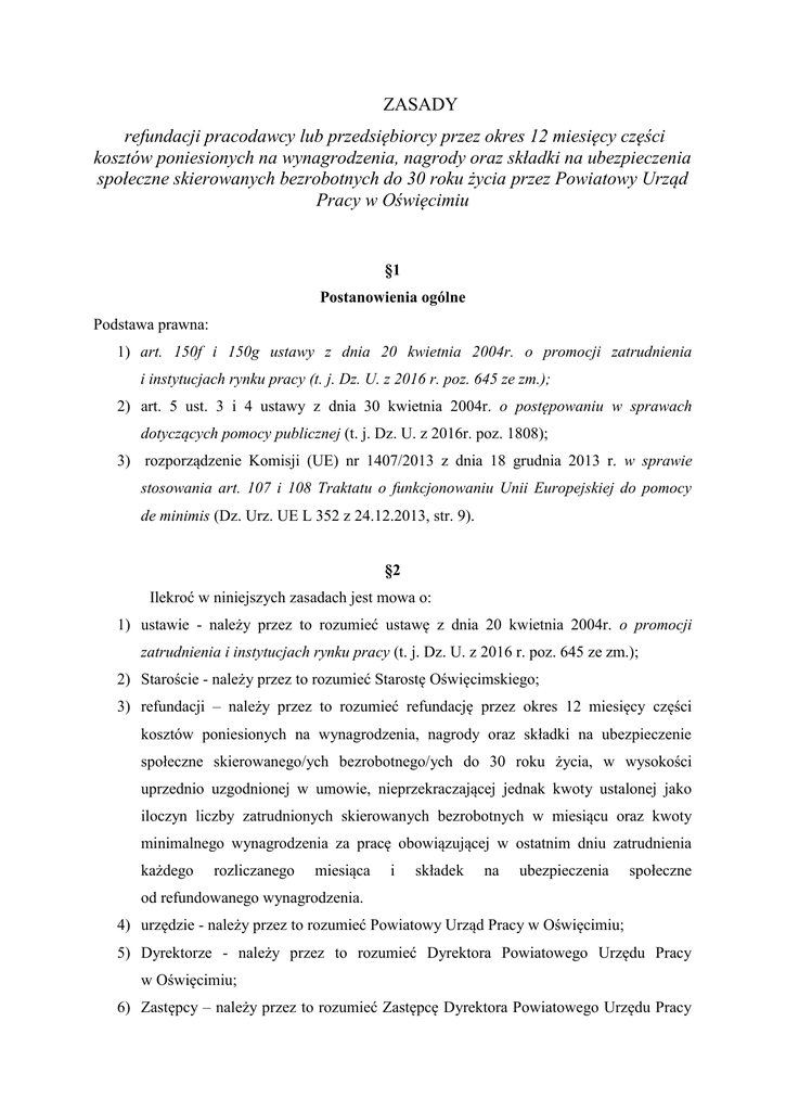 ZASADY refundacji pracodawcy lub przedsiębiorcy przez okres 12 miesięcy części kosztów poniesionych na wynagrodzenia, nagrody oraz składki na ubezpieczenia społeczne skierowanych bezrobotnych do 30 roku życia przez Powiatowy Urząd Pracy w Oświęcimiu §1 Postanowienia ogólne Podstawa prawna: 1) art. 150f i 150g ustawy z dnia 20 kwietnia 2004r. o promocji zatrudnienia i instytucjach rynku pracy (t. j. Dz. U. z 2016 r. poz. 645 ze zm.); 2) art. 5 ust. 3 i 4 ustawy z dnia 30 kwietnia 2004r. o postępowaniu w sprawach dotyczących pomocy publicznej (t. j. Dz. U. z 2016r. poz. 1808); 3) rozporządzenie Komisji (UE) nr 1407/2013 z dnia 18 grudnia 2013 r. w sprawie stosowania art. 107 i 108 Traktatu o funkcjonowaniu Unii Europejskiej do pomocy de minimis (Dz. Urz. UE L 352 z 24.12.2013, str. 9). §2 Ilekroć w niniejszych zasadach jest mowa o: 1) ustawie - należy przez to rozumieć ustawę z dnia 20 kwietnia 2004r. o promocji zatrudnienia i instytucjach rynku pracy (t. j. Dz. U. z 2016 r. poz. 645 ze zm.); 2) Staroście - należy przez to rozumieć Starostę Oświęcimskiego; 3) refundacji – należy przez to rozumieć refundację przez okres 12 miesięcy części kosztów poniesionych na wynagrodzenia, nagrody oraz składki na ubezpieczenie społeczne skierowanego/ych bezrobotnego/ych do 30 roku życia, w wysokości uprzednio uzgodnionej w umowie, nieprzekraczającej jednak kwoty ustalonej jako iloczyn liczby zatrudnionych skierowanych bezrobotnych w miesiącu oraz kwoty minimalnego wynagrodzenia za pracę obowiązującej w ostatnim dniu zatrudnienia każdego rozliczanego miesiąca i składek na ubezpieczenia społeczne od refundowanego wynagrodzenia. 4) urzędzie - należy przez to rozumieć Powiatowy Urząd Pracy w Oświęcimiu; 5) Dyrektorze - należy przez to rozumieć Dyrektora Powiatowego Urzędu Pracy w Oświęcimiu; 6) Zastępcy – należy przez to rozumieć Zastępcę Dyrektora Powiatowego Urzędu Pracy w Oświęcimiu; 7) bezrobotnym – należy przez to rozumieć osobę do 30 roku życia zarejestrowaną w Powiatowym Urzędzie Pracy w Oświęcimiu, spełniającą przesłanki z art. 2 ust. 1 pkt 2 ustawy; 8) Wnioskodawcy – należy przez to rozumieć pracodawcę lub przedsiębiorcę, u którego w okresie ostatnich 6 miesięcy przed złożeniem wniosku nie nastąpiło zmniejszenie zatrudnienia z przyczyn dotyczących zakładu pracy; 9) minimalnym wynagrodzeniu - należy przez to rozumieć minimalne wynagrodzenie za pracę pracowników przysługujące za pracę w pełnym miesięcznym wymiarze czasu pracy ogłaszane na podstawie ustawy z dnia 10 października 2002r. o minimalnym wynagrodzeniu za pracę (t. j. Dz. U. z 2015r. poz. 2008 ze zm.). §3 Warunki przyznawania refundacji 1. Starosta może zawrzeć umowę, na podstawie której refunduje Wnioskodawcy część kosztów poniesionych na wynagrodzenia, nagrody oraz składki na ubezpieczenia społeczne skierowanych bezrobotnych, w wysokości uprzednio uzgodnionej, nieprzekraczającej jednak kwoty ustalonej jako iloczyn liczby zatrudnionych skierowanych bezrobotnych w miesiącu oraz kwoty minimalnego wynagrodzenia za pracę obowiązującej w ostatnim dniu zatrudnienia każdego rozliczanego miesiąca i składek na ubezpieczenia społeczne od refundowanego wynagrodzenia. 2. Wnioskodawca obowiązany jest do utrzymania zatrudnienia w pełnym wymiarze czasu pracy skierowanego bezrobotnego przez okres, za który dokonywana jest refundacja, o której mowa w ust. 1, oraz przez okres 12 miesięcy po zakończeniu tej refundacji. 3. Do zatrudnienia w ramach refundacji uprawnione są osoby bezrobotne do 30 roku życia, dla których urząd ustalił II profil pomocy. 4. W ramach refundacji może nie zostać skierowany: 1) małżonek; 2) osoba spokrewniona w linii prostej do pierwszego stopnia z Wnioskodawcą (ojciec/matka, syn/córka); 3) osoba spokrewniona w linii bocznej do drugiego stopnia z Wnioskodawcą (rodzeństwo). 5. Refundacja, o której mowa w ust. 1 jest udzielana zgodnie z warunkami dopuszczalności pomocy de minimis. §4 Przeznaczenie środków w ramach przyznanej refundacji 1. Refundacji podlega część kosztów poniesionych na wynagrodzenia, nagrody oraz składki na ubezpieczenia społeczne skierowanych bezrobotnych, w wysokości uprzednio uzgodnionej, nieprzekraczającej jednak kwoty ustalonej jako iloczyn liczby zatrudnionych skierowanych bezrobotnych w miesiącu oraz kwoty minimalnego wynagrodzenia za pracę obowiązującej w ostatnim dniu zatrudnienia każdego rozliczanego miesiąca i składek na ubezpieczenia społeczne od refundowanego wynagrodzenia wypłaca się refundację. 2. Refundacja w ramach zawartej umowy dokonywana jest na podstawie składanego co miesiąc wniosku o refundację, który stanowi załącznik do umowy wraz z określonymi w umowie dokumentami. 3. Refundacja będzie wypłacana przez Urząd w okresach miesięcznych z dołu, przelewem na rachunek bankowy Wnioskodawcy, w terminie określonym w umowie. §5 Procedura rozpatrywania wniosku o przyznanie refundacji 1. Wnioskodawca zainteresowany uzyskaniem środków w ramach refundacji składa w urzędzie wniosek o zatrudnienie w ramach refundacji pracodawcy lub przedsiębiorcy części kosztów poniesionych na wynagrodzenia, nagrody oraz składki na ubezpieczenie społeczne skierowanych bezrobotnych. 2. Wniosek może być uwzględniony po spełnieniu przez Wnioskodawcę warunków określonych w niniejszych Zasadach, jest prawidłowo sporządzony oraz gdy Urząd dysponuje środkami pieniężnymi na jego sfinansowanie. 3. Wnioski niekompletne, bez wymaganych załączników oraz podpisane przez osoby nieupoważnione nie będą rozpatrywane do czasu uzupełnienia braków w terminie wskazanym przez Urząd. 4. Wnioski nieuzupełnione w terminie, o którym mowa w ust. 4 pozostawia się bez rozpatrzenia. 5. O sposobie rozparzenia wniosku urząd powiadamia Wnioskodawcę w formie pisemnej, w terminie 30 dni od dnia złożenia kompletnego wniosku. W przypadku bra
