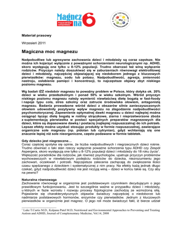 Materiał prasowy Wrzesień 2011 Magiczna moc magnezu Nadpobudliwe lub agresywne zachowania dzieci i młodzieży są coraz częstsze. Nie można ich kojarzyć wyłącznie z poważnymi schorzeniami neurologicznymi np. ADHD, skoro występują one tylko u 8-12% populacji. Trudno obarczać też winą wyłącznie rodziców. Przyczyn należy doszukiwać się w zaburzeniach równowagi elektrolitowej dzieci i młodzieży, najczęściej objawiającej się niedoborem jednego z kluczowych pierwiastków: magnezu, sodu lub potasu. Nadpobudliwość, agresja, zmienność nastroju, osłabienie pamięci i koncentracji, to najczęstsze objawy zbyt niskiego poziomu magnezu. Wg badań IŻŻ niedobór magnezu to poważny problem w Polsce, który dotyka ok. 20% dzieci w wieku przedszkolnym i ponad 50% w wieku szkolnym. Wśród przyczyn niskiego poziomu magnezu należy wymienić niewłaściwą dietę bogatą w fast-foody i napoje typu cola, stres szkolny oraz zatrucie środowiska ołowiem, antagonistą magnezu. Badania prowadzone wśród dzieci z obszarów silnie zanieczyszczonych ołowiem udowodniły pozytywny wpływ magnezu na złagodzenie nadpobudliwości psychomotorycznej. Zapewnienie optymalnej dawki magnezu u dzieci najlepiej można osiągnąć łącząc dietę bogatą w rośliny strączkowe, ziarna i nieprzetworzone zboża z suplementacją pierwiastka w postaci specjalnych preparatów magnezowych dla dzieci, które są dopasowane dawką i postacią (najlepiej rozpuszczalną) do ich potrzeb. Lepsze efekty można uzyskać stosując produkty w formie rozpuszczalnej, zawierające organiczne sole magnezu (np. pidolan lub cytrynian), gdyż wchłaniają się one znacznie lepiej niż sole nieorganiczne, często podawane w formie tabletek. Gdy dziecko jest niegrzeczne… Coraz częściej spotyka się opinie, że liczba nadpobudliwych i niegrzecznych dzieci rośnie. Trudno obwiniać o taki stan rzeczy wyłącznie poważne schorzenia typu ADHD czy Zespół Aspergera, skoro występują one tylko u 8-12% populacji dzieci i młodzieży do 18 roku życia1. Większość poradników dla rodziców, jak również psychologów, upatruje przyczyn problemów wychowawczych w niewłaściwym podejściu rodziców do dziecka, niezrozumieniu jego zachowań, oczekiwań i potrzeb. Najczęstsze zalecenia zachęcają do zwiększenia ilości czasu spędzanego z dzieckiem i systematycznej z nim pracy. Na efekty każą jednak długo czekać, gdyż nadpobudliwość dzieci nie jest niczyją winą – dzieci w końcu takie są. Czy aby na pewno? Naturalna równowaga Zachowanie równowagi w organizmie jest podstawowym czynnikiem decydującym o jego prawidłowym funkcjonowaniu. Jest to szczególnie ważne w przypadku dzieci i młodzieży, u których w fazie wzrostu i rozwoju procesy fizjologiczne zachodzą ze wzmożoną siłą. Pojawianie się charakterystycznych objawów świadczy najczęściej o niedoborze lub nadmiarze podstawowych hormonów, enzymów czy pierwiastków. Jednym z kluczowych pierwiastków w organizmie jest magnez. O jego roli może świadczyć fakt, iż bierze udział Luke T.Curtis M.D., Kalpana Patel M.D, Nutritional and Environmental Approaches to Preventing and Treating Autism and ADHD, Journal of Complementary Medicine, Vol.14, 2008 1 w ponad 320 procesach biochemicznych zachodzących u człowieka 2. Dlatego niedobór magnezu u dziecka lub dorosłego może powodować wiele zróżnicowanych symptomów. Najczęściej spotykane i poznane są objawy ze strony układu nerwowego (ośrodkowego, obwodowego lub autonomicznego)3.Ze strony ośrodkowego układu nerwowego najczęściej wystąpić mogą nadpobudliwość, zmienność nastroju, zaburzenia koncentracji, uwagi i pamięci. Reakcją obwodowego układu nerwowego na niedobór magnezu jest wzmożona pobudliwość nerwowo-mięśniowa, drżenia i bolesne kurcze mięśni. Związane z niedoborem magnezu dysfunkcje układu autonomicznego mogą dotyczyć zarówno układu współczulnego, jak i przywspółczulnego i objawiać się jako zespoły objawów psychonerwicowych. Wśród innych objawów niedoboru magnezu, także u dzieci, można wymienić: bóle wzrostowe w okresie dojrzewania, osteoporozę młodzieńczą, krzywicę, zaburzenia rytmu serca, otyłość i nadciśnienie tętnicze. Magnez – klucz do sukcesu Patrząc na objawy neurologiczne niedoboru magnezu widać wyraźnie ich zbieżność z cechami zachowań agresywnych i nadpobudliwych dzieci. Pojawia się pytanie, czy dzieci i młodzież w Polsce spożywają właściwe dawki magnezu? Wg badań populacyjnych przeprowadzonych przez Instytut Żywności i Żywienia w 2003, średnio około 20% dzieci w wieku przedszkolnym oraz ponad 50% w wieku szkolnym nie przyjmuje zalecanej, dziennej dawki magnezu, przy czym większy niedobór występuje u dziewczynek niż u chłopców4. Zalecane dzienne spożycie (ZDS) magnezu u dzieci i młodzieży kształtuje się następująco5: • Dzieci w wieku 4-8 lat – 130mg/dzień • Dziewczynki w wieku 9-13 lat – 240mg/dzień • Chłopcy w wieku 9-13 lat – 240mg/dzień • Dziewczynki w wieku 14-18 lat – 360mg/dzień • Chłopcy w wieku 14-18 lat – 410mg/dzień Problem jest tym poważniejszy, że magnez należy do grupy pierwiastków słabo przyswajalnych przez organizm. Z pokarmów wchłania się go zaledwie od 15 do 40%. Zbilansowana dieta Najprostszą receptą na właściwy poziom magnezu u dzieci i młodzieży jest prawidłowa i zbilansowana dieta. Powinna być bogata w pokarmy zawierające znaczne dawki magnezu. Największe ilości tego pierwiastka występują w produktach mącznych wyprodukowanych z nieprzetworzonej mąki (razowe pieczywo na zakwasie) a także w nieoczyszczonym ryżu, lub kaszy (np. gryczana), płatkach owsianych czy nasionach (orzechy, migdały). Duże dawki magnezu znajdziemy także w roślinach strączkowych (fasola, groch) lub warzywach zielonych (najwięcej w szpinaku). Ważnym źródłem magnezu jest też kakao lub czekolada. Niestety pokarmy bogate w magn