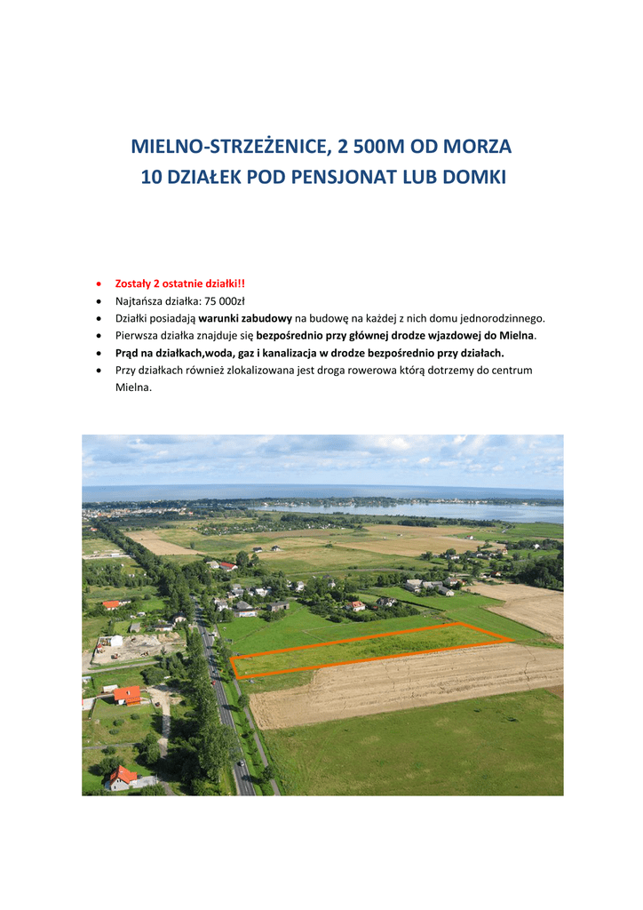 MIELNO-STRZEŻENICE, 2 500M OD MORZA 10 DZIAŁEK POD PENSJONAT LUB DOMKI Zostały 2 ostatnie działki!! Najtańsza działka: 75 000zł Działki posiadają warunki zabudowy na budowę na każdej z nich domu jednorodzinnego. Pierwsza działka znajduje się bezpośrednio przy głównej drodze wjazdowej do Mielna. Prąd na działkach,woda, gaz i kanalizacja w drodze bezpośrednio przy działach. Przy działkach również zlokalizowana jest droga rowerowa którą dotrzemy do centrum Mielna. LOKALIZACJA I PLAN PODZIAŁU: Nasza oferta to 2 działki o powierzchniach 1000 m2 każda, które umiejscowione są w Strzeżeniach, w gminie Będzino, 2,5 km od morza, w bezpośrednim sąsiedztwie drogi prowadzącej do położonego nieopodal (2 km) Mielna. Występują tu korzystne warunki terenowe – parcele znajdują się na płaskim terenie, co stanowi optymalny warunek do komercyjnej zabudowy. W przyszłości mogą tu powstać takie obiekty, jak pensjonat, gospodarstwo agroturystyczne, domki letniskowe lub inne obiekty o przeznaczeniu typowo turystycznym. Zapewniony jest łatwy dostęp do mediów – obydwie działki mają zainstalowane tzw. skrzynki elektryczne (licznik prądu wraz ze złączem), a sąsiadująca asfaltowa droga wyposażona jest w przyłącze wody. Lokalizacja na mapie google:http://goo.gl/maps/18IEQ Odległości: Od najbliższych zabudowań Od morza (w linii prostej) Od Jeziora Jamno Od centrum Strzeżenic Od centrum Mielna Od Koszalina Plan podziału: 10m 2500m 1100m 200m 2000m 8km Zaprojektowane z myślą o Tobie: Dołożyliśmy wszelkich starań, by oferowane przez nas działki spełniały oczekiwania najbardziej wymagających klientów. Ich parametry takie jak kształt, wymiary i dostęp do drogi publicznej sprawiają, że stanowią one idealne miejsce na budowę domku letniskowego, domu a także pensjonatu. Udało nam się osiągnąć niezwykle funkcjonalny układ przestrzenny działek, który sprzyja utworzeniu osiedlowej społeczności. Dodatkowo, szerokie drogi wewnętrzne o rozpiętości aż 8m usprawnią poruszanie się i komunikację na „mini osiedlu”. Wszystko to znacznie ułatwi odgrodzenie całego terenu i zrzeszenie mieszkańców. Prestiż, spokój i wygoda: Każdy z nas chciałby czasem odpocząć od zgiełku, tłumu i hałasu. Często marzymy o cichym i spokojnym miejscu, w którym nic nie zakłóca naszego relaksu i harmonii. Strzeżenice należą do niewielu takich terenów nad morzem – znikome zatłoczenie, lasy, spokojna okolica i szeroka plaża gwarantują, że znajdziesz tu swoją oazę spokoju na łonie natury. W nowej lokalizacji zamienisz ciasnotę i tłok na przestrzeń i swobodę, a tłumy obcych ludzi na miłe sąsiedztwo. Spokój i urok małej miejscowości oraz bliskość większych miast zapewnią, że w pobliżu znajdziesz wszystko, o czym marzysz. Zakup działki w tak wyjątkowym położeniu to luksus, przynoszący zysk i unikatowe miejsce wypoczynku. Przykładowe wizualizacje zagospodarowania działek budowlanych: PEWNA INWESTYCJA I LOKATA KAPITAŁU: W obecnych czasach ciężko znaleźć stabilną formę inwestowania. Lokowanie kapitału w ziemię przeczy temu całkowicie. Jest z pewnością jedną z najbezpieczniejszych form. Stabilne, systematyczne i co najważniejsze wysokie zyski powodują, że jest coraz częściej wybieraną drogą przez wytrawnych inwestorów. Z badan przeprowadzonych przez instytut Homo Homini w lutym 2012 roku wynika, że aż 65% Polaków uważa, że najlepszym zabezpieczeniem na emeryturę jest posiadanie nieruchomości. Jak wynika z danych opublikowanych przez portal Rzeczpospolita Online, Polacy wyjątkowo cenią sobie zakup ziemi jako najlepsze zabezpieczenie finansowe na emeryturę.... Atuty: 2500m od morza 1100m od Jeziora Jamno 2000m od Centrum Mielna działki budowlane – na podstawie decyzji o warunkach zabudowy bliskość mediów – woda w ulicy, prąd na działkach bardzo dobry dojazd – gminna droga asfaltowa bliskie sąsiedztwo zabudowań - 50m dostęp do drogi publicznej (asfaltowej): pierwsza działka bezpośrednio, druga przez drogę wewnętrzną. wymiary działki pozwalające na dopasowanie większości projektów domów droga rowerowa bezpośrednio przy pierwszej działce. *Niniejszy opis służy wyłącznie celom informacyjnym i nie stanowi oferty handlowej w rozumieniu przepisów kodeksu cywilnego. Dołożyliśmy wszelkich możliwych starań, aby zapewnić najwyższą jakość i wartość informacyjną opisu, nie można jednak zagwarantować że nie zawierają błędów.