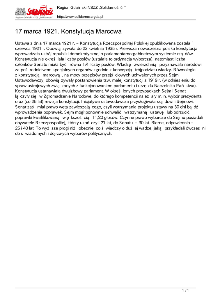 Region Gda ski NSZZ „Solidarno http://www.solidarnosc.gda.pl 17 marca 1921. Konstytucja Marcowa Ustawa z dnia 17 marca 1921 r. ‒ Konstytucja Rzeczpospolitej Polskiej opublikowana została 1 czerwca 1921 r. Obowi zywała do 23 kwietnia 1935 r. Pierwsza nowoczesna polska konstytucja wprowadzała ustrój republiki demokratycznej o parlamentarno-gabinetowym systemie rz dów. Konstytucja nie okre lała liczby posłów (ustalała to ordynacja wyborcza), natomiast liczba członków Senatu miała by równa 1/4 liczby posłów. Władz zwierzchni przyznawała narodowi za po rednictwem specjalnych organów zgodnie z koncepcj trójpodziału władzy. Równolegle z konstytucj marcow , na mocy przepisów przej ciowych uchwalonych przez Sejm Ustawodawczy, obowi zywały postanowienia tzw. małej konstytucji z 1919 r. (w odniesieniu do spraw ustrojowych zwi zanych z funkcjonowaniem parlamentu i urz du Naczelnika Pa stwa). Konstytucja ustanawiała dwuizbowy parlament. W okre lonych przypadkach Sejm i Senat ł czyły si w Zgromadzenie Narodowe, do którego kompetencji nale ały m.in. wybór prezydenta oraz (co 25 lat) rewizja konstytucji. Inicjatywa ustawodawcza przysługiwała rz dowi i Sejmowi, Senat za miał prawo weta zawieszaj cego, czyli wstrzymania projektu ustawy na 30 dni b d wprowadzenia poprawek. Sejm mógł ponownie uchwali wstrzyman ustaw lub odrzuci poprawki kwalifikowan wi kszo ci 11/20 głosów. Czynne prawo wyborcze do Sejmu posiadali obywatele Rzeczpospolitej, którzy uko czyli 21 lat, do Senatu ‒ 30 lat. Bierne, odpowiednio ‒ 25 i 40 lat. To wy sze progi ni obecnie, co wiadczy o du ej wadze, jak przykładali ówcze ni do wiadomych i dojrzałych wyborów politycznych. 1/1 Powered by TCPDF (www.tcpdf.org)
