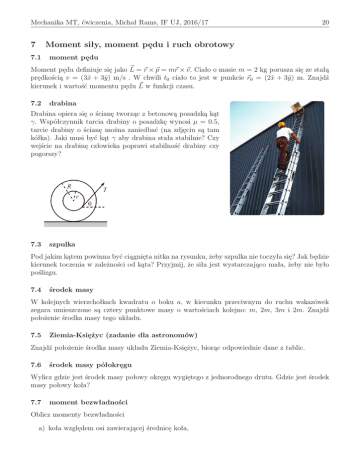 Mechanika MT, ćwiczenia, Michał Rams, IF UJ, 2016/17 7 20 Moment siły, moment pędu i ruch obrotowy 7.1 moment pędu þ = þr × pþ = mþr × þv . Ciało o masie m = 2 kg porusza się ze stałą Moment pędu definiuje się jako L prędkością v = (3x̂ + 3ŷ) m/s . W chwili t0 ciało to jest w punkcie þr0 = (2x̂ + 3ŷ) m. Znajdź þ w funkcji czasu. kierunek i wartość momentu pędu L 7.2 drabina Drabina opiera się o ścianę tworząc z betonową posadzką kąt γ. Współczynnik tarcia drabiny o posadzkę wynosi µ = 0.5, tarcie drabiny o ścianę można zaniedbać (na zdjęciu są tam kółka). Jaki musi być kąt γ aby drabina stała stabilnie? Czy wejście na drabinę człowieka poprawi stabilność drabiny czy pogorszy? 7.3 szpulka Pod jakim kątem powinna być ciągnięta nitka na rysunku, żeby szpulka nie toczyła się? Jak będzie kierunek toczenia w zależności od kąta? Przyjmij, że siła jest wystarczająco mała, żeby nie było poślizgu. 7.4 środek masy W kolejnych wierzchołkach kwadratu o boku a, w kierunku przeciwnym do ruchu wskazówek zegara umieszczone są cztery punktowe masy o wartościach kolejno: m, 2m, 3m i 2m. Znajdź położenie środka masy tego układu. 7.5 Ziemia-Księżyc (zadanie dla astronomów) Znajdź położenie środka masy układu Ziemia-Księżyc, biorąc odpowiednie dane z tablic. 7.6 środek masy półokręgu Wylicz gdzie jest środek masy połowy okręgu wygiętego z jednorodnego drutu. Gdzie jest środek masy połowy koła? 7.7 moment bezwładności Oblicz momenty bezwładności a) koła względem osi zawierającej średnicę koła, Mechanika MT, ćwiczenia, Michał Rams, IF UJ, 2016/17 21 b) kwadratu względem jego przekątnej, c) trójkąta równobocznego względem osi wzdłuż jednego boku. d) połowy koła względem średnicy. 7.8 zachowanie momentu pędu Na śliskim lodzie leży cienki pręt o masie m i długosci l. Uderza w niego kamień o masie M , który wcześniej poruszał się z prędkością V0 prostopadle do pręta. Zakładając, że zderzenie było idealnie sprężyste, oblicz jak porusza się pręt po zderzeniu. 7.9 toczenie okręgu Okrąg o promieniu R toczy się bez poślizgu po poziomej powierzchni. Środek okręgu przesuwa się z prędkością vcm względem powierzchni. Zapisz prędkość chwilową dowolnego punktu na okręgu. Uzasadnij, że można ten ruch opisać jako obrót całego okręgu wokół punktu styku z podłożem. Policz energie kinetyczną na dwa sposoby: dodając ruch postępowy i obrotowy, oraz mając tylko ruch obrotowy wokół punktu styku z podłożem. 7.10 hula hop Obręcz jest rzucona tak, że ma liniową prędkość środka masy vcm , ale obraca się z prędkością ω w przeciwną stronę ślizgając się przez chwilę po podłodze, a potem tocząc się. Jak duże musi być ω, żeby obręcz wróciła do rzucającego? 7.11 przewracanie klocka Na górny róg kwadratowego klocka o masie m działamy siłą F , jak na rysunku poniżej. Powierzchnia na której leży klocek jest gładka i nie ma tarcia, więc pod wpływem siły F klocek zaczyna się poruszać. Działa również przyspieszenie ziemskie g. Czy klocek może zacząć się wywracać? 7.12 opona na stoku Opona została umieszczona na równi pochyłej i puszczona. Czy opona szybciej znajdzie sie na dole w przypadku gdy jej tarcie o równię będzie równe zero, czy gdy tarcie będzie wystarczająco duże, żeby nie było poślizgu? Ile razy szybciej? Można przybliżyć moment bezwładności opony przez I = M R2 . 7.13 siła Coriolisa Na równiku Ziemi z wieży o wysokości h = 50 m upuszczono kamień. Jak daleko od wieży spadnie kamień? W którą stronę? Mechanika MT, ćwiczenia, Michał Rams, IF UJ, 2016/17 7.14 22 jojo ** (premiuję rozwiązania dostarczone na kartce na początku ćwiczeń) Drewniane jojo (9.50 zł z dostawą na allegro) ma średnicę R, masę M . Nitka ma długość L i po nawinięciu wypełnia całą szpulkę, aż do średnicy R. Ośka szpulki w środku ma znikomy promień. Po nawinięciu nitki jojo zostało puszczone. Przyspieszenie ziemskie wynosi g. Po jakim czasie cała nitka się rozwinie? Założenia dodatkowe: nitka jest lekka, więc praktycznie całą masę stanowią drewniane boki. Moment bezwładności jest stały i wynosi M R2 /2. Startuje się z pozycji w której trzymany koniec nitki jest na wysokości ośki (z boku joja). Ruch w poziomie można zaniedbać. Wszystkie opory ruchu należy zaniedbać. Nitka rozwija się jakby to była starannie nawinięta tasiemka. Jeżeli otrzyma się trudną do obliczenia całkę to najłatwiej zapisać ją tak, żeby całkowanie było po bezwymiarowych zmiennych i policzyć to w sposób przybliżony numerycznie, np. w programie Mathematica. Ú 1ó 3 − 2x dx ≃ 4.37 x(1 − x) 0