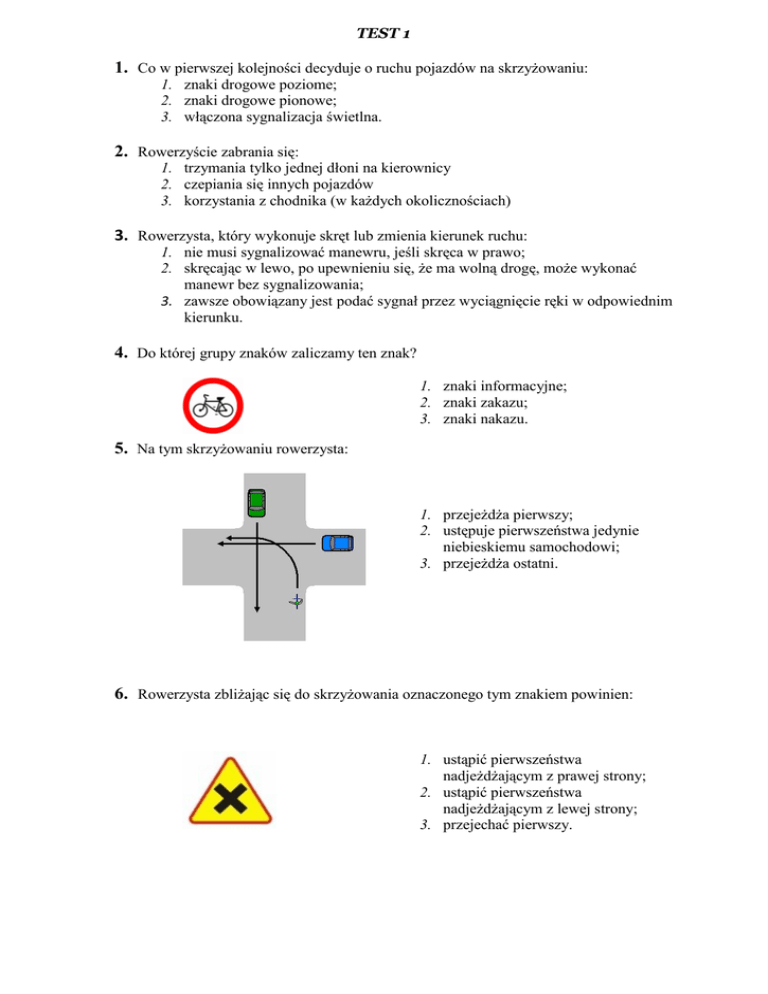 TEST 1 1. Co w pierwszej kolejności decyduje o ruchu pojazdów na skrzyżowaniu: 1. znaki drogowe poziome; 2. znaki drogowe pionowe; 3. włączona sygnalizacja świetlna. 2. Rowerzyście zabrania się: 1. trzymania tylko jednej dłoni na kierownicy 2. czepiania się innych pojazdów 3. korzystania z chodnika (w każdych okolicznościach) 3. Rowerzysta, który wykonuje skręt lub zmienia kierunek ruchu: 1. nie musi sygnalizować manewru, jeśli skręca w prawo; 2. skręcając w lewo, po upewnieniu się, że ma wolną drogę, może wykonać manewr bez sygnalizowania; 3. zawsze obowiązany jest podać sygnał przez wyciągnięcie ręki w odpowiednim kierunku. 4. Do której grupy znaków zaliczamy ten znak? 1. znaki informacyjne; 2. znaki zakazu; 3. znaki nakazu. 5. Na tym skrzyżowaniu rowerzysta: 1. przejeżdża pierwszy; 2. ustępuje pierwszeństwa jedynie niebieskiemu samochodowi; 3. przejeżdża ostatni. 6. Rowerzysta zbliżając się do skrzyżowania oznaczonego tym znakiem powinien: 1. ustąpić pierwszeństwa nadjeżdżającym z prawej strony; 2. ustąpić pierwszeństwa nadjeżdżającym z lewej strony; 3. przejechać pierwszy. 7. Który z tych znaków informuje nas, że znajdujemy się na drodze głównej? 1. A 2. B 3. C 9. Prawidłowa kolejność przejazdu to: 1. B, C, A 2. A, B i C 3. A, C, B 11.Włączanie się do ruchu to: 8. Przedstawiony znak ostrzega o: 1. podłużnym uskoku na jezdni; 2. niebezpiecznym poboczu; 3. pracach drogowych na połowie jezdni. 10.Komu rowerzysta (A) musi ustąpić pierwszeństwa przejazdu? 1. pojazdowi B 2. pojazdowi C 3. wszystkim pojazdom 1. wjeżdżanie z drogi dla rowerów na jezdnię; 2. ruszanie w momencie zaświecenia się sygnału zielonego; 3. ruszanie po zatrzymaniu przed przejściem dla pieszych. 12.Prawidłowa kolejność przejazdu to: 13.Jaka będzie kolejność przejazdu przez to skrzyżowanie? 1. C, A, B 2. B, A, C 3. C, B, A 1. C, A, B 2. C, B, A 3. B, A, C 14.Prawidłowa kolejność przejazdu to: 15.Prawidłowa kolejność przejazdu to: 1. C, A, B 2. B, A, C 3. C, B, A 1. C, A, B 2. C, B, A 3. B, A, C 16.Komu kierujący rowerem (A) jest zobowiązany ustąpić pierwszeństwa przejazdu?: 1. pojazdowi C; 2. pojazdowi B – karetce uczestniczącej w akcji; 3. pojazdom B i C. 17.Przedstawiony znak informuje o wjeździe na drogę: 1. o jednym pasie ruchu; 2. o jednym kierunku ruchu; 3. o obowiązkowej jeździe na wprost przez skrzyżowanie. 18.Na widok którego z tych znaków rowerzysta powinien ustąpić pierwszeństwa przejazdu? 1. A 2. B 3. C 19.Widząc taki znak rowerzysta: 1. nie może zawracać i skręcać w lewo na najbliższym skrzyżowaniu; 2. nie może skręcać w lewo na najbliższym skrzyżowaniu, ale może zawracać; 3. nie może skręcić w lewo na odcinku między znakiem a skrzyżowaniem, po to by wjechać na podwórze. 20.Prawidłowa kolejność przejazdu to: 1. C, A, B 2. C, B, A 3. C i A, B 21.Na tym skrzyżowaniu rowerzysta: 1. przejeżdża pierwszy; 2. ustępuje pierwszeństwa jedynie zielonemu samochodowi; 3. ustępuje pierwszeństwa jedynie niebieskiemu samochodowi. 22. Który ze znaków nakazuje jazdę prosto przez skrzyżowanie? 1. A 2. B 3. C 23.Widząc ten znak, kierujący pojazdem, jadący prosto przez skrzyżowanie: 1. przejeżdża pierwszy 2. ustępuje pierwszeństwa pojazdowi z lewej strony; 3. przejeżdża przed pojazdem z prawej strony. 24.Ten znak: 1. informuje tylko, że masz do wyboru bezpieczną drogę dla rowerów 2. zabrania jazdy rowerem tak oznaczoną drogą 3. zobowiązuje rowerzystę do korzystania z tak oznaczonej drogi lub pasa ruchu 25.W przedstawionej sytuacji pojazdy przejeżdżają w następującej kolejności: 1. 2. 3. rowerzysta, pojazd nr 1, pojazd nr 2; pojazd nr 1, pojazd nr 2, rowerzysta; pojazd nr 2, rowerzysta, pojazd nr 1. 1. ustępuje pierwszeństwa pojazdowi nr 1 i pojazdowi nr 2; przejeżdża pierwszy; ustępuje pierwszeństwa pojazdowi nr 1. 26. Na tym skrzyżowaniu rowerzysta: 2. 3. 27. W tej sytuacji skrzyżowanie opuszczają kolejno pojazdy: 1. pojazd nr 2, następnie pojazd nr 3 i pojazd nr 1 mogą je opuścić jednocześnie, jeśli nie spowoduje to zagrożenia bezpieczeństwa ruchu na drodze; 2. pojazd nr 2, pojazd nr 1, natomiast pojazd nr 3 ma zakaz wjazdu za sygnalizator; 3. pojazd nr 1, pojazd nr 2, pojazd nr 3;
