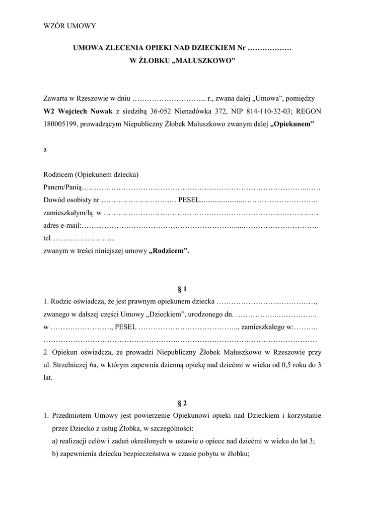 WZÓR UMOWY UMOWA ZLECENIA OPIEKI NAD DZIECKIEM Nr ……………… W ŻŁOBKU „MALUSZKOWO” Zawarta w Rzeszowie w dniu ……………………….... r., zwana dalej „Umowa”, pomiędzy W2 Wojciech Nowak z siedzibą 36-052 Nienadówka 372, NIP 814-110-32-03; REGON 180005199, prowadzącym Niepubliczny Żłobek Maluszkowo zwanym dalej „Opiekunem” a Rodzicem (Opiekunem dziecka) Panem/Panią………………………………………………………………………………..…… Dowód osobisty nr ……………………….… PESEL.......................…………………………. zamieszkałym/łą w ……………………………………………………………….…………… adres e-mail:……...……………………………………………….....…………………………. tel……………………... zwanym w treści niniejszej umowy „Rodzicem”. §1 1. Rodzic oświadcza, że jest prawnym opiekunem dziecka ……………………..……………, zwanego w dalszej części Umowy „Dzieckiem”, urodzonego dn. ……………..…………….. w ……………………., PESEL ………………………………….., zamieszkałego w:………. ……………………………………………….………………………………………………… 2. Opiekun oświadcza, że prowadzi Niepubliczny Żłobek Maluszkowo w Rzeszowie przy ul. Strzelniczej 6a, w którym zapewnia dzienną opiekę nad dziećmi w wieku od 0,5 roku do 3 lat. §2 1. Przedmiotem Umowy jest powierzenie Opiekunowi opieki nad Dzieckiem i korzystanie przez Dziecko z usług Żłobka, w szczególności: a) realizacji celów i zadań określonych w ustawie o opiece nad dziećmi w wieku do lat 3; b) zapewnienia dziecku bezpieczeństwa w czasie pobytu w żłobku; WZÓR UMOWY c) sprawowania opieki nad dzieckiem w sposób dostosowany do jego wieku i potrzeb rozwojowych; d) wspomagania wychowawczej roli rodziny; 2. Żłobek zapewnia opiekę nad Dzieckiem w godzinach pracy Żłobka, wspomagając indywidualny rozwój dziecka, zapewniając bezpieczne warunki pobytu, zaspokajając niezbędne potrzeby psychiczne i fizyczne Dziecka. 3. Zasady i zakres świadczonych usług, a także funkcjonowania Żłobka określa statut, regulamin żłobka i regulamin organizacyjny. §3 1. Umowa zostaje zawarta na okres od ............................................... do ukończenia roku szkolnego, w którym dziecko ukończy 3 lata. 2. Opieka nad Dzieckiem będzie sprawowana w godzinach pracy Żłobka w ramach wniesionej opłaty. 3. Żłobek czynny jest od godziny 6:30 do 17:30, od poniedziałku do piątku, z wyjątkiem świąt, innych dni ustawowo wolnych od pracy, tzw. „długich weekendów”. §4 W czasie przebywania w Żłobku Dziecko będzie otrzymywało posiłki dostarczone w danym dniu przez firmę cateringową. §5 1. Strony zgodnie ustalają, że opieka nad Dzieckiem będzie sprawowana przez osoby z należytym przygotowaniem do zajmowania się dziećmi w wieku od 0,5 roku do 3 lat. 2. W ramach sprawowanej opieki Opiekun ubezpieczy Dziecko w zakresie NNW, o co Rodzic wnioskuje i na co Rodzic wyraża zgodę. §6 1. Rodzic zobowiązuje się nie przyprowadzać Dziecka do Żłobka w czasie, gdy Dziecko jest chore. W przypadku przyprowadzenia do Żłobka chorego Dziecka, Opiekun ma prawo odmówić sprawowania opieki nad Dzieckiem w danym dniu, lub żądać wcześniejszego odebrania Dziecka ze Żłobka, w przypadku, gdy objawy choroby uwidocznią się w trakcie pobytu Dziecka w Żłobku. WZÓR UMOWY 2. Po chorobie Dziecko może brać udział w zajęciach Żłobka jedynie po okazaniu zaświadczenia lekarskiego . §7 Rodzice zobowiązują się do: a) zapoznania się i przestrzegania statutu Żłobka ; b) osobistego przyprowadzania dziecka i odebrania go lub pisemnego upoważnienia do tego osoby trzeciej – pełnoletniej c) przyprowadzenia do Żłobka dziecka zdrowego i zdolnego do zajęć. e) terminowego uiszczania do 5 dnia każdego miesiąca, z góry, miesięcznej opłaty za Żłobek, §8 1. Rodzic zobowiązany jest do wnoszenia na rzecz Żłobka następujących opłat: a) stałej za pobyt dziecka w żłobku w wysokości ……………… zł miesięcznie ponoszona z góry do 05 dnia każdego miesiąca przez cały okres trwania niniejszej umowy. b) Opłaty jednorazowej wpisowej w wysokości ………. płatnej w ciągu 7 dni od daty otrzymania informacji o przyjęciu dziecka do placówki. Opłata ta nie podlega zwrotowi. W przypadku nieuregulowania wpisowego w/w terminie następują automatyczne rozwiązanie niniejszej umowy. c) opłaty za wyżywienia w kwocie ….. zł osobodzień rozliczany z dołu po zakończeniu danego miesiąca. 2. Żłobek zastrzega sobie prawo do zmiany opłat. 3. W przypadku nieterminowego wnoszenia opłat pobierane będą ustawowe odsetki za każdy dzień zwłoki. 4. W razie nieobecności dziecka nie podlega zwrotowi stawka żywieniowa za pierwszy dzień. Rodzice zobowiązani są powiadomić Żłobek o długości nieobecności dziecka. W takim przypadku odliczana będzie stawka żywieniowa za ten okres. 5. Rodzic zobowiązuje się dokonywać opłat gotówką. §9 1. Każdej ze jednomiesięcznego Stron przysługuje okresu prawo wypowiedzenia rozwiązania liczony od następującego po miesiącu, w którym złożono wypowiedzenie. Umowy pierwszego z zachowaniem dnia miesiąca WZÓR UMOWY 2. Opiekun ma prawo wypowiedzieć Umowę w przypadku: - stwierdzenia łamania Regulaminu Żłobka przez Rodzica, z zachowaniem tygodniowego okresu wypowiedzenia. - gdy dziecko przez swoje zachowania zagraża bezpieczeństwu swojemu lub innych oraz notorycznie niszczy mienie Żłobka. 3.Opiekunowi przysługuje prawo do wypowiedzenia umowy ze skutkiem natychmiastowym w przypadku gdy Rodzic, opóźnia się z zapłatą jakichkolwiek należności powyżej 10 dni roboczych. 4. Wypowiedzenie Umowy wymaga zachowania formy pisemnej pod rygorem nieważności. § 10 1.Wszelkie