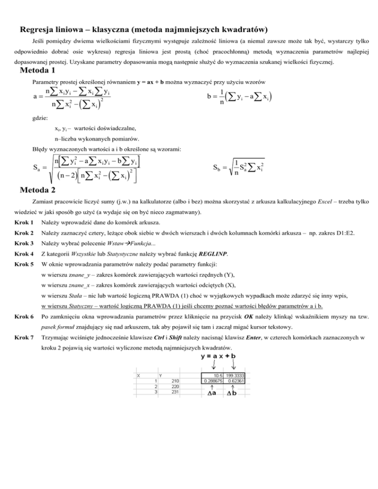 Regresja liniowa – klasyczna (metoda najmniejszych kwadratów) Jeśli pomię dzy dwiema wielkościami fizycznymi wystę puje zależ ność liniowa (a niemal zawsze moż e tak być , wystarczy tylko odpowiednio dobrać osie wykresu) regresja liniowa jest prostą (choć pracochłonną ) metodą wyznaczenia parametrów najlepiej dopasowanej prostej. Uzyskane parametry dopasowania mogą nastę pnie służ yć do wyznaczenia szukanej wielkości fizycznej. Metoda 1 Parametry prostej określonej równaniem y = ax + b moż na wyznaczyć przy uż yciu wzorów a= n∑ x i y i − ∑ x i ∑ y i n∑ x i2 − ( ∑ xi ) b= 2 1 n (∑ y − a ∑ x ) i i gdzie: xi, yi – wartości doświadczalne, n–liczba wykonanych pomiarów. Błę dy wyznaczonych wartości a i b określone są wzorami: Sa = [ n − a ∑ x i y i − b∑ y i 2 ∑ yi ( n − 2) n∑ x i2 − (∑ x ) i 2 ] Sb = 1 2 Sa ∑ x 2i n Metoda 2 Zamiast pracowicie liczyć sumy (j.w.) na kalkulatorze (albo i bez) moż na skorzystać z arkusza kalkulacyjnego Excel – trzeba tylko wiedzieć w jaki sposób go uż yć (a wydaje się on być nieco zagmatwany). Krok 1 Należ y wprowadzić dane do komórek arkusza. Krok 2 Należ y zaznaczyć cztery, leż ą ce obok siebie w dwóch wierszach i dwóch kolumnach komórki arkusza – np. zakres D1:E2. Krok 3 Należ y wybrać polecenie WstawFunkcja... Krok 4 Z kategorii Wszystkie lub Statystyczne należ y wybrać funkcję REGLINP. Krok 5 W oknie wprowadzania parametrów należ y podać parametry funkcji: w wierszu znane_y – zakres komórek zawierają cych wartości rzę dnych (Y), w wierszu znane_x – zakres komórek zawierają cych wartości odcię tych (X), w wierszu Stała – nic lub wartość logiczną PRAWDA (1) choć w wyją tkowych wypadkach moż e zdarzyć się inny wpis, w wierszu Statyczny – wartość logiczną PRAWDA (1) jeśli chcemy poznać wartości błę dów parametrów a i b. Krok 6 Po zamknię ciu okna wprowadzania parametrów przez kliknię cie na przycisk OK należ y klinką ć wskaź nikiem myszy na tzw. pasek formuł znajdują cy się nad arkuszem, tak aby pojawił się tam i zaczą ł migać kursor tekstowy. Krok 7 Trzymają c wciśnię te jednocześnie klawisze Ctrl i Shift należ y nacisną ć klawisz Enter, w czterech komórkach zaznaczonych w kroku 2 pojawią się wartości wyliczone metodą najmniejszych kwadratów.