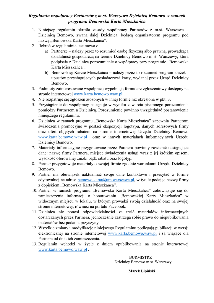 Regulamin współpracy Partnerów z m.st. Warszawa Dzielnicą Bemowo w ramach programu Bemowska Karta Mieszkańca 1. Niniejszy regulamin określa zasady współpracy Partnerów z m.st. Warszawa – Dzielnicą Bemowo, zwaną dalej Dzielnicą, będącą organizatorem programu pod nazwą „Bemowska Karta Mieszkańca”. 2. Ilekroć w regulaminie jest mowa o: a) Partnerze – należy przez to rozumieć osobę fizyczną albo prawną, prowadzącą działalność gospodarczą na terenie Dzielnicy Bemowo m.st. Warszawy, która podpisała z Dzielnicą porozumienie o współpracy przy programie „Bemowska Karta Mieszkańca”. b) Bemowskiej Karcie Mieszkańca – należy przez to rozumieć program zniżek i upustów przysługujących posiadaczowi karty, wydanej przez Urząd Dzielnicy Bemowo. 3. Podmioty zainteresowane współpracą wypełniają formularz zgłoszeniowy dostępny na stronie internetowej www.karta.bemowo.waw.pl . 4. Nie rozpatruje się zgłoszeń złożonych w innej formie niż określona w pkt. 3. 5. Przystąpienie do współpracy następuje w wyniku zawarcia pisemnego porozumienia pomiędzy Partnerem a Dzielnicą. Porozumienie powinno uwzględniać postanowienia niniejszego regulaminu. 6. Dzielnica w ramach programu „Bemowska Karta Mieszkańca” zapewnia Partnerom świadczenia promocyjne w postaci ekspozycji logotypu, danych adresowych firmy oraz ofert objętych rabatem na stronie internetowej Urzędu Dzielnicy Bemowo www.karta.bemowo.waw.pl oraz w innych materiałach informacyjnych Urzędu Dzielnicy Bemowo. 7. Materiały informacyjne przygotowane przez Partnera powinny zawierać następujące dane: nazwę firmy Partnera, miejsce świadczenia usługi wraz z jej krótkim opisem, wysokość oferowanej zniżki bądź rabatu oraz logotyp. 8. Partner przygotowuje materiały o swojej firmie zgodnie warunkami Urzędu Dzielnicy Bemowo. 9. Partner ma obowiązek uaktualniać swoje dane kontaktowe i przesyłać w formie edytowalnej na adres: [email protected], w tytule podając nazwę firmy z dopiskiem „Bemowska Karta Mieszkańca”. 10. Partner w ramach programu „Bemowska Karta Mieszkańca” zobowiązuje się do zamieszczenia informacji o honorowaniu „Bemowskiej Karty Mieszkańca” w widocznym miejscu w lokalu, w którym prowadzi swoją działalność oraz na swojej stronie internetowej, również na portalu Facebook. 11. Dzielnica nie ponosi odpowiedzialności za treść materiałów informacyjnych dostarczanych przez Partnera, jednocześnie zastrzega sobie prawo do niepublikowania materiałów bez podania przyczyny. 12. Wszelkie zmiany i modyfikacje niniejszego Regulaminu podlegają publikacji w wersji elektronicznej na stronie internetowej www.karta.bemowo.waw.pl i są wiążące dla Partnera od dnia ich zamieszczenia. 13. Regulamin wchodzi w życie z dniem opublikowania na stronie internetowej www.karta.bemowo.waw.pl . BURMISTRZ Dzielnicy Bemowo m.st. Warszawy Marek Lipiński