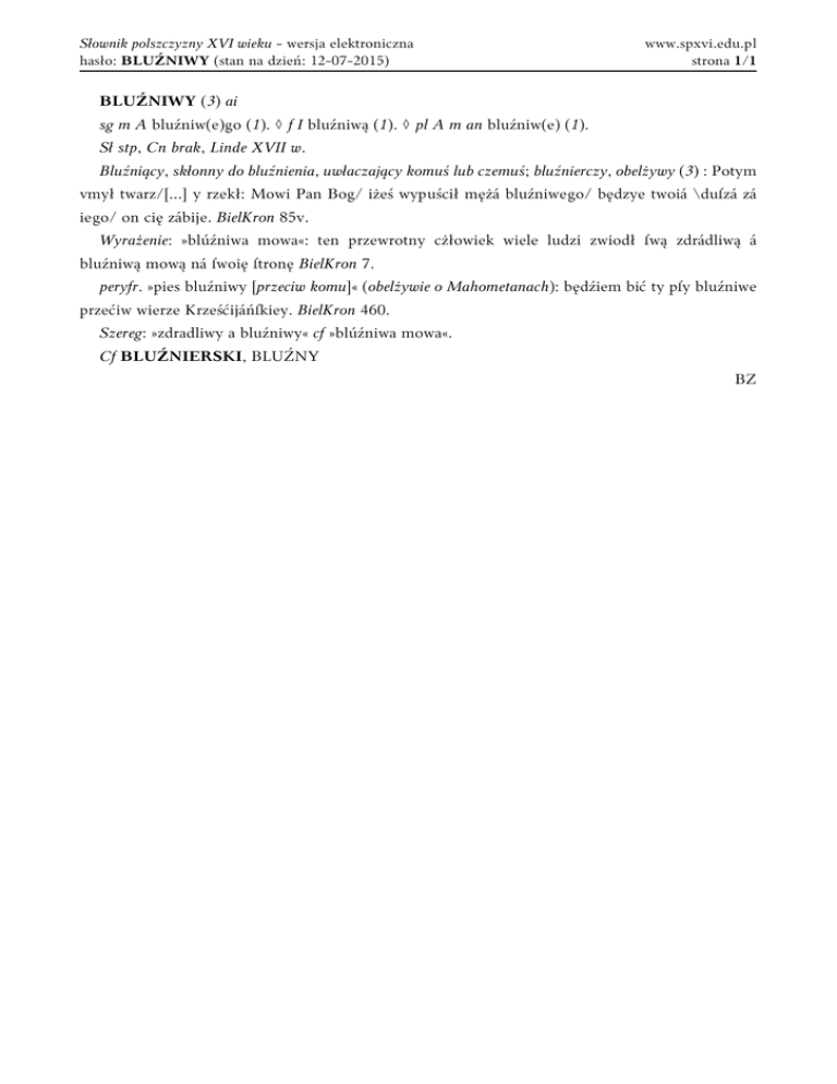 Słownik polszczyzny XVI wieku - wersja elektroniczna hasło: BLUŹNIWY (stan na dzień: 12-07-2015) www.spxvi.edu.pl strona 1/1 BLUŹNIWY (3) ai sg m A bluźniw(e)go (1). ◊ f I bluźniwą (1). ◊ pl A m an bluźniw(e) (1). Sł stp, Cn brak, Linde XVII w. Bluźniący, skłonny do bluźnienia, uwłaczający komuś lub czemuś; bluźnierczy, obelżywy (3) : Potym vmył twarz/[...] y rzekł: Mowi Pan Bog/ iżeś wypuścił mężá bluźniwego/ będzye twoiá \duſzá zá iego/ on cię zábije. BielKron 85v. Wyrażenie: »blúźniwa mowa«: ten przewrotny cżłowiek wiele ludzi zwiodł ſwą zdrádliwą á bluźniwą mową ná ſwoię ſtronę BielKron 7. peryfr. »pies bluźniwy [przeciw komu]« (obelżywie o Mahometanach): będźiem bić ty pſy bluźniwe przećiw wierze Krześćijáńſkiey. BielKron 460. Szereg: »zdradliwy a bluźniwy« cf »blúźniwa mowa«. Cf BLUŹNIERSKI, BLUŹNY BZ