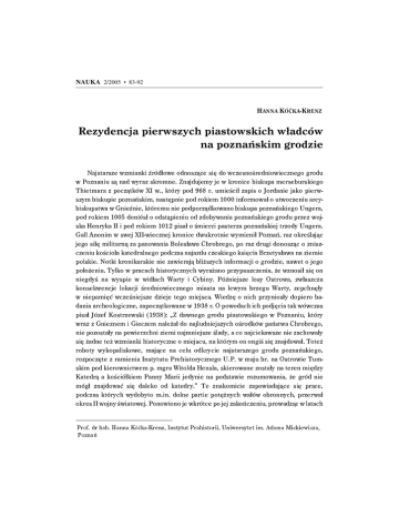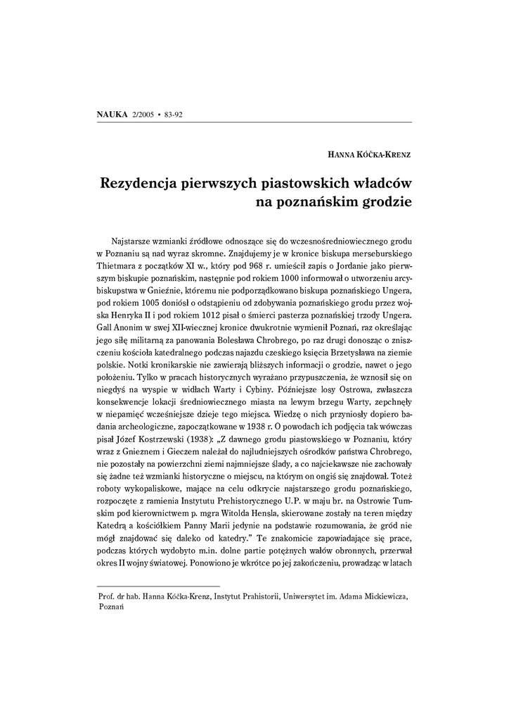 NAUKA 2/2005 • 83-92 ANNA KÓČKA-KRENZ H Rezydencja pierwszych piastowskich władców na poznańskim grodzie Najstarsze wzmianki źródłowe odnoszące się do wczesnośredniowiecznego grodu w Poznaniu są nad wyraz skromne. Znajdujemy je w kronice biskupa merseburskiego Thietmara z początków XI w., który pod 968 r. umieścił zapis o Jordanie jako pierwszym biskupie poznańskim, następnie pod rokiem 1000 informował o utworzeniu arcybiskupstwa w Gnieźnie, któremu nie podporządkowano biskupa poznańskiego Ungera, pod rokiem 1005 doniósł o odstąpieniu od zdobywania poznańskiego grodu przez wojska Henryka II i pod rokiem 1012 pisał o śmierci pasterza poznańskiej trzody Ungera. Gall Anonim w swej XII-wiecznej kronice dwukrotnie wymienił Poznań, raz określając jego siłę militarną za panowania Bolesława Chrobrego, po raz drugi donosząc o zniszczeniu kościoła katedralnego podczas najazdu czeskiego księcia Brzetysława na ziemie polskie. Notki kronikarskie nie zawierają bliższych informacji o grodzie, nawet o jego położeniu. Tylko w pracach historycznych wyrażano przypuszczenia, że wznosił się on niegdyś na wyspie w widłach Warty i Cybiny. Późniejsze losy Ostrowa, zwłaszcza konsekwencje lokacji średniowiecznego miasta na lewym brzegu Warty, zepchnęły w niepamięć wcześniejsze dzieje tego miejsca. Wiedzę o nich przyniosły dopiero badania archeologiczne, zapoczątkowane w 1938 r. O powodach ich podjęcia tak wówczas pisał Józef Kostrzewski (1938): „Z dawnego grodu piastowskiego w Poznaniu, który wraz z Gnieznem i Gieczem należał do najludniejszych ośrodków państwa Chrobrego, nie pozostały na powierzchni ziemi najmniejsze ślady, a co najciekawsze nie zachowały się żadne też wzmianki historyczne o miejscu, na którym on ongiś się znajdował. Toteż roboty wykopaliskowe, mające na celu odkrycie najstarszego grodu poznańskiego, rozpoczęte z ramienia Instytutu Prehistorycznego U.P. w maju br. na Ostrowie Tumskim pod kierownictwem p. mgra Witolda Hensla, skierowane zostały na teren między Katedrą a kościółkiem Panny Marii jedynie na podstawie rozumowania, że gród nie mógł znajdować się daleko od katedry.” Te znakomicie zapowiadające się prace, podczas których wydobyto m.in. dolne partie potężnych wałów obronnych, przerwał okres II wojny światowej. Ponowiono je wkrótce po jej zakończeniu, prowadząc w latach Prof. dr hab. Hanna Kóčka-Krenz, Instytut Prahistorii, Uniwersytet im. Adama Mickiewicza, Poznań 84 Hanna Kóčka-Krenz 1946-1961 intensywne badania wykopaliskowe w różnych częściach Ostrowa Tumskiego, w tym zwłaszcza pod kościołem katedralnym, ujawniając jego najstarszą architekturę. W następnych latach ograniczano się do prac ratowniczych, które mimo swego skromnego zakresu uzupełniały wiedzę o poznańskim grodzie. Nowe światło na pozycję Poznania w państwie pierwszych Piastów rzuciły prace wykopaliskowe, rozpoczęte w 1999 r. przez Instytut Prahistorii UAM. Ich zasadniczym celem były poszukiwania rezydencji wczesnopiastowskiej, która powinna znajdować się w ośrodku tej rangi, jednym z czołowych grodów ówczesnego państwa. Na miejsce jej przypuszczalnego położenia wskazywało kilka przesłanek. Pierwsza z nich wynikała z wiedzy na temat kształtu grodu, rozbudowanego w 2 połowie X w. w silnie ufortyfikowaną warownię, zdolną opierać się nawet poważnym zagrożeniom militarnym. Składały się na nią dwie zasadnicze części – północna i południowa, oddzielone zabagnionym rowem. W części północnej zostały wydzielone dwa człony – obwiedziony owalnym wałem tzw. gródek książęcy o wymiarach około 80 × 100 m i przylegający doń od wschodu człon tzw. katedralny otoczony wałem podkowiastym, którego wymiary szacuje się na 130 x 100 m. Trzeci człon stanowiła osada obronna w części południowej wyspy – na Zagórzu, zamieszkana przez ludność usługową (Kara 1998). Drugą wskazówką było wezwanie gotyckiego obecnie kościoła, położonego w obrębie dawnego książęcego gródka. W XIII-wiecznej kronice polsko-śląskiej zawarta jest informacja, że fundatorką kaplicy pod wezwaniem Najświętszej Panny Marii na Ostrowie w Poznaniu była Dobrawa, chrześcijańska małżonka Mieszka I (Nowacki 1959, s. 7). Kaplice grodowe stanowiły w architekturze przedromańskiej na ziemiach polskich nieodłączny element rezydencji władcy. Można więc było sądzić, co wielokrotnie wyrażano w literaturze przedmiotu, że gotycka świątynia stanowi kolejną fazę architektoniczną swej poprzedniczki. Jeszcze jedną przesłankę przyniosły prace wykopaliskowe, przeprowadzone w 1946 r. pod kierownictwem Witolda Hensla w niewielkim oddaleniu od północnej ściany kościoła NMP. Podczas tych badań został odsłonięty relikt fundamentu, co do którego wysunięto przypuszczenie, iż został posadowiony na starszym fundamencie, stanowiącym ogrodzenie dziedzińca pałacowego. Późna pora roku i złe warunki pogodowe sprawiły, że prace przerwano przed zbadaniem jego dolnej partii, co uniemożliwiło weryfikację tej hipotezy. Dopiero najnowsze badania wykazały, że odkryty wówczas element stanowił pozostałość budynku średniowiecznego, którego fundament został przystawiony i częściowo nałożony na relikt północnej ściany palatium. Wszystkie te przesłanki złożyły się na zawężenie terenu badań do bezpośredniego otoczenia kościoła NMP, które przyniosły oczekiwane rezultaty – odsłonięcie przedromańskiej siedziby władcy (Kóčka-Krenz 2004). Podczas sześciu sezonów wykopaliskowych całkowicie rozpoznano pozostałości fundamentów południowej ściany budynku, znaczne części ściany zachodniej, dwa odcinki fundamentów ściany północnej i ściany wschodniej, wraz z wysuniętą partią murów Rezydencja pierwszych piastowskich władców na poznańskim grodzie 85 przy jej południowym narożniku. Stan ich przetrwania w