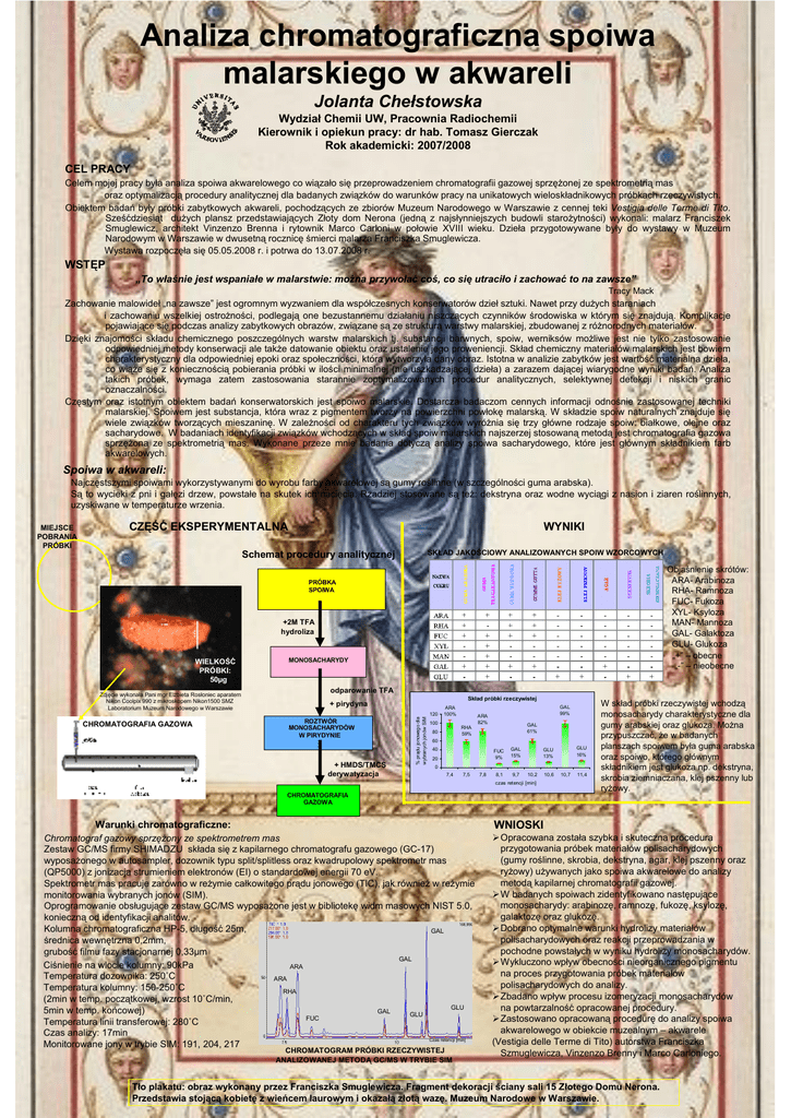 Analiza chromatograficzna spoiwa malarskiego w akwareli Jolanta Chełstowska Wydział Chemii UW, Pracownia Radiochemii Kierownik i opiekun pracy: dr hab. Tomasz Gierczak Rok akademicki: 2007/2008 CEL PRACY Celem mojej pracy była analiza spoiwa akwarelowego co wiązało się przeprowadzeniem chromatografii gazowej sprzęŜonej ze spektrometrią mas oraz optymalizacją procedury analitycznej dla badanych związków do warunków pracy na unikatowych wieloskładnikowych próbkach rzeczywistych. Obiektem badań były próbki zabytkowych akwareli, pochodzących ze zbiorów Muzeum Narodowego w Warszawie z cennej teki Vestigia delle Terme di Tito. Sześćdziesiąt duŜych plansz przedstawiających Złoty dom Nerona (jedną z najsłynniejszych budowli staroŜytności) wykonali: malarz Franciszek Smuglewicz, architekt Vinzenzo Brenna i rytownik Marco Carloni w połowie XVIII wieku. Dzieła przygotowywane były do wystawy w Muzeum Narodowym w Warszawie w dwusetną rocznicę śmierci malarza Franciszka Smuglewicza. Wystawa rozpoczęła się 05.05.2008 r. i potrwa do 13.07.2008 r. WSTĘP „To właśnie jest wspaniałe w malarstwie: moŜna przywołać coś, co się utraciło i zachować to na zawsze” Tracy Mack Zachowanie malowideł „na zawsze” jest ogromnym wyzwaniem dla współczesnych konserwatorów dzieł sztuki. Nawet przy duŜych staraniach i zachowaniu wszelkiej ostroŜności, podlegają one bezustannemu działaniu niszczących czynników środowiska w którym się znajdują. Komplikacje pojawiające się podczas analizy zabytkowych obrazów, związane są ze strukturą warstwy malarskiej, zbudowanej z róŜnorodnych materiałów. Dzięki znajomości składu chemicznego poszczególnych warstw malarskich tj. substancji barwnych, spoiw, werniksów moŜliwe jest nie tylko zastosowanie odpowiedniej metody konserwacji ale takŜe datowanie obiektu oraz ustalenie jego proweniencji. Skład chemiczny materiałów malarskich jest bowiem charakterystyczny dla odpowiedniej epoki oraz społeczności, która wytworzyła dany obraz. Istotna w analizie zabytków jest wartość materialna dzieła, co wiąŜe się z koniecznością pobierania próbki w ilości minimalnej (nie uszkadzającej dzieła) a zarazem dającej wiarygodne wyniki badań. Analiza takich próbek, wymaga zatem zastosowania starannie zoptymalizowanych procedur analitycznych, selektywnej detekcji i niskich granic oznaczalności. Częstym oraz istotnym obiektem badań konserwatorskich jest spoiwo malarskie. Dostarcza badaczom cennych informacji odnośnie zastosowanej techniki malarskiej. Spoiwem jest substancja, która wraz z pigmentem tworzy na powierzchni powłokę malarską. W składzie spoiw naturalnych znajduje się wiele związków tworzących mieszaninę. W zaleŜności od charakteru tych związków wyróŜnia się trzy główne rodzaje spoiw: białkowe, olejne oraz sacharydowe. W badaniach identyfikacji związków wchodzących w skład spoiw malarskich najszerzej stosowaną metodą jest chromatografia gazowa sprzęŜona ze spektrometrią mas. Wykonane przeze mnie badania dotyczą analizy spoiwa sacharydowego, które jest głównym składnikiem farb akwarelowych. Spoiwa w akwareli: Najczęstszymi spoiwami wykorzystywanymi do wyrobu farby akwarelowej są gumy roślinne (w szczególności guma arabska). Są to wycieki z pni i gałęzi drzew, powstałe na skutek ich nacięcia. Rzadziej stosowane są teŜ: dekstryna oraz wodne wyciągi z nasion i ziaren roślinnych, uzyskiwane w temperaturze wrzenia. MIEJSCE POBRANIA PRÓBKI CZĘŚĆ EKSPERYMENTALNA WYNIKI SKŁAD JAKOŚCIOWY ANALIZOWANYCH SPOIW WZORCOWYCH Schemat procedury analitycznej Objaśnienie skrótów: ARA- Arabinoza RHA- Ramnoza FUC- Fukoza XYL- Ksyloza MAN- Mannoza GAL- Galaktoza GLU- Glukoza „+” – obecne „-” – nieobecne PRÓBKA SPOIWA +2M TFA hydroliza Zdjęcie wykonała Pani mgr ElŜbieta Rosłoniec aparatem Nikon Coolpix 990 z mikroskopem Nikon1500 SMZ Laboratorium Muzeum Narodowego w Warszawie CHROMATOGRAFIA GAZOWA MONOSACHARYDY odparowanie TFA Skład próbki rzeczywistej + pirydyna ROZTWÓR MONOSACHARYDÓW W PIRYDYNIE + HMDS/TMCS derywatyzacja % prądu jonowego dla wybranych jonów SIM WIELKOŚĆ PRÓBKI: 50µg 120 ARA 100% GAL 99% ARA 82% 100 GAL 61% RHA 59% 80 60 40 20 FUC 9% GAL 15% 8,1 9,7 GLU 16% GLU 13% 0 7,4 7,5 7,8 10,2 czas retencji [min] CHROMATOGRAFIA GAZOWA 10,6 10,7 11,4 W skład próbki rzeczywistej wchodzą monosacharydy charakterystyczne dla gumy arabskiej oraz glukoza. MoŜna przypuszczać, Ŝe w badanych planszach spoiwem była guma arabska oraz spoiwo, którego głównym składnikiem jest glukoza np. dekstryna, skrobia ziemniaczana, klej pszenny lub ryŜowy. WNIOSKI Warunki chromatograficzne: Chromatograf gazowy sprzęŜony ze spektrometrem mas Zestaw GC/MS firmy SHIMADZU składa się z kapilarnego chromatografu gazowego (GC-17) wyposaŜonego w autosampler, dozownik typu split/splitless oraz kwadrupolowy spektrometr mas (QP5000) z jonizacja strumieniem elektronów (EI) o standardowej energii 70 eV. Spektrometr mas pracuje zarówno w reŜymie całkowitego prądu jonowego (TIC), jak równieŜ w reŜymie monitorowania wybranych jonów (SIM). Oprogramowanie obsługujące zestaw GC/MS wyposaŜone jest w bibliotekę widm masowych NIST 5.0, konieczną od identyfikacji analitów. Kolumna chromatograficzna HP-5, długość 25m, GAL średnica wewnętrzna 0,2mm, grubość filmu fazy stacjonarnej 0,33µm GAL Ciśnienie na wlocie kolumny: 90kPa ARA Temperatura dozownika: 250˚C ARA Temperatura kolumny: 150-250˚C RHA (2min w temp. początkowej, wzrost 10˚C/min, GLU GAL 5min w temp. końcowej) GLU FUC Temperatura linii transferowej: 280˚C Czas analizy: 17min Czas retencji [min] Monitorowane jony w trybie SIM: 191, 204, 217 CHROMATOGRAM PRÓBKI RZECZYWISTEJ ANALIZOWANEJ METODĄ GC/MS W TRYBIE SIM Opracowana została szybka i skuteczna procedura przygotowania próbek materiałów polisacharydowych (gumy roślinne, skrobia, dekstryna, agar, klej pszenny o