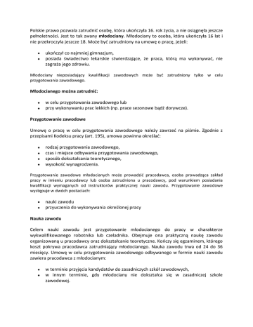 Polskie prawo pozwala zatrudnić osobę, która ukończyła 16. rok życia, a nie osiągnęła jeszcze pełnoletności. Jest to tak zwany młodociany. Młodociany to osoba, która ukończyła 16 lat i nie przekroczyła jeszcze 18. Może być zatrudniony na umowę o pracę, jeżeli: ukończył co najmniej gimnazjum, posiada świadectwo lekarskie stwierdzające, że praca, którą ma wykonywać, nie zagraża jego zdrowiu. Młodociany nieposiadający kwalifikacji zawodowych może być zatrudniony tylko w celu przygotowania zawodowego. Młodocianego można zatrudnić: w celu przygotowania zawodowego lub przy wykonywaniu prac lekkich (np. prace sezonowe bądź dorywcze). Przygotowanie zawodowe Umowę o pracę w celu przygotowania zawodowego należy zawrzeć na piśmie. Zgodnie z przepisami Kodeksu pracy (art. 195), umowa powinna określać: rodzaj przygotowania zawodowego, czas i miejsce odbywania przygotowania zawodowego, sposób dokształcania teoretycznego, wysokość wynagrodzenia. Przygotowanie zawodowe młodocianych może prowadzić pracodawca, osoba prowadząca zakład pracy w imieniu pracodawcy lub osoba zatrudniona u pracodawcy, pod warunkiem posiadania kwalifikacji wymaganych od instruktorów praktycznej nauki zawodu. Przygotowanie zawodowe występuje w dwóch postaciach: nauki zawodu przyuczenia do wykonywania określonej pracy Nauka zawodu Celem nauki zawodu jest przygotowanie młodocianego do pracy w charakterze wykwalifikowanego robotnika lub czeladnika. Obejmuje ona praktyczną naukę zawodu organizowaną u pracodawcy oraz dokształcanie teoretyczne. Kończy się egzaminem, którego koszt pokrywa pracodawca zatrudniający młodocianego. Nauka zawodu trwa od 24 do 36 miesięcy. Umowę w celu przygotowania zawodowego odbywanego w formie nauki zawodu zawiera pracodawca z młodocianym: w terminie przyjęcia kandydatów do zasadniczych szkół zawodowych, w innym terminie, gdy młodociany nie dokształca się w zasadniczej szkole zawodowej. Przyuczenie do wykonywania określonej pracy Przyuczenie trwa od 3 do 6 miesięcy. Jego celem jest przygotowanie młodocianego do pracy w charakterze przyuczonego robotnika. Dla uczestników Ochotniczych Hufców Pracy okres przyuczenia może być przedłużony do momentu ukończenia gimnazjum, maksymalnie do 22 miesięcy. Czas trwania, zakres oraz program przyuczania do wykonania określonej pracy ustala pracodawca, uwzględniając wybrany program nauczania dopuszczony do użytku szkolnego. Przyuczenie, podobnie jak nauka zawodu, kończy się egzaminem. Jeśli młodociany go nie zda‚ to okres przyuczenia można wydłużyć o dodatkowe 3 miesiące. Przy pracach lekkich Młodociani mogą być również zatrudniani w innym celu niż przygotowanie zawodowe. Istnieje jednak zastrzeżenie – mogą wykonywać jedynie prace lekkie. W myśl przepisów, praca lekka nie może stanowić zagrożenia dla życia i zdrowia młodocianego. Nie może go nadmiernie obciążać fizycznie lub psychicznie. Nie powinna też być barierą w wypełnianiu obowiązku szkolnego. Pracodawca sporządza wykaz lekkich prac. Wykaz ten musi uzyskać zgodę lekarza medycyny pracy i zostać zatwierdzony przez właściwego inspektora pracy. W wykazie nie mogą się znaleźć prace wzbronione młodocianym – ich listę można znaleźć w Rozporządzeniu Rady Ministrów z 24 sierpnia 2004 r. Przywileje młodocianego w pracy Młodociany ma status pracownika. Przysługuje mu urlop wypoczynkowy oraz normalne wynagrodzenie. Dodatkowo, w przypadku osoby zatrudnionej w celu przygotowania zawodowego jej czas nauki wlicza się do czasu pracy. Całkowicie bez znaczenia jest to, czy nauka odbywa się w godzinach pracy czy też nie. Czas pracy małoletniego zależy od jego wieku. Gdy zatrudniasz pracownika w wieku: do 16 lat – nie wolno mu pracować dłużej niż 6 godzin na dobę, powyżej 16 lat – może pracować do 8 godzin na dobę. Młodocianego nie wolno zatrudniać: w godzinach nadliczbowych (nawet gdyby wyraził na to zgodę), w porze nocnej, czyli od 22.00 do 6.00 (a dla osoby, która nie ukończyła 16 lat – od 20.00 do 6.00). W każdym tygodniu młodocianemu przysługuje prawo do co najmniej 48 godzin nieprzerwanego odpoczynku. Odpoczynek ten powinien obejmować niedzielę. Jak wynagradzać Wysokość wynagrodzenia młodocianego pracownika zależy od stażu nauki i poziomu przeciętnego miesięcznego wynagrodzenia w gospodarce narodowej w poprzednim kwartale, obowiązującego od pierwszego dnia następnego miesiąca po ogłoszeniu przez Prezesa GUS. I tak, młodocianemu przysługuje: w pierwszym roku nauki – nie mniej niż 4 proc. średniej płacy, w drugim roku nauki – nie mniej niż 5 proc. średniej płacy, w trzecim roku nauki – nie mniej niż 6 proc. średniej płacy. Jeżeli młodociany odbywa przyuczenie do wykonywania określonej pracy, to należy mu się przynajmniej 4 proc. przeciętnego wynagrodzenia. Nieobecność w szkole nie uprawnia pracodawcy do obniżenia z tego tytułu wynagrodzenia młodocianego pracownika. Trudniej rozwiązać umowę Jeśli pracodawca zawarł z młodocianym umowę o pracę w celu przygotowania zawodowego, to może ją wypowiedzieć tylko wtedy, gdy: młodociany nie wypełnia swoich obowiązków związanych z pracą i dokształcaniem się, ogłoszono upadłość lub likwidację pracodawcy, odbywa się reorganizacja zakładu pracy, która uniemożliwia kontynuowanie przygotowania zawodowego, stwierdza się nieprzydatność młodocianego do pracy, w zakresie której odbywa się przygotowanie zawodowe. Młodociany na urlopie Po przepracowaniu 6 miesięcy młodociany nabywa prawo do 12 dni urlopu, a po roku – do 26 dni. Jeśli pracownik uczęszcza do szkoły, to urlopu należy mu udzielić w okresie ferii szkolnych. W razie gdy do rozpoczęcia ferii młodociany przepracował mniej niż 6 miesięcy i nie nabył jeszcze prawa do urlopu pracodawca może, na wniosek zainteresowanego, udzielić w tym czasie urlopu zaliczkowo. Młodocianemu p