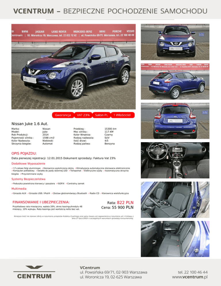 Nissan Juke 1.6 Aut. Marka: Model: Rok Produkcji: Pojemność silnika : Kolor Nadwozia: Skrzynia biegów: Nissan Juke 2014 1598 cm3 Niebieski Automat Przebieg : Moc silnika : Kolor Wnętrza: Rodzaj nadwozia: Ilość drzwi: Rodzaj paliwa: 15300 km 117 KM Czarny SUV 4/5 Benzyna OPIS POJAZDU: Data pierwszej rejestracji: 12.01.2015 Dokument sprzedaży: Faktura Vat 23% Dodatkowe Wyposażenie ✓17-calowe felgi aluminiowe ✓Kierownica wykończona skórą ✓Klimatyzacja automatyczna sterowana elektronicznie ✓Komputer pokładowy ✓Światła do jazdy dziennej LED ✓Tempomat ✓Elektryczne szyby ✓Automatyczna skrzynia biegów ✓Przyciemniane szyby Systemy Bezpieczeństwa ✓Poduszka powietrzna kierowcy i pasażera ✓ISOFIX ✓Centralny zamek Multimedia ✓Gniazdo AUX ✓Gniazdo USB / iPod® ✓Zestaw głośnomówiący Bluetooth ✓Radio CD ✓Kierownica wielofunkcyjna FINANSOWANIE I UBEZPIECZENIA: Przykładowa rata miesięczna, wpłata 20%, okres leasingu/kredytu 48 miesięcy, 10% wykupu. Rata leasingu jest wartością netto bez vat. Rata: 822 Cena: 55 900 PLN PLN Niniejsza treść nie stanowi oferty w rozumieniu przepisów Kodeksu Cywilnego oraz opisu towaru ani zapewnienia w rozumieniu art. 4 Ustawy z dnia 27 lipca 2002r o szczególnych warunkach sprzedaży konsumenckiej. Powered by TCPDF (www.tcpdf.org)