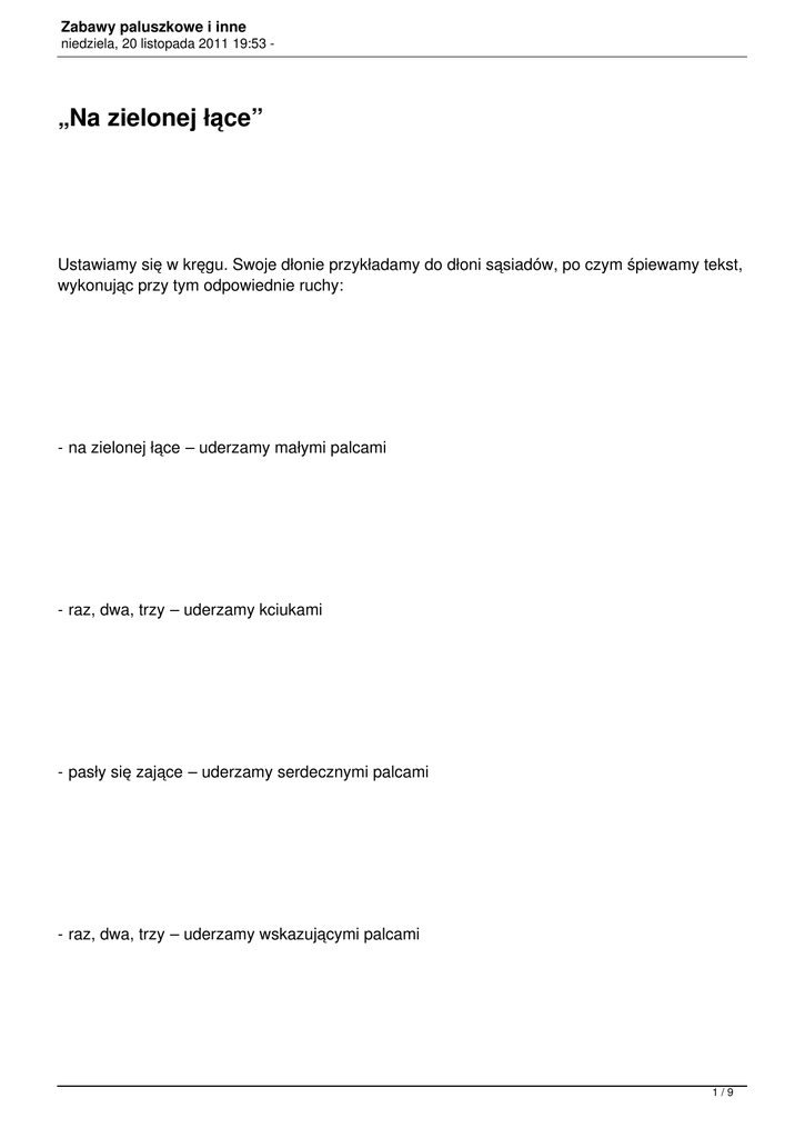 Zabawy paluszkowe i inne niedziela, 20 listopada 2011 19:53 - „Na zielonej łące” Ustawiamy się w kręgu. Swoje dłonie przykładamy do dłoni sąsiadów, po czym śpiewamy tekst, wykonując przy tym odpowiednie ruchy: - na zielonej łące – uderzamy małymi palcami - raz, dwa, trzy – uderzamy kciukami - pasły się zające – uderzamy serdecznymi palcami - raz, dwa, trzy – uderzamy wskazującymi palcami 1/9 Zabawy paluszkowe i inne niedziela, 20 listopada 2011 19:53 - - dzień dobry, dzień dobry – kiwamy środkowymi palcami Stuk-puk, stuk-puk, czy jest pan kciuk?(ręce zwinięte w trąbki, stukamy się kciukami) Ciiiii, pan kciuk śpi.(palec wskazujący kładziemy na ustach, mówimy bardzo cicho). 2x wszystko Stuk-puk, stuk-puk, czy jest pan kciuk? Pan kciuk spał, ale wstał. (ten wers wypowiadamy głośno) Mam 10 palców małych, do zabawy doskonałych. Mogę wszystko zrobić nimi - paluszkami malutkimi! 2/9 Zabawy paluszkowe i inne niedziela, 20 listopada 2011 19:53 - Mogę zamknąć je w piąsteczki lub rozłożyć jak chusteczki, mogę w słonko je zamienić, albo schować do kieszeni. Mogę podnieść je wysoko lub rozłożyć tak szeroko, mogą w koszyk się zaplatać albo jak motylek latać. Moge je ustawić w rządku lub rozpocząć od początku, mogę je ustawić w rządku, choć nie śpiewam od początku Mam dwie ręce, łokcie dwa, dwa kolanka, nogi dwie - wszystko pięknie zgadza się. Dwoje uszu, oczka dwa, no i buzię też się ma. A ponieważ buzia je, chciałbym buzie też mieć dwie 3/9 Zabawy paluszkowe i inne niedziela, 20 listopada 2011 19:53 - Jest w lesie chateńka (ręce tworzą domek), przed chatą sarenka (wskazujący i mały wyprostowane, pozostałe zgięte) i zając tam szary (wyprostowany wskazujący i środkowy)i drugi do pary. Sosna jak wielkolud (wszystkie palce wyprostowane), maleńki krasnolud (prosty tylko kciuk) pod grzybkiem się schował (chowamy kciuk pod pozostałymi palcami zgiętymi), zwierzątka rachował. 4/9 Zabawy paluszkowe i inne niedziela, 20 listopada 2011 19:53 - „Ha – ha” Uczestnicy kładą się na plecach w ten sposób, że głowę kładziemy na brzuchu osoby poprzedniej. Pierwsza osoba mówi: „ha” , druga „ha ha”, trzecia: „ha ha ha” itd. „Dumanie” Wszyscy uczestnicy stają w kręgu, jedna osoba za drugą. Śpiewamy, wykonując jednocześnie ruchy: - noga naprzód, noga w tył, dum, dum, dum – stawiamy prawą nogę w przód, a potem w tył - ruszaj ciałem w przód i w tył, dum, dum, dum – ruszamy ciałem w przód i w tył 5/9 Zabawy paluszkowe i inne niedziela, 20 listopada 2011 19:53 - - za oknami słońce świeci, dum, dum, dum – kołyszemy rękami w górze - kołyszemy się jak dzieci, dum, dum ,dum – kołyszemy całym ciałem. Na słowa „dum dum dum” – podskakujemy. Zabawę powtarzamy wielokrotnie, za każdym razem zacieśniając szeregi. „Shark” 6/9 Zabawy paluszkowe i inne niedziela, 20 listopada 2011 19:53 - Wszyscy śpiewają i powtarzają ruchy za prowadzącym: - Baby shark, baby shark – pokazujemy dłonią płynącego rekina - Sister shark, sister shark – udajemy rekiny obiema dłońmi - Mather shark, mather shark – udajemy rekina całym przedramieniem - Father shark, father shark – udajemy rekina całymi rękami - Grandfather shark – udajemy rekina poprzez złapanie się prawą dłonią za lewy łokieć, a lewą za prawy 7/9 Zabawy paluszkowe i inne niedziela, 20 listopada 2011 19:53 - - Shark atack! – atakujemy osobę stojącą obok nas „Słoń ma trąbę” Śpiewamy i pokazujemy: - Słoń ma trąbę – prawa noga do przodu - A my nie - prawa noga do tyłu - I tym od słonia – lewa noga w lewo 8/9 Zabawy paluszkowe i inne niedziela, 20 listopada 2011 19:53 - - różnimy się – lewa noga w prawo 9/9