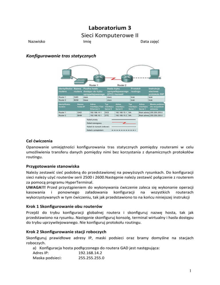 Laboratorium 3 Sieci Komputerowe II Nazwisko Imię Data zajęd Konfigurowanie tras statycznych Cel dwiczenia Opanowanie umiejętności konfigurowania tras statycznych pomiędzy routerami w celu umożliwienia transferu danych pomiędzy nimi bez korzystania z dynamicznych protokołów routingu. Przygotowanie stanowiska Należy zestawid sied podobną do przedstawionej na powyższych rysunkach. Do konfiguracji sieci należy użyd routerów serii 2500 i 2600.Następnie należy zestawid połączenie z routerem za pomocą programu HyperTerminal. UWAGA!!! Przed przystąpieniem do wykonywania dwiczenie zaleca się wykonanie operacji kasowania i ponownego załadowania konfiguracji na wszystkich routerach wykorzystywanych w tym dwiczeniu, tak jak przedstawiono to na koocu niniejszej instrukcji Krok 1 Skonfigurowanie obu routerów Przejdź do trybu konfiguracji globalnej routera i skonfiguruj nazwę hosta, tak jak przedstawiono na rysunku. Następnie skonfiguruj konsolę, terminal wirtualny i hasła dostępu do trybu uprzywilejowanego. Nie konfiguruj protokołu routingu. Krok 2 Skonfigurowanie stacji roboczych Skonfiguruj prawidłowe adresy IP, maski podsieci oraz bramy domyślne na stacjach roboczych. a) Konfiguracja hosta podłączonego do routera GAD jest następująca: Adres IP: 192.168.14.2 Maska podsieci: 255.255.255.0 1 Brama domyślna: 192.168.14.1 b) Konfiguracja hosta podłączonego do routera BHM jest następująca: Adres IP: 192.168.16.2 Maska podsieci: 255.255.255.0 Brama domyślna: 192.168.16.1 c) Sprawdź łącznośd pomiędzy stacjami roboczymi za pomocą polecenia ping. Na stacji roboczej podłączonej do routera GAD wykonaj polecenie ping adresowane do stacji roboczej podłączonej do routera BHM. C:\>ping 192.168.16.2 Badanie 192.168.16.2 z użyciem 32 bajtów danych: Upłynął limit czasu żądania Upłynął limit czasu żądania Upłynął limit czasu żądania Upłynął limit czasu żądania Statystyka badania ping dla 192.168.16.2: Pakiety: Wysłane = 4, Odebrane = 0, Utracone = 4 (100% straty), d) Czy polecenie ping zostało wykonane pomyślnie? ___________________________________________________ e) Dlaczego wykonanie polecenia ping nie powiodło się? ___________________________________________________ Krok 3 Sprawdzenie stanu interfejsu a) Sprawdź interfejsy na obu routerach za pomoc polecenia show ip interface brief. b) Czy wszystkie niezbędne interfejsy są włączone? ___________________________________________________ Krok 4 Sprawdzenie pozycji tablicy routingu a) Wyświetl tablicę routingu IP routera GAD, używając polecenia show ip route. b) Wyświetl tablicę routingu IP routera BHM, używając polecenia show ip route. 2 c) Czy wszystkie trasy w tablicy routingu są potrzebne? ___________________________________________________ d) Czy host w sieci 192.168.16.0 może połączyd się z hostem w sieci 192.168.14.0 (weź pod uwagę wynik polecenia show ip route wywołanego na routerach GAD i BHM)? ___________________________________________________ Krok 5 Dodanie tras statycznych a) Co należy zmienid, aby hosty mogły wysyład do siebie pakiety ping? ___________________________________________________ b) W trybie konfiguracji globalnej na routerze GAD dodaj trasę statyczną do sieci 192.168.16.0, a na routerze BHM do sieci 192.168.14.0. GAD(config)#ip route 192.168.16.0 255.255.255.0 192.168.15.2 BHM(config)#ip route 192.168.14.0 255.255.255.0 192.168.15.1 c) Dlaczego na obu routerach konieczne są trasy statyczne? ___________________________________________________ Krok 6 Sprawdzenie nowych tras a) Wyświetl tablicę routingu IP routera GAD, używając polecenia show ip route. b) Wyświetl tablicę routingu IP routera BHM, używając polecenia show ip route. 3 c) Czy wszystkie trasy w tablicy routingu są potrzebne? ___________________________________________________ d) Czy host z sieci 192.168.16.0 ma dostęp do hosta z sieci 192.168.14.0? ___________________________________________________ Krok 7 Ponowne wykonanie polecenia ping pomiędzy hostami a) Sprawdź łącznośd pomiędzy stacjami roboczymi za pomocą polecenia ping. Na stacji roboczej podłączonej do routera GAD wykonaj polecenie ping adresowane do stacji roboczej podłączonej do routera BHM. b) Jeśli polecenie ping nie zostanie wykonane pomyślnie, sprawdź tablicę routingu, aby upewnid się, że poprawnie wprowadzono trasy statyczne. c) Po zakooczeniu opisanych czynności wyloguj się, wpisując polecenie exit. Wyłącz router. Konfigurowanie protokołu RIP Cel dwiczenia Opanowanie umiejętności konfigurowania adresacji IP przy wykorzystaniu sieci klasy B oraz umiejętności konfigurowania dynamicznego protokołu RIP na routerach. Przygotowanie stanowiska Należy zestawid sied podobną do przedstawionej na powyższym rysunku. Do konfiguracji sieci należy użyd routerów serii 2500 i 2600.Następnie należy zestawid połączenie z routerem za pomocą programu HyperTerminal. UWAGA!!! Przed przystąpieniem do wykonywania dwiczenie zaleca się wykonanie operacji kasowania i ponownego załadowania konfiguracji na wszystkich routerach wykorzystywanych w tym dwiczeniu, tak jak przedstawiono to na koocu niniejszej instrukcji 4 Krok 1 Konfiguracja routerów Przejdź do trybu konfiguracji globalnej routera i skonfiguruj nazwę hosta, tak jak przedstawiono na rysunku. Następnie skonfiguruj konsolę, terminal wirtualny i hasła dostępu do trybu uprzywilejowanego. Krok 2 Wyświetlenie zawartości tablicy routingu a) Wyświetl tablicę routingu IP routera GAD, używając polecenia show ip route. b) Wyświetl tablicę routingu IP routera BHM, używając polecenia show ip route. Krok 3 Konfiguracja protokołu routingu na routerze GAD W trybie konfiguracji globalnej wpisz następujące polecenia: GAD(config)#router rip GAD(config-router)#network 172.16.0.0 GAD(config-router)#network 172.17.0.0 GAD(config-router)#exit GAD(config)#exit Krok 4 Zapisanie konfiguracji routera GAD GAD#copy running-config startup-