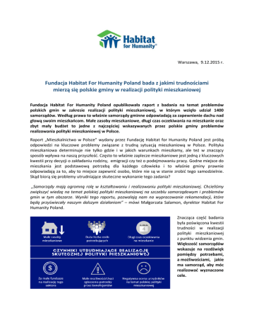 Warszawa, 9.12.2015 r. Fundacja Habitat For Humanity Poland bada z jakimi trudnościami mierzą się polskie gminy w realizacji polityki mieszkaniowej Fundacja Habitat For Humanity Poland opublikowała raport z badania na temat problemów polskich gmin w zakresie realizacji polityki mieszkaniowej, w którym wzięło udział 1400 samorządów. Według prawa to właśnie samorządy gminne odpowiadają za zapewnienie dachu nad głową swoim mieszkańcom. Małe zasoby mieszkaniowe, długi czas oczekiwania na mieszkanie oraz zbyt mały budżet to jedne z najczęściej wskazywanych przez polskie gminy problemów realizowania polityki mieszkaniowej w Polsce. Raport „Mieszkalnictwo w Polsce” wydany przez Fundację Habitat for Humanity Poland jest próbą odpowiedzi na kluczowe problemy związane z trudną sytuacją mieszkaniową w Polsce. Polityka mieszkaniowa determinuje nie tylko gdzie i w jakich warunkach mieszkamy, ale też w znaczący sposób wpływa na naszą przyszłość. Często to właśnie zaplecze mieszkaniowe jest jedną z kluczowych kwestii przy decyzji o zakładaniu rodziny, emigracji czy też o podejmowaniu pracy. Godne miejsce do mieszkania jest podstawową potrzebą dla każdego człowieka i to właśnie gminy prawnie odpowiadają za to, aby to miejsce zapewnić osobo, które nie są w stanie zrobić tego samodzielnie. Skąd biorą się problemy utrudniające skuteczne wykonanie tego zadania? „Samorządy mają ogromną rolę w kształtowaniu i realizowaniu polityki mieszkaniowej. Chcieliśmy zwiększyć wiedzę na temat polskiej polityki mieszkaniowej na szczeblu samorządowym i problemów gmin w tym obszarze. Wyniki tego raportu, pozwalają nam na wypracowanie rekomendacji, które będą przyświecały naszym dalszym działaniom” – mówi Małgorzata Salamon, dyrektor Habitat For Humanity Poland. Znacząca część badania była poświęcona kwestii trudności w realizacji polityki mieszkaniowej z punktu widzenia gmin. Większość samorządów wskazuje na rozdźwięk pomiędzy potrzebami, a możliwościami, jakie ma samorząd, aby móc realizować wyznaczone cele. Czynniki, utrudniające realizację skutecznej polityki mieszkaniowej: Małe zasoby mieszkaniowe polskich gmin - 65% przebadanych gmin posiada mniej niż 100 mieszkań komunalnych, tymczasem w kolejkach po nie stoi około 80 tys. potrzebujących. Duża liczba osób potrzebujących wsparcia mieszkaniowego ze strony samorządu, jednocześnie małe możliwości/chęci zgłoszenia takiej potrzeby - dość często gminy nie przyjmują wniosków, ponieważ nie posiadają zaplecza mieszkaniowego, a sami potrzebujący znając ten stan rzeczy, nie składają podań. Długi czas oczekiwania na mieszkanie – ponad 15% ankietowanych gmin określa średni czas oczekiwania na mieszkanie na okres od 4 do 7 lat. Zbyt mały budżet na realizowanie polityki mieszkaniowej – ponad 70% badanych gmin przeznacza niecałe 5% rocznego budżetu na mieszkalnictwo. Negatywna ocena urzędników na temat polskiej polityki mieszkaniowej – programy rządowe skierowane na wsparcie mieszkalnictwa pozytywnie oceniło jedynie 11,7% badanych gmin. W badaniu jakościowym, pytani o trudności urzędnicy, najczęściej wymieniali właśnie czynniki materialne: brak odpowiednich funduszy oraz mieszkań do rozdysponowania wśród osób potrzebujących. Poza tym w ich opiniach powtarzały się również następujące stwierdzenia: Polityka mieszkaniowa nie stanowi priorytetu dla polskiego rządu. Samorządy czują się w tej kwestii opuszczone i zdane na siebie. Brak rzeczowej debaty publicznej w tym zakresie, niewielu polityków i dziennikarzy posiadających wiedzę w tym obszarze. Niski poziom wiedzy społeczeństwa. Gminy często odczuwają sprzeciw względem swoich działań. W opinii urzędników mieszkańcy są dość sceptycznie nastawieni do programów nakierowanych na pomoc osobom wykluczonym oraz do beneficjentów działań pomocowych. Potrzeba zmian na szczeblu ustawodawczym. Badanie często wspominają ustawę „O ochronie praw lokatorów, mieszkaniowym zasobie gminy i o zmianie Kodeksu cywilnego” (21 czerwca 2001 r.) w wyniku, której mieszkania są często niesłusznie „przetrzymywane” przez ich najemców. Gminy aktywne i bierne Polityka mieszkaniowa jest postrzegana przez jednostki samorządu terytorialnego w różny sposób. Na podstawie badania przeprowadzonego przez Fundację Habitat for Humanity Poland można wyróżnić 3 typy samorządów – bierne, umiarkowane oraz aktywne. Gminy Bierne – są to samorządy, które interpretują obowiązujące przepisy prawne w sposób minimalistyczny. Ograniczają się do realizacji niezbędnych działań oraz stosują standardowe rozwiązania. Urzędnicy mają obawy przed podejmowaniem działań innowacyjnych i nowatorskich - obawy te związane są z odpowiedzialnością pracowniczą w przypadku niepowodzenia. W związku z tym starają się nie wychodzić poza sprawdzone i bezpieczne schematy. Samorządy mają poczucie, że zadania w zakresie rozwiązywania problemów mieszkaniowych zostały im narzucone odgórnie. Ich zdaniem wykracza to poza ich kompetencje i możliwości, dlatego też liczą na wprowadzenie nowych rozwiązań przez władze centralne, czy to poprzez zmianę przepisów prawa, czy też poprzez zwiększenie środków finansowych przyznawanych gminie. Gminy takie najczęściej nie dostrzegają w organizacjach pozarządowych partnera do dialogu i ograniczają się do współpracy wyłącznie z publicznymi instytucjami pomocy społecznej. Gminy Umiarkowane – samorządy tego typu podchodzą bardziej elastycznie do obowiązujących ustaw. W ich podejściu do polityki mieszkaniowej można odnaleźć poczucie zrozumienia trudnej sytuacji osób wykluczonych mieszkaniowo. Gminy te starają się stworzyć takie procedury, które rzeczywiście pomogą osobom potrzebującym. W tym celu poszukuje się sprawdzonych rozwiązań i dobrych praktyk stosowanych przez inne samorz