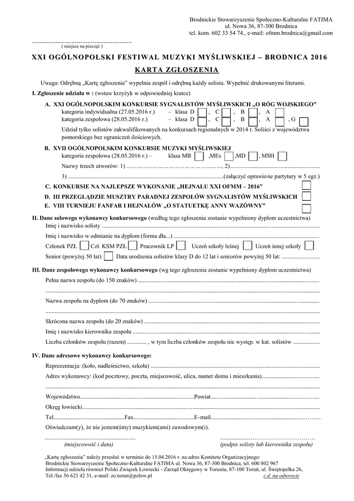 Brodnickie Stowarzyszenie Społeczno-Kulturalne FATIMA ul. Nowa 36, 87-300 Brodnica tel. kom. 602 33 54 74., e-mail: [email protected] ........................................................ ( miejsce na pieczęć ) XXI O GÓL NO POL SKI FESTI WAL MUZYKI MYŚLI WS KIE J – BRO DNICA 201 6 KARTA ZGŁOS ZENIA Uwaga: Odrębną „Kartę zgłoszenia” wypełnia zespół i odrębną każdy solista. Wypełnić drukowanymi literami. I. Zgłoszenie udziału w : (wstaw krzyżyk w odpowiedniej kratce) A. XXI OGÓLNOPOLSKIM KONKURSIE SYGNALISTÓW MYŚLIWSKICH „O RÓG WOJSKIEGO” kategoria indywidualna (27.05.2016 r.) – klasa D , C , B , A kategoria zespołowa (28.05.2016 r.) – klasa D , C , B , A ,G Udział tylko solistów zakwalifikowanych na konkursach regionalnych w 2014 r. Soliści z województwa pomorskiego bez ograniczeń ilościowych. B. XVII OGÓLNOPOLSKIM KONKURSIE MUZYKI MYŚLIWSKIEJ kategoria zespołowa (28.05.2016 r.) – klasa MB ,MEs , ,MD , MSH Nazwy trzech utworów: 1) ………………………………………………, 2)............................................................. 3) .........................................................................................................(załączyć oprawio ne partytury w 5 egz.) C. KONKURSIE NA NAJLEPSZE WYKONANIE „HEJNAŁU XXI OFMM – 2016” D. III PRZEGLĄDZIE MUSZTRY PARADNEJ ZESPOŁÓW SYGNALISTÓW MYŚLIWSKICH E. VIII TURNIEJU FANFAR I HEJNAŁÓW „O STATUETKĘ ANNY WAZÓWNY” II. Dane solowego wykonawcy konkursowego (według tego zgłoszenia zostanie wypełniony dyplom uczestnictwa) Imię i nazwisko solisty ................................................................................................................. .................................. Imię i nazwisko w odmianie na dyplom (forma dla...) .................................................................................................. Członek PZŁ Czł. KSM PZŁ Senior (powyżej 50 lat) Pracownik LP Uczeń szkoły leśnej Uczeń innej szkoły Data urodzenia solistów klasy D do 12 lat i seniorów powyżej 50 lat: .......................... III. Dane zespołowego wykonawcy konkursowego (wg tego zgłoszenia zostanie wypełniony dyplom uczestnictwa) Pełna nazwa zespołu (do 150 znaków) .......................................................................................................................... ......................................................................................................................................................................................... Nazwa zespołu na dyplom (do 70 znaków) .................................................................................................... ............... ......................................................................................................................................................................................... Skrócona nazwa zespołu (do 20 znaków) ....................................................................................... ............................... Imię i nazwisko kierownika zespołu ..................................................................................................................... ......... Liczba członków zespołu (razem) ............. , w tym liczba członków zespołu nie występ. w kat. solistów .................. IV. Dane adresowe wykonawcy konkursowego: Reprezentacja: (koło, nadleśnictwo, szkoła) .................................................................................................................. Adres wykonawcy: (kod pocztowy, poczta, miejscowość, ulica, numer domu i mieszkania)....................................... ......................................................................................................................................................................................... Województwo.............................................................................Powiat............................... .......................................... Okręg łowiecki................................................................................................................................................................ Tel................................................Fax.........................................E-mail.................................................................……. Oświadczam(y), że nie jestem(śmy) muzykiem(ami) zawodowym(i). ............................................................. (miejscowość i data) ....................…………………………… (podpis solisty lub kierownika zespołu) „Kartę zgłoszenia” należy przesłać w terminie do 15.04.2016 r. na adres Komitetu Organizacyjnego: Brodnickie Stowarzyszenie Społeczno-Kulturalne FATIMA ul. Nowa 36, 87-300 Brodnica, tel. 600 802 967 Informacji udziela również Polski Związek Łowiecki - Zarząd Okręgowy w Toruniu, 87-100 Toruń, ul. Świętopełka 26, Tel./fax 56 623 42 31, e-mail: [email protected] c.d. na odwrocie V. Skład zespołu: Lista członków zespołu występujących w konkursie Imię i nazwisko Lp. 1 Data urodzenia Rodz. rogu myśliwsk. Członek PZŁ Kierownik zespołu: 2 3 4 5 6 7 8 9 10 11 12 13 14 15 16 17 18 19 20 ............................................. (Podpis kierownika zespołu) Członek KSM