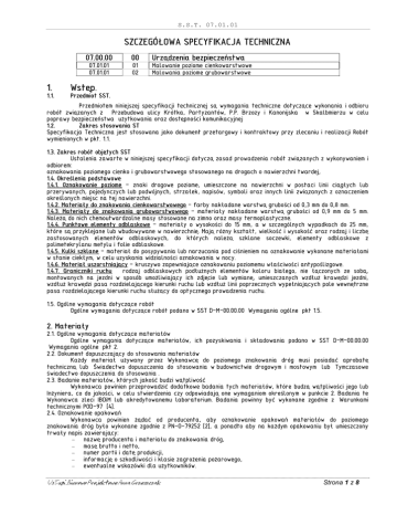 S.S.T. 07.01.01 SZCZEGÓŁOWA SPECYFIKACJA TECHNICZNA 07.00.00 00 Urządzenia bezpieczeństwa 07.01.01 07.01.01 01 02 Malowanie poziome cienkowarstwowe Malowania poziome grubowarstwowe 1. Wstęp. 1.1. Przedmiot SST. Przedmiotem niniejszej specyfikacji technicznej są wymagania techniczne dotyczące wykonania i odbioru robót związanych z „Przebudowa ulicy Krótka, Partyzantów, P.P. Brzozy i Kanonijska w Skalbmierzu w celu poprawy bezpieczeństwa użytkowania oraz dostępności komunikacyjnej 1.2. Zakres stosowania ST Specyfikacja Techniczna jest stosowana jako dokument przetargowy i kontraktowy przy zlecaniu i realizacji Robót wymienionych w pkt. 1.1. 1.3. Zakres robót objętych SST Ustalenia zawarte w niniejszej specyfikacji dotyczą zasad prowadzenia robót związanych z wykonywaniem i odbiorem: oznakowania poziomego cienko i grubowarstwowego stosowanego na drogach o nawierzchni twardej, 1.4. Określenia podstawowe 1.4.1. Oznakowanie poziome - znaki drogowe poziome, umieszczone na nawierzchni w postaci linii ciągłych lub przerywanych, pojedynczych lub podwójnych, strzałek, napisów, symboli oraz innych linii związanych z oznaczeniem określonych miejsc na tej nawierzchni. 1.4.2. Materiały do znakowania cienkowarstwowego - farby nakładane warstwą grubości od 0,3 mm do 0,8 mm. 1.4.3. Materiały do znakowania grubowarstwowego - materiały nakładane warstwą grubości od 0,9 mm do 5 mm. Należą do nich chemoutwardzalne masy stosowane na zimno oraz masy termoplastyczne. 1.4.4. Punktowe elementy odblaskowe - materiały o wysokości do 15 mm, a w szczególnych wypadkach do 25 mm, które są przyklejane lub wbudowywane w nawierzchnię. Mają różny kształt, wielkość i wysokość oraz rodzaj i liczbę zastosowanych elementów odblaskowych, do których należą szklane soczewki, elementy odblaskowe z polimetekrylanu metylu i folie odblaskowe. 1.4.5. Kulki szklane - materiał do posypywania lub narzucania pod ciśnieniem na oznakowanie wykonane materiałami w stanie ciekłym, w celu uzyskania widzialności oznakowania w nocy. 1.4.6. Materiał uszorstniający - kruszywo zapewniające oznakowaniu poziomemu właściwości antypoślizgowe. 1.4.7. Graniczniki ruchu – rodzaj odblaskowych podłużnych elementów koloru białego, nie łączonych ze sobą, montowanych na jezdni w sposób umożliwiający ich zdjęcie lub wymianę, umieszczanych wzdłuż krawędzi jezdni, wzdłuż krawędzi pasa rozdzielającego kierunki ruchu lub wzdłuż linii poprzecznych wypełniających pole wewnętrzne pasa rozdzielającego kierunki ruchu służący do optycznego prowadzenia ruchu. 1.5. Ogólne wymagania dotyczące robót Ogólne wymagania dotyczące robót podano w SST D-M-00.00.00 „Wymagania ogólne” pkt 1.5. 2. Materiały 2.1. Ogólne wymagania dotyczące materiałów Ogólne wymagania dotyczące materiałów, ich pozyskiwania i składowania podano w SST D-M-00.00.00 „Wymagania ogólne” pkt 2. 2.2. Dokument dopuszczający do stosowania materiałów Każdy materiał używany przez Wykonawcę do poziomego znakowania dróg musi posiadać aprobatę techniczną lub “Świadectwo dopuszczenia do stosowania w budownictwie drogowym i mostowym” lub “Tymczasowe świadectwo dopuszczenia do stosowania”. 2.3. Badanie materiałów, których jakość budzi wątpliwość Wykonawca powinien przeprowadzić dodatkowe badania tych materiałów, które budzą wątpliwości jego lub Inżyniera, co do jakości, w celu stwierdzenia czy odpowiadają one wymaganiom określonym w punkcie 2. Badania te Wykonawca zleci IBDiM lub akredytowanemu laboratorium. Badania powinny być wykonane zgodnie z „Warunkami technicznymi POD-97” [4]. 2.4. Oznakowanie opakowań Wykonawca powinien żądać od producenta, aby oznakowanie opakowań materiałów do poziomego znakowania dróg było wykonane zgodnie z PN-O-79252 [2], a ponadto aby na każdym opakowaniu był umieszczony trwały napis zawierający: − nazwę producenta i materiału do znakowania dróg, − masę brutto i netto, − numer partii i datę produkcji, − informację o szkodliwości i klasie zagrożenia pożarowego, − ewentualne wskazówki dla użytkowników. Usługi Biurowo Projektowe Anna Grzeszczak Strona 1 z 8 S.S.T. 07.01.01 2.5. Przepisy określające wymagania dla materiałów Podstawowe wymagania dotyczące materiałów podano w punkcie 2.6, a szczegółowe wymagania określone są w „Warunkach technicznych POD-97” [4]. 2.6. Wymagania wobec materiałów do poziomego znakowania dróg 2.6.1. Materiały do znakowania cienkowarstwowego Materiałami do znakowania cienkowarstwowego powinny być farby nakładane warstwą grubości od 0,3 mm do 0,8 mm (na mokro). Powinny być nimi ciekłe produkty zawierające ciała stałe rozproszone w organicznym rozpuszczalniku lub wodzie, które mogą występować w układach jedno- lub wieloskładnikowych. Podczas nakładania farb, do znakowania cienkowarstwowego, na nawierzchnię pędzlem, wałkiem lub przez natrysk, powinny one tworzyć warstwę kohezyjną w procesie odparowania i/lub w procesie chemicznym. Właściwości fizyczne materiałów do znakowania cienkowarstwowego określa aprobata techniczna odpowiadająca wymaganiom POD-97 [4]. 2.6.2. Materiały do znakowania grubowarstwowego Materiałami do znakowania grubowarstwowego powinny być materiały umożliwiające nakładanie ich warstwą grubości od 0,9 mm do 5 mm, jak masy chemoutwardzalne stosowane na zimno oraz masy termoplastyczne. Masy chemoutwardzalne powinny być substancjami jedno- lub dwuskładnikowymi, mieszanymi ze sobą w proporcjach ustalonych przez producenta i nakładanymi na nawierzchnię odpowiednim aplikatorem. Masy te powinny tworzyć warstwę kohezyjną w wyniku reakcji chemicznej. Masy termoplastyczne powinny być substancjami nie zawierającymi rozpuszczalników, dostarczanymi w postaci bloków, granulek lub proszku. Przy stosowaniu powinny dać się podgrzewać do stopienia i aplikować ręcznie lub maszynowo. Masy te po