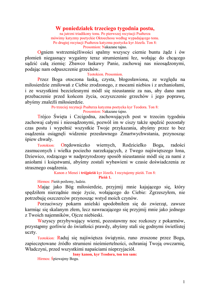 W poniedziałek trzeciego tygodnia postu, na jutrzni triadikony tonu. Po pierwszej recytacji Psałterza mówimy katyzmy poetyckie Oktoechosu według wypadającego tonu. Po drugiej recytacji Psałterza katyzma poetycka kyr Józefa. Ton 8: Prosomion: Nakazane tajno. Ogniem wstrzemięźliwości spalmy wszyscy ciernie buntu Ŝądz i ów płomień niegasnący wygaśmy teraz strumieniami łez, wołając do chcącego sądzić całą ziemię: Zbawco łaskawy Panie, zachowaj nas nieosądzonymi, podając nam odpuszczenie grzechów. Teotokion. Prosomion. Przez Boga otoczona łaską, czysta, błogosławiona, ze względu na miłosierdzie zmiłowań z Ciebie zrodzonego, z mocami niebios i z archaniołami, i ze wszystkimi bezcielesnymi módl się nieustannie za nas, aby dano nam przebaczenie przed końcem Ŝycia, oczyszczenie grzechów i jego poprawę, abyśmy znaleźli miłosierdzie. Po trzeciej recytacji Psałterza katyzma poetycka kyr Teodora. Ton 8: Prosomion: Nakazane tajno. Trójco Święta i Czcigodna, zachowujących post w trzecim tygodniu zachowaj całymi i nieosądzonymi, pozwól im w ciszy takŜe spędzić pozostały czas postu i wypełnić wszystkie Twoje przykazania, abyśmy przez to bez osądzenia osiągnęli widzenie przesławnego Zmartwychwstania, przynosząc śpiew chwały. Teotokion: Orędowniczko wiernych, Rodzicielko Boga, radości zasmuconych i wielka pociecho narzekających, z Twego najświętszego łona, Dziewico, rodzącego w nadprzyrodzony sposób nieustannie módl się za nami z aniołami i księstwami, abyśmy zostali wybawieni w czasie doświadczenia ze strasznego osądzenia. Kanon z Menei i trójpieśń kyr Józefa. I recytujemy pieśń. Ton 8: Pieśń 1. Hirmos: Pieśń poślemy, ludzie. Mając jako Bóg miłosierdzie, przyjmij mnie kajającego się, który spędziłem nierządnie moje Ŝycie, wołającego do Ciebie: Zgrzeszyłem, nie potrzebuję oszczerców przynosząc wstyd moich czynów. Porzuciwszy pokarm anielski upodobniłem się do zwierząt, zawsze karmiąc się skalanym złem, lecz nawracającego się przyjmij mnie jako jednego z Twoich najemników, Ojcze niebieski. Wszyscy przybywający wierni, pozostawmy noc rozkoszy z pokarmów, przystąpmy gorliwie do światłości prawdy, abyśmy stali się godnymi świetlistej uczty. Teotokion: Raduj się najświętsza świątynio, runo zroszone przez Boga, zapieczętowane źródło strumieni nieśmiertelności, ochraniaj Twoją owczarnię, Władczyni, przed wszystkimi napaściami nieprzyjaciół. Inny kanon, kyr Teodora, ton ten sam: Hirmos: Śpiewajmy Bogu. 1 Teraz w tygodniach trzech, jak dawno temu w ciągu dni trzech Izrael, oczyścimy się, bracia, osiągniemy górę modlitw i usłyszawszy stamtąd BoŜy głos, zaśpiewamy Chrystusowi. Jak Samson umocniwszy się postem, przyjdźcie i jak innego zwierza porazimy czarnego biesa, ludzie, i Dalila nie zaśmieje się z oszukujących nas Ŝądz. Chwała. Triadikon: Jak cherubini opiewam Trzech, Twoje święte Bóstwo, Światłości i Światłość, śywot i śywoty, Boga rodzącego, Boga zrodzonego, Boga od Ojca pochodzącego, Ducha śywego. I teraz. Teotokion: Raduj się, radości Ewy, bowiem jej smutek ustał przed Twoje zrodzenie, Czysta. Raduj się, świetlisty obłoku niezachodzącej Światłości, z którego zajaśniał Chrystus Bóg. Chwała Tobie, BoŜe nasz, chwała Tobie. Uzbrójmy się i my w wiarę jak Dawid, abyśmy pokorną mądrością pokonali innego Goliata, czyli odrzuciwszy pełen pychy rozum zrazem posiekali Ŝądze ciemności. Katabasja: Śpiewajmy Bogu, który z gorzkiej niewoli faraona wybawił Izraela, kierował nim ognistym słupem i jaśniejącym obłokiem, albowiem się wysławił. Pieśń 8. Hirmos: Wielce wymowny. Roztrwoniwszy z nierządnicami bogactwo ojcowskie, wygnany zostałem z przedsionków łaski, nieszczęsny, lecz przyjmij mnie, Ojcze, ze względu na niezmierzone miłosierdzie. W jaśniejący post oświecani światłem miłosierdzia oświecimy się, będziemy jaśniejący, aby uniknąć ciemności grzechu. Modli się do Ciebie chór bezcielesnych, cherubini modlą się i zastępy świętych, aby wielce miłosierny Chrystus zbawił nasze dusze. Teotokion: Ty, któraś poczęła nieuprawiany szczep winny, uczyń mnie wstrzemięźliwym, omroczonego pijaństwem grzechu, Bogurodzico Dziewico, nadziejo naszych dusz. Inny hirmos: Ty, który pokrywasz wodami. Przyjdźcie, rozkoszujmy się postem, bracia, skarbnicą ojcowską, cudnym majątkiem, matką wszystkich słuŜących Władcy Chrystusowi, bracia, bowiem on umacnia ciało oraz oświeca rozum i serce. Naśladuj, duszo, cudownego Gedeona, przynosząc Chrystusowi cnoty wiarę, nadzieję i miłość, wyjdź zabijając obcoplemiennie Ŝądze, jak Gedeon z trzystoma zniszczył plemię Madianitów. Chwała. Triadikon: Sławię Ciebie jako Trójcę i jako Jednej śpiewam Tobie, Bóstwo jedno, Ojcze wszechmogący i współwładczy Synu, Duchu Święty, jedna natura, wszechwładne panowanie, jedno królestwo wielbione w Trzech nakreśleniach. I teraz. Teotokion: Ty, która w zrodzeniu w nadprzyrodzony sposób uniknęłaś bólów, poznałaś je w czcigodnej męce zrodzonego przez Ciebie, i 2 boleściwie patrząc na Ciebie z woli śydów przygwoŜdŜonego do krzyŜa, a Ty na wodach umocniłeś ziemię. Chwała Tobie, BoŜe nasz, chwałą Tobie. Gdy przyjdziesz w Twojej chwale sądzić całą ziemię, z tysiącami i miriadami Twoich mocy, wtedy oszczędź mnie, Panie, przebacz i wybaw z osądzenia, nie zawstydź mnie, ani teŜ nie osądź na wieczny ogień. Chwalimy, błogosławimy i kłaniamy się Panu, śpiewając i wywyŜszając Go na wieki. Katabasja: Ty, który pokrywasz wodami wysokie góry swoje, kładziesz z piasku granicę morzu i wszystko trzymasz, Tobie śpiewa słońce, Ciebie sławi księŜyc, Tobie całe stworzenie przynosi pieśń jako Stwórcy wszystkich na wieki. Pieśń 9. Hirmos: Wyjawione. Oddaliłem się od Twojej miłości, Ojcze, i dobrowolnymi poruszeniami rozkoszy zniewoliłe