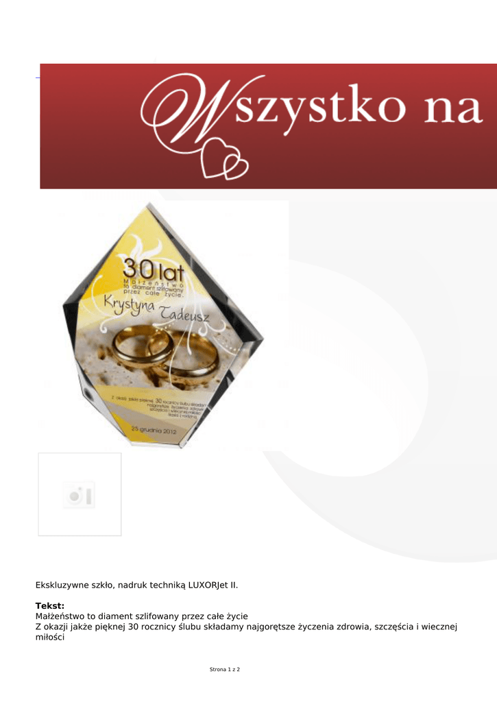 Ekskluzywne szkło, nadruk techniką LUXORJet II. Tekst: Małżeństwo to diament szlifowany przez całe życie Z okazji jakże pięknej 30 rocznicy ślubu składamy najgorętsze życzenia zdrowia, szczęścia i wiecznej miłości Strona 1 z 2 Dane do uzupełnienia przez klienta: Rocznica ślubu Imiona, Data, Wymiary produktu: wysokość: 195 mm grubość: 30 mm Strona 2 z 2