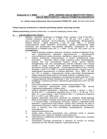 Załącznik nr 1 SIWZ OPIS I ZAKRES USŁUG MEDYCYNY PRACY, USŁUG MEDYCZNYCH I USŁUG STOMATOLOGICZNYCH na: „Zakup usług medycznych dla pracowników PGNiG SA”, znak: ZP/2013/235/CS/BZ Usługi mają być świadczone w zakresie jednolitego pakietu opisanego poniżej: Pakiet pracowniczy powinien obejmować, co najmniej następujący zakres usług: A. USŁUGI MEDYCYNY PRACY: I. Zgodnie z zakresem określonym w Kodeksie Pracy, Ustawie z dnia 27.06.1997 r. o służbie medycyny pracy (Dz. U. z 2004 r. Nr 125 poz. 1317 z późn. zm.) oraz w przepisach wydanych na ich podstawie, w szczególności Rozporządzeniu Ministra Zdrowia i Opieki Społecznej z dnia 30 maja 1996 r., w sprawie przeprowadzania badań lekarskich pracowników, zakresu profilaktycznej opieki zdrowotnej nad pracownikami oraz orzeczeń lekarskich, wydawanych do celów przewidzianych w Kodeksie pracy (Dz. U. z 1996 r. Nr 69, poz. 332 z późn. zm.) w szczególności: 1. badania lekarskie wstępne, okresowe i kontrolne, określone Kodeksem Pracy wraz kompleksowymi badaniami diagnostycznymi i laboratoryjnymi oraz profilaktyczna opieka zdrowotna, niezbędna z uwagi na warunki pracy, 2. badania okulistyczne przeprowadzane w ramach profilaktycznej opieki zdrowotnej – minimalny zakres badań wskazany przez Zamawiającego: badanie dna oka, komputerowe badanie wzroku, pomiar ciśnienia śródgałkowego oraz inne specjalistyczne badania wskazane przez lekarza okulistę w czasie trwania wizyty. Wydanie zaświadczenia o potrzebie stosowania okularów korekcyjnych – Rozporządzenie Ministra Pracy i Polityki Socjalnej z dnia 01.12.1998r. w sprawie bezpieczeństwa i higieny pracy na stanowiskach wyposażonych w monitory ekranowe – Dz.U. 1998 r., Nr 148, poz. 973, w związku z pogorszeniem wzroku pracownika Zamawiającego między badaniami okresowymi do refundacji okularów w zakładzie pracy, 3. badania psychologiczne wynikające z obowiązujących aktów prawnych, w tym z Rozporządzenia Ministra Środowiska z dnia 15 grudnia 2011 r. w sprawie kwalifikacji w zakresie górnictwa i ratownictwa górniczego (Dz.U.2011 Nr 275, poz.1628), 4. orzecznictwo lekarskie w zakresie wskazanym przez Kodeks Pracy, 5. ocena możliwości wykonywania pracy uwzględniająca stan zdrowia i zagrożenia występujące w miejscu pracy, 6. badania lekarskie kandydatów i kierowców, zgodnie z Ustawą z dnia 5 stycznia 2011 r. o kierujących pojazdami (dz.U. z 2011 r. Nr 30, poz. 151 z pózn. zm. ) oraz Ustawą z dnia 6 września 2001 r. o transporcie drogowym (Dz. U. z 2012 r. poz.1265 z pózn. .zm.), 7. badania ratowników górniczych stosownie do przepisów Rozporządzenia Ministra Gospodarki w sprawie ratownictwa górniczego (Dz.U. Nr 94 poz. 838 z 12 czerwca 2002r. z późniejszymi zmianami), zgodnie z „Metodyką badań lekarskich i psychicznych oraz kryteria i zasady oceny zdolności do pracy w ratownictwie górniczym, badania wysokościowe: zawierają badania poziomu cukru w surowicy krwi oraz konsultacje: laryngologiczną, okulistyczną, neurologiczną, 8. badania pracowników kolei, 9. analiza stanu zdrowia pracowników oraz udzielanie porad w zakresie organizacji pracy, ergonomii, fizjologii i psychologii pracy, 10. udział lekarza w zakładowej komisji bezpieczeństwa i higieny pracy, wizytacja stanowisk pracy, 11. prowadzenie czynnego poradnictwa w stosunku do chorych na choroby zawodowe lub inne choroby związane z wykonywana pracą, 1 wydawanie wniosków pracownikom Zamawiającego na wczasy profilaktycznolecznicze z zabiegami rehabilitacyjnymi, na zasadach określonych przez Zamawiającego . Badania dodatkowe w ramach USŁUG MEDYCYNY PRACY, w szczególności: 1. morfologia krwi obwodowej+ rozmaz 2. OB. 3. kreatynina (badanie pozwalające na sprawdzenie stanu nerek) 4. retikulocyty 5. bilirubina 6. cholesterol całkowity 7. glutamylotranspeptydaza 8. cukier (glukoza) we krwi 9. HDL cholesterol 10. lipidogram (HDL, LDL, całkowity i trójglicerydy) 11. transaminazy AST 12. transaminazy ALT 13. kał – badanie w kierunku pasożytów 14. kał – badanie na nosicielstwo 15. kał na krew utajoną 16. mocz badanie ogólne 17. morfologia bez rozmazu 18. WR 19. antygen HbsAg – WZW typu B (test jakościowy) 20. RTG klatki piersiowej 21. EKG 12. II. B. USŁUGI MEDYCZNE: I. Opieka lekarza internisty –(nielimitowana ilość wizyt). . II. Opieka lekarzy specjalistów poniżej wskazanych: (nielimitowana ilość wizyt, za wyjątkiem psychologa i psychiatry – ograniczenie do czterech wizyt w roku kalendarzowym) 1. I grupa: 1.1 okulista 1.2. chirurg ogólny 1.3. ortopeda 1.4. rehabilitant 2. II grupa: 2.1. ginekolog 2.2. dermatolog 2.3. kardiolog 2.4. laryngolog 2.5. gastrolog 3. III grupa: 3.1. alergolog 3.2. urolog 3.3. diabetolog 3.4. endokrynolog 3.5. neurolog 3.6. hematolog 3.7. gastroenterolog 3.8. onkolog 3.9. reumatolog 3.10. nefrolog 3.11. neurochirurg 3.12. pulmonolog, 4. IV grupa: 4.1. medycyny tropikalnej (medycyny podróży) 4.2. psychiatra 4.3. psycholog 4.4. chirurg naczyniowy 2 5. III. 4.5. chirurg onkolog 4.6. hepatolog pozostali lekarze specjaliści oferowani przez Wykonawcę. Świadczenia zdrowotne: 1. Szczepienia wraz z kosztem szczepionki: 1.1. raz do roku szczepienia przeciwko grypie 1.2. przeciwko kleszczowemu zapaleniu mózgu – szczepienie podstawowe (3 dawki); 1.3. przeciw tężcowi – doraźnie w miarę potrzeby; 1.4. przeciwko WZW typu B i A szczepienia podstawowe (3 dawki); 2. Badania medyczne: 2.1. laboratoryjne (na podstawie skierowania od lekarza): 2.1.1. HEMATOLOGIA I KOAGULOLOGIA: 1) 2) 3) 4) 5) 6) 7) 8) 9) 10) 11) 2.1.2. ANALITYKA: 1) 2) 3) 4) 5) 6) 7) 8) 9) 10) 11) 12) 13) 14) 15) 2.1.3. Morfologia (komputer.) bez rozmazu Morfologia + rozmaz mikroskopowy OB. Retikulocyty Płytki krwi (liczone w komorze - mikroskopowo) APTT - czas kefalinowo - kaolinowy Czas protrombinowy ( wskaźnik Quicka) PT INR Fibrynogen De-Dimery P-ciała przeciwpłytkowe Antytrombina III Mocz badanie ogólne Mocz - białko (z dobowej zbiórki 