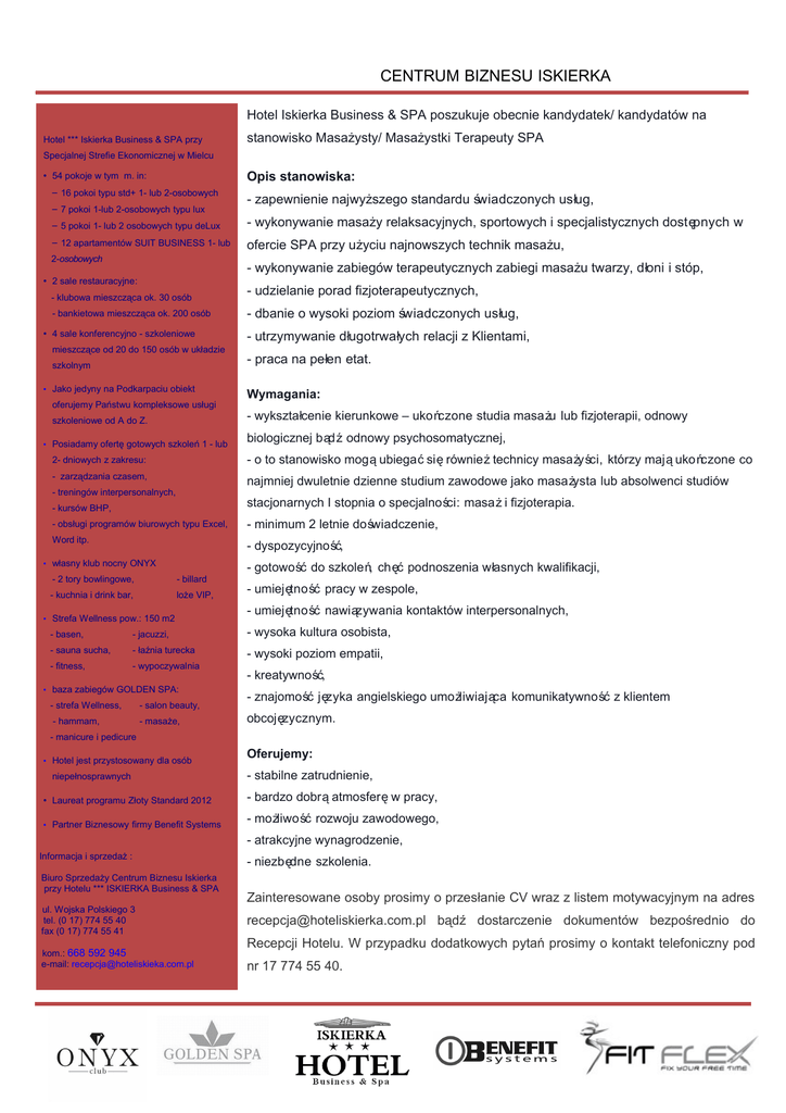 CENTRUM BIZNESU ISKIERKA Hotel Iskierka Business & SPA poszukuje obecnie kandydatek/ kandydatów na Hotel *** Iskierka Business & SPA przy stanowisko Masażysty/ Masażystki Terapeuty SPA Specjalnej Strefie Ekonomicznej w Mielcu • 54 pokoje w tym m. in: Opis stanowiska: − 16 pokoi typu std+ 1- lub 2-osobowych − 7 pokoi 1-lub 2-osobowych typu lux - zapewnienie najwyższego standardu świadczonych us ług, − 5 pokoi 1- lub 2 osobowych typu deLux - wykonywanie masaży relaksacyjnych, sportowych i specjalistycznych dost ępnych w − 12 apartamentów SUIT BUSINESS 1- lub ofercie SPA przy użyciu najnowszych technik masażu, 2-osobowych - wykonywanie zabiegów terapeutycznych zabiegi masażu twarzy, d łoni i stóp, • 2 sale restauracyjne: - klubowa mieszcząca ok. 30 osób - bankietowa mieszcząca ok. 200 osób • 4 sale konferencyjno - szkoleniowe mieszczące od 20 do 150 osób w układzie szkolnym • Jako jedyny na Podkarpaciu obiekt oferujemy Państwu kompleksowe usługi szkoleniowe od A do Z. • Posiadamy ofertę gotowych szkoleń 1 - lub - udzielanie porad fizjoterapeutycznych, - dbanie o wysoki poziom świadczonych us ług, - utrzymywanie długotrwa łych relacji z Klientami, - praca na pełen etat. Wymagania: - wykształcenie kierunkowe – uko ńczone studia masa żu lub fizjoterapii, odnowy biologicznej b ąd ź odnowy psychosomatycznej, 2- dniowych z zakresu: - o to stanowisko mog ą ubiega ć si ę równie ż technicy masa ży ści, którzy maj ą uko ńczone co - zarządzania czasem, najmniej dwuletnie dzienne studium zawodowe jako masa żysta lub absolwenci studiów - treningów interpersonalnych, - kursów BHP, stacjonarnych I stopnia o specjalno ści: masa ż i fizjoterapia. - obsługi programów biurowych typu Excel, - minimum 2 letnie do świadczenie, Word itp. - dyspozycyjno ść, • własny klub nocny ONYX - 2 tory bowlingowe, - billard - kuchnia i drink bar, loże VIP, • Strefa Wellness pow.: 150 m2 - gotowo ść do szkole ń, ch ęć podnoszenia w łasnych kwalifikacji, - umiej ętno ść pracy w zespole, - umiej ętno ść nawi ązywania kontaktów interpersonalnych, - basen, - jacuzzi, - wysoka kultura osobista, - sauna sucha, - łaźnia turecka - wysoki poziom empatii, - fitness, - wypoczywalnia • baza zabiegów GOLDEN SPA: - strefa Wellness, - salon beauty, - hammam, - masaże, - kreatywno ść, - znajomo ść j ęzyka angielskiego umo żliwiaj ąca komunikatywno ść z klientem obcoj ęzycznym. - manicure i pedicure • Hotel jest przystosowany dla osób niepełnosprawnych Oferujemy: - stabilne zatrudnienie, • Laureat programu Złoty Standard 2012 - bardzo dobr ą atmosfer ę w pracy, • Partner Biznesowy firmy Benefit Systems - mo żliwo ść rozwoju zawodowego, - atrakcyjne wynagrodzenie, Informacja i sprzedaż : Biuro Sprzedaży Centrum Biznesu Iskierka przy Hotelu *** ISKIERKA Business & SPA ul. Wojska Polskiego 3 tel. (0 17) 774 55 40 fax (0 17) 774 55 41 kom.: 668 592 945 e-mail: [email protected] - niezb ędne szkolenia. Zainteresowane osoby prosimy o przesłanie CV wraz z listem motywacyjnym na adres [email protected] bądź dostarczenie dokumentów bezpośrednio do Recepcji Hotelu. W przypadku dodatkowych pytań prosimy o kontakt telefoniczny pod nr 17 774 55 40.