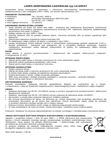 LAMPA KEMPINGOWA ŁADOWALNA typ LA109PA7 Uniwersalna lampa kempingowa ładowalna z ołowiowym akumulatorem bezobsługowym. (doładowywanie) z sieci zasilającej 230V~/ 50Hz, lub wtyczki samochodowej 12V=. PARAMETRY TECHNICZNE ● świetlówka ● zasilanie ● zasilacz ● czas ciągłego świecenia Ładowanie 7W / GX10Q / 6400 K akumulator bezobsługowy AGM 6V/2,5Ah typ HE-DC 12V / 300mA 4,5 godziny ŁADOWANIE AKUMULATORA LATARKI 1. Jeżeli żarówka nie świeci lub świeci zbyt słabo - konieczne jest naładowanie akumulatora. Konieczność naładowania akumulatora sygnalizuje pomarańczowa kontrolka LED. Ładowanie całkowicie rozładowanego akumulatora trwa około 15 godzin. 2. Podłącz zasilacz do sieci 230V~/ 50Hz. 3. Wtyczkę zasilacza włóż do gniazda zasilania latarki. Czerwona kontrolka LED na lampie sygnalizuje stan ładowania. 4. Zakończenie ładowania sygnalizuje zielona kontrolka LED. 5. Po naładowaniu odłącz zasilacz od latarki, a następnie z sieci 230V~. 6. Lampę kempingową można ładować również w samochodzie wykorzystując gniazdo zapalniczki (12V=). Sposób podłączenia i ładowania jest analogiczny jak w przypadku zasilacza sieciowego. Zupełnie rozładowany akumulator należy ładować maksymalnie 15 godzin. Po naładowaniu odłącz wtyczkę samochodową. Uwagi Ładuj latarkę w suchych w temperaturze 5÷35°C. pomieszczeniach i bezpiecznych dla urządzeń elektrycznych miejscach WYMIANA ŚWIETLÓWKI 1. Odkręć górną część lampy w kierunku przeciwnym do ruchu wskazówek zegara. 2. Ostrożnie wyjmij uszkodzoną świetlówkę i włóż nową. 3. Zakręć górną część lampy w odwrotnym kierunku. WYMIANA AKUMULATORA 1. Wyłącz zasilanie lampy. 2. Odkręć jej dolną część w kierunku przeciwnym do ruchu wskazówek zegara. 3. W dolnej części lampy znajduje się plastikowa obudowa akumulatora. 4. Wyjmij akumulator z lampy i odłącz przewody zasilające. 5. Włóż nowy akumulator i podłącz przewody zasilające (+ przewód czerwony, - przewód niebieski) 6. Zakręć dolną część lampy w odwrotnym kierunku. UŻYTKOWANIE KOMPASU Kompas prawidłowo wskazuje kierunki geograficzne dopiero po wykręceniu go z lampy i umieszczeniu z dala od źródeł pól magnetycznych, elektromagnetycznych i metalowych części urządzeń. UWAGI Zasilacza sieciowego typ HE-DC 12V/300mA używaj w suchych wewnętrznych pomieszczeniach i elektrycznie bezpiecznych miejscach. Zasilacza sieciowego typ HE-DC 12V/300mA używaj wyłącznie do ładowania lampy LA109PA7. Akumulator w lampie ładuj wyłącznie zalecanymi źródłami zasilania. Nie wrzucaj akumulatora do ognia, nie demontuj go. Zużyty akumulator jest produktem szkodliwym dla środowiska. Wyrzucanie go do śmieci jest zabronione. Zużyty akumulator należy oddać do utylizacji w punktach zbierania zużytego sprzętu lub w miejscu zakupu. Podczas wymiany akumulatora zwróć uwagę na właściwą biegunowość (polaryzację). W razie przedostania się wody do lampy, wyjmij akumulator i dokładnie osusz wnętrze latarki. Producent i dostawca nie ponoszą odpowiedzialności za szkody wynikające z niewłaściwego zrozumienia tekstu. UWAGI DOTYCZĄCE ZUŻYTEGO SPRZĘTU ELEKTRYCZNEGO I ELEKTRONICZNEGO. Zgodnie z przepisami Ustawy z dnia 29 lipca 2005 r. o ZSEiE zabronione jest umieszczanie łącznie z innymi odpadami zużytego sprzętu oznakowanego symbolem przekreślonego kosza. Użytkownik, chcąc pozbyć się sprzętu elektronicznego i elektrycznego, jest zobowiązany do oddania go do punktu zbierania zużytego sprzętu. W sprzęcie znajdują się składniki niebezpieczne (związki rtęci), które mają szczególnie negatywny wpływ na środowisko i zdrowie ludzi. Masa netto sprzętu: 1,56 kg www.emos.pl