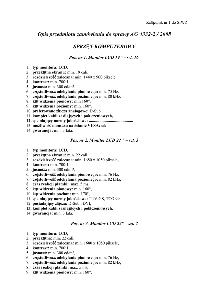 Załącznik nr 1 do SIWZ Opis przedmiotu zamówienia do sprawy AG 4332-2 / 2008 SPRZĘT KOMPUTEROWY Poz. nr 1. Monitor LCD 19 ” - szt. 16 1. typ monitora: LCD. 2. przekątna ekranu: min. 19 cali. 3. rozdzielczość zalecana: min. 1440 x 900 piksele. 4. kontrast: min. 700:1. 5. jasność: min. 300 cd/m². 6. częstotliwość odchylania pionowego: min. 75 Hz. 7. częstotliwość odchylania poziomego: min. 80 kHz. 8. kąt widzenia pionowy: min 160°. 9. kąt widzenia poziomy: min. 160°. 10. preferowane złącza analogowe: D-Sub. 11. komplet kabli zasilających i połączeniowych, 12. spełniający normy jakościowe: .......................................... 13. możliwość montażu na ścianie VESA: tak 14. gwarancja: min. 3 lata. Poz. nr 2. Monitor LCD 22’’ – szt. 3 1. typ monitora: LCD, 2. przekątna ekranu: min. 22 cali, 3. rozdzielczość zalecana: min. 1680 x 1050 piksele, 4. kontrast: min. 700:1, 5. jasność: min. 300 cd/m², 6. częstotliwość odchylania pionowego: min. 76 Hz, 7. częstotliwość odchylania poziomego: min. 82 kHz, 8. czas reakcji plamki: max. 5 ms, 9. kąt widzenia pionowy: min. 160°, 10. kąt widzenia poziom: min. 170°, 11. spełniający normy jakościowe: TUV-GS, TCO 99, 12. posiadający złącza: D-Sub i DVI, 13. komplet kabli zasilających i połączeniowych. 14. gwarancja: min. 3 lata. Poz. nr 3. Monitor LCD 22’’ – szt. 2 1. 2. 3. 4. 5. 6. 7. 8. 9. typ monitora: LCD, przekątna: min. 22 cali, rozdzielczość zalecana: min. 1680 x 1050 piksele, kontrast: min. 700:1, jasność: min. 300 cd/m², częstotliwość odchylania pionowego: min. 76 Hz, częstotliwość odchylania poziomego: min. 82 kHz, czas reakcji plamki: max. 5 ms, kąt widzenia pionowy: min. 160°, 10. kąt widzenia poziomy: min. 170°, 11. spełniający normy jakościowe: TUV-GS, TCO 99, 12. posiadający złącza: D-Sub i DVI, 13. komplet kabli zasilających i połączeniowych 14. gwarancja: min. 3 lata, Poz. nr 4. Zestaw komputerowy – szt. 13 1. Procesor: 64 bitowy, 2 rdzeniowy, wykonanie w technologii 65 nm, częstotliwość taktowania procesora min. 2 200 MHz, częstotliwość taktowania magistrali min. 400 MHz, opakowanie BOX gwarancja min. 3 lata, - AMD Athlon 64 X2 lub równoważny. 2. Płyta główna: obsługa pamięci RAM DDR II-800 (w trybie Dual Channel),, magistrala FSB 400 MHz, złącza na płycie głównej: 1 złącze PCI Express x 16, 2 złącza PCI Express x 1, 2 złącza PCI, 4 x Serial ATA II, 1 x ATA/100, 1 x Serial ATA, Porty dostępne na tylnym panelu: 4 x USB 2.0/1.1, 1 x RJ45, 6 x Audio (4 x Line-out/ 1 x Line-in/ 1 x MIC), 1 x Coaxial S/P-DIF out, 1 x Optical S/P-DIF out, PS/2 Keyboard/ Mouse, 1 x COM, 1 x LPT,, zintegrowana karta dźwiękowa, karta graficzna: zintegrowana obsługująca DirectX 9.0 OpenGL 2.0, D-SUB, DVI, pracująca poprawnie w środowisku 3D w systemach MSWindows oraz Linux, karta sieciowa: zintegrowana 10/100/1000 Ethernet, gwarancja min. 3 lata. 3. Pamięć operacyjna: min. 2 x 1024 MB Ram DDR-2 800 MHz PC2-6400 (pamięci markowe nie OEM, gwarancja min. 5 lat. 4. Napęd optyczny: Odczytywane formaty płyt CD: CD-R, CD-TEXT, CD-RW, CD-ROM XA, CD-ROM, CD-I, CD-Extra, CD-DA DVD: DVD - / + RW, DVD-R, DVD+R, DVDRAM, DVD - /+ R9, obsługa technologi LightScribe, kolor panelu w kolorze obudowy, dołączone oprogramowanie do nagrywania i odtwarzania płyt CD/DVD, min.prędkość zapisu: CD-R x48, CD-RW x 32, DVD + / - R x 20, DVD + / - RW x 8, DVD + / - R DL x 10, DVD + / - RW DL x 12 (DVD-RAM), pojemność pamięci podręcznej: min. 2048 kb, wsparcie dla Burn-Proof, interfejs: E-IDE / ATAPI, gwarancja min. 2 lata. 5. Dysk twardy: min. 160 GB, min. 7 200 obr./min., średni czas dostępu min. 8,9 ms, pamięć cache min. 8 192 kb, interfejs Serial ATA 300, format 3,5 cala, gwarancja min 3 lata. 6. Napęd FDD: 1.44 MB 3.5” w kolorze obudowy, gwarancja min. 1 rok. 7. Obudowa: wyprowadzenie gniazd USB na przednim panelu w górnej części, kolor czarny lub srebrno - czarny, zasilacz do obudowy moc 400 W, standard: ATX 12V 2.2, ATX; wtyczka zasilania [pin]: 24, 20, 1x 6-pin PEG; funkcja PFC: tak; typ PFC: pasywny; ilość wentylatorów chłodzących: 1; średnica wentylatorów: 120 mm; regulacja obrotów wentylatora: automatyczna (termiczna); dodatkowe informacje: certyfikat CE, spełnia normy RoHS, gwarancja na zasilacz min. 2 lata. 8. Klawiatura: klawiatura standard PS 2, z trwa łym (nieścieralnym) opisem klawiszy, zgodna ze standardem Windows, gwarancja min. 2 lata. 9. Mysz: optyczna z rolką do przewijania, standard USB, rozdzielczość min. 800 DPI, do pracy dla osób prawo- i leworęcznych, kompatybilna z firmą logitech, gwarancja min. 2 tala, 10. Zestaw sterowników do wszystkich elementów zestawu wymagających ich zastosowania 11. Komplet kabli zasilających i połączeniowych niezbędnych do prawidłowego działania zestawu. 12. gwarancja na zestaw komputerowy: min. 2 lata. 13. Wszystkie trzynaście sztuk dostarczonych zestawów musi posiadać identyczną konfigurację sprzętową obejmującą takie same podzespoły komputerowe (ten sam producent i model). Poz. nr 5. Monochromatyczna laserowa drukarka sieciowa – szt. 6 1. 2. 3. 4. 5. 6. 7. 8. 9. Nominalna prędkość druku: min. 26 str. / min, Normatywny cykl pracy: min. 15 000 str. / mies. Zainstalowana pamięć: min 32 MB Rozmiar nośnika: max. A4 Złącza zewnętrzne: USB 2.0, Ethernet 10/100 Mbps Obsługiwane języki: HP PCL 6 oraz HP PCL 5e Druk dwustronny duplex: Tak, Praca w sieci: Tak. Gwarancja: min 1 rok możliwość rozszerzenia do 3 lat. Poz. nr 6. Zasilacz awaryjny UPS stacje robocze - szt. 15 moc wyjściowa (pozorna - rzeczywista): 650 VA – min 400 W, napięcie wejściowe: 230 V, częstotliwość: 50 Hz, czas przełączania na UPS: max. 5 ms, ilość gniazd z podtrzymaniem napięcia: min. 2 szt. oprogramowanie umożliwiające prawidłowe automatyczne wyłączenie systemu operacyjnego po wystąpieniu braku prądu. 7. gwarancja: min 2 lata z możliwością przedłużen
