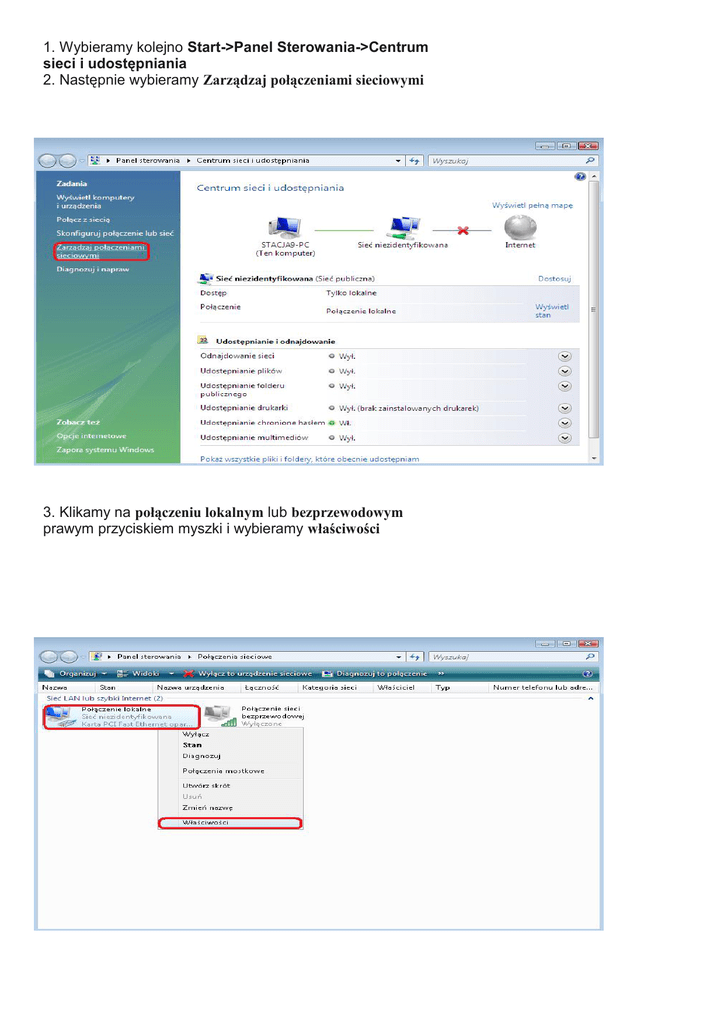 1. Wybieramy kolejno Start->Panel Sterowania->Centrum sieci i udostępniania 2. Następnie wybieramy Zarządzaj połączeniami sieciowymi 3. Klikamy na połączeniu lokalnym lub bezprzewodowym prawym przyciskiem myszki i wybieramy właściwości 4. W okienku Właściwości odznaczamy Protokół internetowy TCP/IP w wersji 6 i 4 5. Potwierdzamy wyłączenie funkcji przyciskiem Tak 6. Ikonka połączenia lokalnego lub bezprzewodowego wyglądać powinna następująco 7. Ponownie wchodzimy w Centrum sieci i udostępniania i wybieramy skonfiguruj połączenie lub sieć 8. Wybieramy pierwszą pozycję Połącz z Internetem i potwierdzamy przyciskiem Dalej 9. Wybieramy połączenie szerokopasmowe PPPoE 10. W kolejnym okienku wypełniamy nazwę użytkownika oraz hasło (wg danych przekazanych przez ELGROM) i potwierdzamy przyciskiem Połącz 11. Kolejne okienko informuje o procesie podłączania 12. Po poprawnym podłączeniu wybieramy Przeglądaj internet teraz lub przycisk Zamknij 13. Wybieramy odpowiednią lokalizację 14. Po poprawnym skonfigurowaniu połączenia szerokopasmowego uzyskamy stan jak na obrazku poniżej