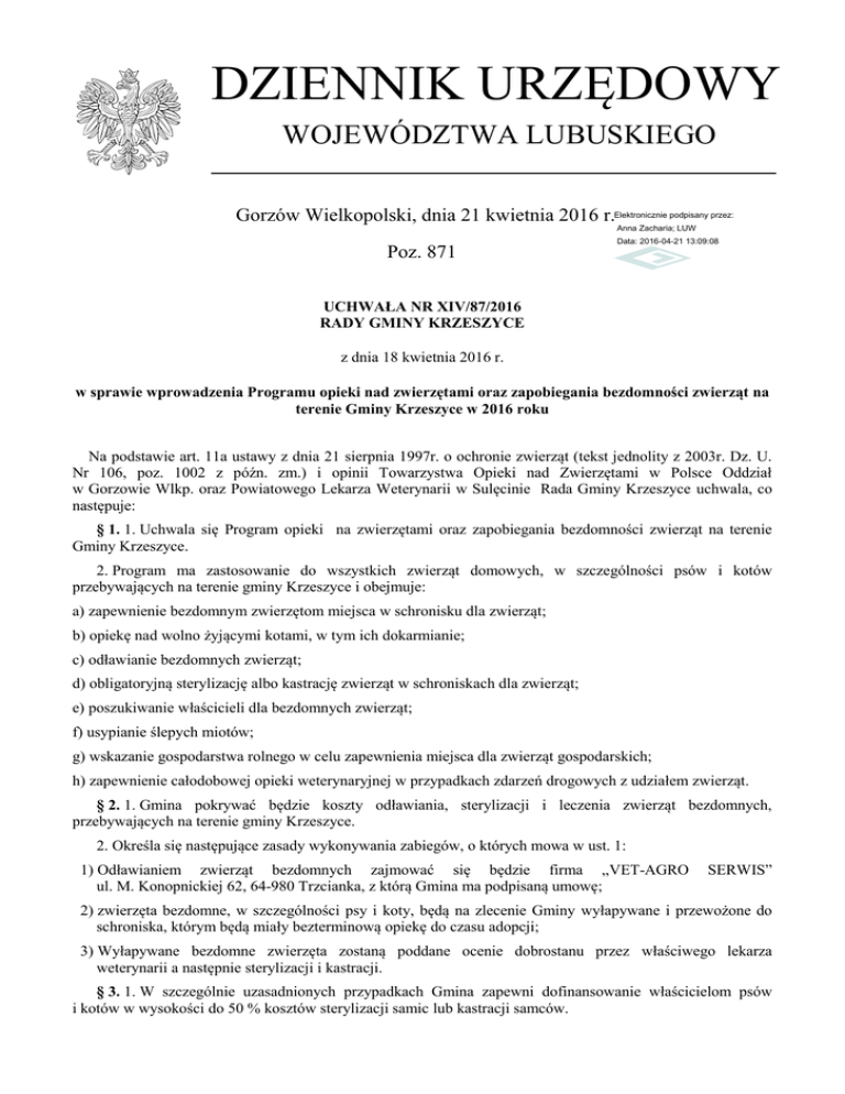 DZIENNIK URZĘDOWY WOJEWÓDZTWA LUBUSKIEGO Gorzów Wielkopolski, dnia 21 kwietnia 2016 r.Elektronicznie podpisany przez: Anna Zacharia; LUW Poz. 871 Data: 2016-04-21 13:09:08 UCHWAŁA NR XIV/87/2016 RADY GMINY KRZESZYCE z dnia 18 kwietnia 2016 r. w sprawie wprowadzenia Programu opieki nad zwierzętami oraz zapobiegania bezdomności zwierząt na terenie Gminy Krzeszyce w 2016 roku Na podstawie art. 11a ustawy z dnia 21 sierpnia 1997r. o ochronie zwierząt (tekst jednolity z 2003r. Dz. U. Nr 106, poz. 1002 z późn. zm.) i opinii Towarzystwa Opieki nad Zwierzętami w Polsce Oddział w Gorzowie Wlkp. oraz Powiatowego Lekarza Weterynarii w Sulęcinie Rada Gminy Krzeszyce uchwala, co następuje: § 1. 1. Uchwala się Program opieki na zwierzętami oraz zapobiegania bezdomności zwierząt na terenie Gminy Krzeszyce. 2. Program ma zastosowanie do wszystkich zwierząt domowych, w szczególności psów i kotów przebywających na terenie gminy Krzeszyce i obejmuje: a) zapewnienie bezdomnym zwierzętom miejsca w schronisku dla zwierząt; b) opiekę nad wolno żyjącymi kotami, w tym ich dokarmianie; c) odławianie bezdomnych zwierząt; d) obligatoryjną sterylizację albo kastrację zwierząt w schroniskach dla zwierząt; e) poszukiwanie właścicieli dla bezdomnych zwierząt; f) usypianie ślepych miotów; g) wskazanie gospodarstwa rolnego w celu zapewnienia miejsca dla zwierząt gospodarskich; h) zapewnienie całodobowej opieki weterynaryjnej w przypadkach zdarzeń drogowych z udziałem zwierząt. § 2. 1. Gmina pokrywać będzie koszty odławiania, sterylizacji i leczenia zwierząt bezdomnych, przebywających na terenie gminy Krzeszyce. 2. Określa się następujące zasady wykonywania zabiegów, o których mowa w ust. 1: 1) Odławianiem zwierząt bezdomnych zajmować się będzie firma „VET-AGRO ul. M. Konopnickiej 62, 64-980 Trzcianka, z którą Gmina ma podpisaną umowę; SERWIS” 2) zwierzęta bezdomne, w szczególności psy i koty, będą na zlecenie Gminy wyłapywane i przewożone do schroniska, którym będą miały bezterminową opiekę do czasu adopcji; 3) Wyłapywane bezdomne zwierzęta zostaną poddane ocenie dobrostanu przez właściwego lekarza weterynarii a następnie sterylizacji i kastracji. § 3. 1. W szczególnie uzasadnionych przypadkach Gmina zapewni dofinansowanie właścicielom psów i kotów w wysokości do 50 % kosztów sterylizacji samic lub kastracji samców. Dziennik Urzędowy Województwa Lubuskiego –2– Poz. 871 2. Określa się następujące zasady dofinansowania zabiegów, o których mowa w ust. 1: 1) dofinansowanie przysługuje tylko mieszkańcom gminy Krzeszyce w stosunku do zwierząt stanowiących ich własność; 2) właściciel, zamierzający poddać zwierzę zabiegowi, zgłasza się do lekarza weterynarii; 3) zabiegi sterylizacji i kastracji dofinansowywane będą tylko tym właścicielom psów, którzy dopełnią obowiązku zaszczepienia psa przeciw wściekliźnie; 4) dofinansowanie przysługuje właścicielom psów i kotów w ilości maksymalnie jednego zwierzęcia rocznie. § 4. 1. Za poszukiwanie nowych właścicieli/opiekunów psów i kotów odpowiadają ich dotychczasowi właściciele/opiekunowie. 2. Gmina może wspierać poszukiwania nowych właścicieli dla psów i kotów poprzez: 1) prowadzenie akcji adopcyjnej bezdomnych zwierząt z terenu gminy, m. in. Poprzez stworzenie elektronicznej bazy danych na stronie internetowej oraz umieszczenie zdjęć i informacji dotyczącej wyłapanych zwierząt na tej stronie oraz na tablicach ogłoszeń w sołectwach; 2) prowadzenie akcji edukacyjnych, zachęcających do zaopiekowania się bezdomnym psem lub kotem. 3. Zwierzętom bezdomnym, które nie znajdą właściciela w drodze adopcji Gmina zapewni schronienie poprzez umieszczenie w schronisku dla zwierząt. § 5. Zapobieganie bezdomności zwierząt będzie realizowane również poprzez rejestrację zwierząt poddanych elektronicznej identyfikacji oraz wyłapywanie zwierząt bezdomnych, tj. takich, które uciekły, zabłąkały się lub zostały porzucone i nie ma możliwości ustalenia ich właściciela lub innych osób, pod których opieką zwierzęta dotychczas przebywały. § 6. 1. Gmina prowadzić będzie gminny rejestr psów. 2. Rejestracji podlegają wszystkie psy, niezależnie od celu, miejsca i sposobu ich utrzymania. 3. Rejestr psów obejmuje zaewidencjonowanie następujących danych: 1) imię i nazwisko właściciela psa; 2) adres właściciela psa; 3) adres miejsca utrzymywania psa; 4) imię i płeć psa; 5) rasę i inne cechy opisujące wygląd psa; 6) wiek psa; 7) numer chipa. 4. Rejestrację i oznakowanie psów prowadzić będzie lekarz weterynarii, z którym Gmina podpisze umowę na prowadzenie rejestru psów. 5. Koszt oznakowania psa ponosić będzie właściciel lub opiekun zwierzęcia. 6. Każda osoba, która wejdzie w posiadanie psa po wprowadzeniu obowiązku rejestracji i znakowania, winna zgłosić go do rejestracji i oznaczyć zgodnie z postanowieniami ust. 1 w następujących terminach: 1) szczenięta - do końca czwartego miesiąca życia; 2) osobniki dorosłe - w okresie do 30 dni licząc od dnia wejścia w posiadanie zwierzęcia. 7. W przypadku zbycia, zaginięcia lub śmierci psa, jego posiadacz zobowiązany jest dokonać aktualizacji danych w rejestrze psów, w terminie 30 dni licząc od dnia daty zaistnienia zdarzenia. § 7. 1. Gmina prowadzić będzie również działania edukacyjne, mające na celu podniesienie poziomu wiedzy mieszkańców w zakresie obowiązków ciążących na osobach utrzymujących lub hodujących psy albo koty, poprzez m. in. zajęcia edukacyjne, ulotki, plakaty. Dziennik Urzędowy Województwa Lubuskiego –3– Poz. 871 2. Działania określone w ust. 1 gmina może zlecić organizacjom pozarządowym, których statutowym celem jest ochrona zwierząt, działającym na terenie Gminy. § 8. 1. Całodobową opiekę weterynaryjną dla zwierząt poszkodowanych w wypadkach drogowych na zlecenie Gminy zapewni