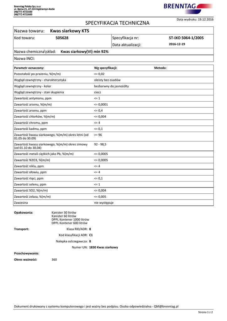 Brenntag Polska Sp.z o.o ul. Bema 21, 47-224 Kędzierzyn-Kożle (48/77) 4721500 (48/77) 4721600 Data wydruku: 19.12.2016 SPECYFIKACJA TECHNICZNA Nazwa towaru: Kwas siarkowy KTS Kod towaru: 505628 Nazwa chemiczna\skład: Specyfikacja nr: ST-IXO 5064-1/2005 Data aktualizacji: 2016-12-19 Kwas siarkowy(VI) min 92% Nazwa INCI: Parametr oznaczony: Wg specyfikacji: Pozostałość po prażeniu, %(m/m) <= 0,02 Wygląd zewnętrzny - charakterystyka oleisty bez osadów Wygląd zewnętrzny - kolor bezbarwny do jasnożółty Wygląd zewnętrzny - stan skupienia ciecz Zawartość antymonu, ppm <= 1 Zawartość arsenu, %(m/m) <= 0,0001 Zawartość arsenu, ppm <= 0,4 Zawartość chlorków, %(m/m) <= 0,004 Zawartość chromu, ppm <= 4 Zawartość kadmu, ppm <= 0,1 Zawartość kwasu siarkowego, %(m/m) okres letni (od 01.05 do 30.09) >= 96 Zawartość kwasu siarkowego, %(m/m) okres zimowy (od 01.10 do 30.04) 92 - 98,5 Zawartość metali ciężkich jako Pb, %(m/m) <= 0,0005 Zawartość N2O3, %(m/m) <= 0,0005 Zawartość niklu, ppm <= 4 Zawartość ołowiu, ppm <= 4 Zawartość rtęci, ppm <= 0,1 Zawartość selenu, ppm <= 1 Zawartość SO2, %(m/m) <= 0,004 Zawartość żelaza, %(m/m) <= 0,005 Zawiesina nie występuje Opakowania: Metoda: Kanister 30 litrów Kanister 60 litrów DPPL Kontener 1000 litrów DPPL Kontener 600 litrów Transport: Klasa RID/ADR: 8 Kod klasyfikacji ADR: C1 Nalepka ostrzegawcza: 8 Numer UN: 1830 Kwas siarkowy Przechowywanie: Okres ważności: 360 Dokument drukowany z systemu komputerowego i jest ważny bez podpisu. Osoba odpowiedzialna - [email protected] Strona 1 z 2 Brenntag Polska Sp.z o.o ul. Bema 21, 47-224 Kędzierzyn-Kożle (48/77) 4721500 (48/77) 4721600 Uwagi: Produkt posiada Atest Higieniczny PZH nr HK/W/0414/01/2009 z dnia 01 lipca 2009 Produkt przeznaczony do korekty pH wody w stacjach uzdatniania wody przeznaczonej do spożycia. Na życzenie odbiorcy dopuszcza się inne stężenia kwasu niż deklarowane w okresie letnim lub zimowym. Przykładowe temperatury krystalizacji kwasu siarkowego w zależności od stężenia: 94% około - 30,8 oC 95% około - 21,8 oC 96% około - 13,6 oC 97% około - 6,3 oC 98% około + 0,1 oC Ten produkt nie jest jakości spożywczej, paszowej, farmaceutycznej. W związku z tym nie może być użyty jako dodatek/składnik żywności, pasz lub produktów farmaceutycznych. Użycie produktu do tych zastosowań pozostaje w zakresie odpowiedzialności klienta. Dane zawarte w niniejszej specyfikacji wynikają z aktualnej wiedzy o produkcie i nie zastępują badań wykonywanych przez odbiorcę przy dostawie. Dokument drukowany z systemu komputerowego i jest ważny bez podpisu. Osoba odpowiedzialna - [email protected] Strona 2 z 2