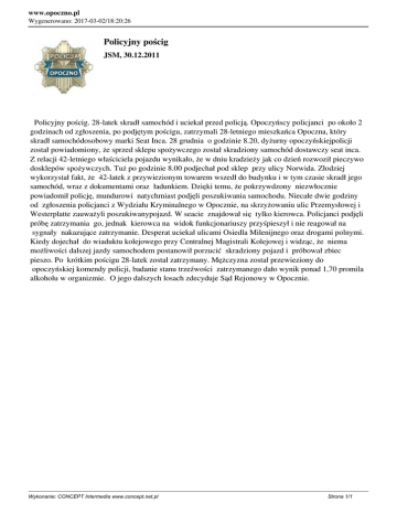 www.opoczno.pl Wygenerowano: 2017-03-02/18:20:26 Policyjny pościg JSM, 30.12.2011 Policyjny pościg. 28-latek skradł samochód i uciekał przed policją. Opoczyńscy policjanci po około 2 godzinach od zgłoszenia, po podjętym pościgu, zatrzymali 28-letniego mieszkańca Opoczna, który skradł samochódosobowy marki Seat Inca. 28 grudnia o godzinie 8.20, dyżurny opoczyńskiejpolicji został powiadomiony, że sprzed sklepu spożywczego został skradziony samochód dostawczy seat inca. Z relacji 42-letniego właściciela pojazdu wynikało, że w dniu kradzieży jak co dzień rozwoził pieczywo dosklepów spożywczych. Tuż po godzinie 8.00 podjechał pod sklep przy ulicy Norwida. Złodziej wykorzystał fakt, że 42-latek z przywiezionym towarem wszedł do budynku i w tym czasie skradł jego samochód, wraz z dokumentami oraz ładunkiem. Dzięki temu, że pokrzywdzony niezwłocznie powiadomił policję, mundurowi natychmiast podjęli poszukiwania samochodu. Niecałe dwie godziny od zgłoszenia policjanci z Wydziału Kryminalnego w Opocznie, na skrzyżowaniu ulic Przemysłowej i Westerplatte zauważyli poszukiwanypojazd. W seacie znajdował się tylko kierowca. Policjanci podjęli próbę zatrzymania go, jednak kierowca na widok funkcjonariuszy przyśpieszył i nie reagował na sygnały nakazujące zatrzymanie. Desperat uciekał ulicami Osiedla Milenijnego oraz drogami polnymi. Kiedy dojechał do wiaduktu kolejowego przy Centralnej Magistrali Kolejowej i widząc, że niema możliwości dalszej jazdy samochodem postanowił porzucić skradziony pojazd i próbował zbiec pieszo. Po krótkim pościgu 28-latek został zatrzymany. Mężczyzna został przewieziony do opoczyńskiej komendy policji, badanie stanu trzeźwości zatrzymanego dało wynik ponad 1,70 promila alkoholu w organizmie. O jego dalszych losach zdecyduje Sąd Rejonowy w Opocznie. Wykonanie: CONCEPT Intermedia www.concept.net.pl Strona 1/1