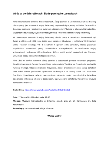 Obóz w dwóch reżimach. Ślady pamięci o Lasowicach Film dokumentalny Obóz w dwóch reżimach. Ślady pamięci o Lasowicach przybliża historię obozu pracy, jaki w czasie II wojny światowej znajdował się w jednej z dzielnic Tarnowskich Gór. Jego projekcja i spotkanie z autorami odbędzie się 17 lutego w Muzeum Górnośląskim. Wydarzenie towarzyszy wystawie Obozy jenieckie Teschen w latach II wojny światowej. W utworzonym w czasie II wojny światowej obozie pracy w Lasowicach internowani byli Żydzi, a później, od 1941 roku, także jeńcy radzieccy i brytyjscy – ze Stalagu VIII D (potem VIII B) Teschen i Stalagu VIII B i 318/VIII F (potem 344) Lamsdorf, którzy pracowali w pobliskich komandach pracy i w zakładach przemysłowych. Po zakończeniu wojny w Lasowicach izolowano Górnoślązaków, którzy mieli zostać wysiedleni do Niemiec. Likwidacja obozu nastąpiła w listopadzie 1945 r. Film Obóz w dwóch reżimach. Ślady pamięci o Lasowicach powstał w ramach programu Geschichtswerkstatt Europa Europejskiego Uniwersytetu Viadrina we Frankfurcie, pod egidą Fundacji Pamięć, Odpowiedzialność, Przyszłość. Został zrealizowany przez Alicję Schatton oraz Isabel Theiler pod okiem opiekunów naukowych – dr Joanny Lusek i dr. Krzysztofa Gwoździa. Przedstawia relacje, wspomnienia piętnastu osób, bezpośrednich świadków działalności i likwidacji obozu w Lasowicach. Opowieściom bohaterów towarzyszy muzyka Tomasza Kamieniaka. Trailer filmu: https://www.youtube.com/watch?v=fX9qIrOmCdI Data: 17 lutego 2016 (środa), godz. 17.00 Miejsce: Muzeum Górnośląskie w Bytomiu, gmach przy ul. W. Korfantego 34, Sala Kolumnowa Prowadzący: dr Joanna Lusek, Alicja Schatton Wstęp wolny
